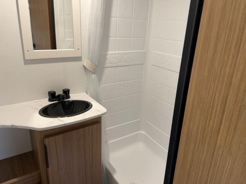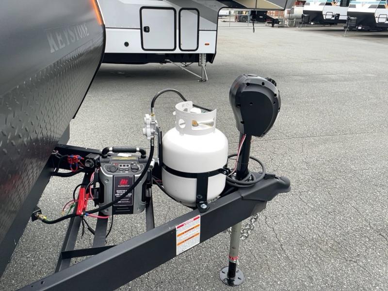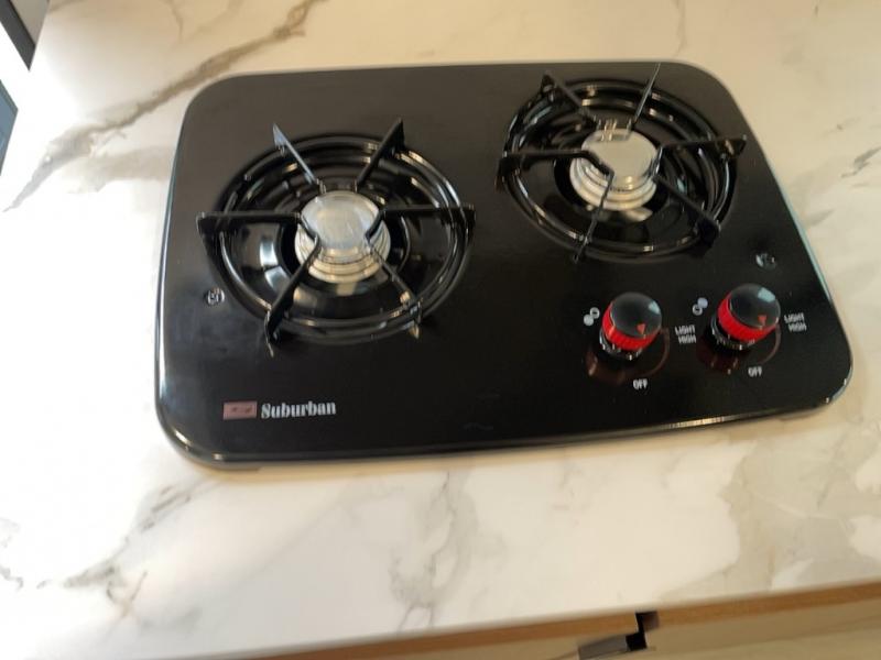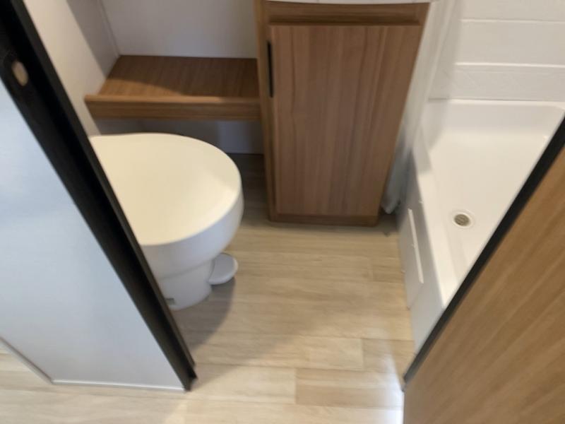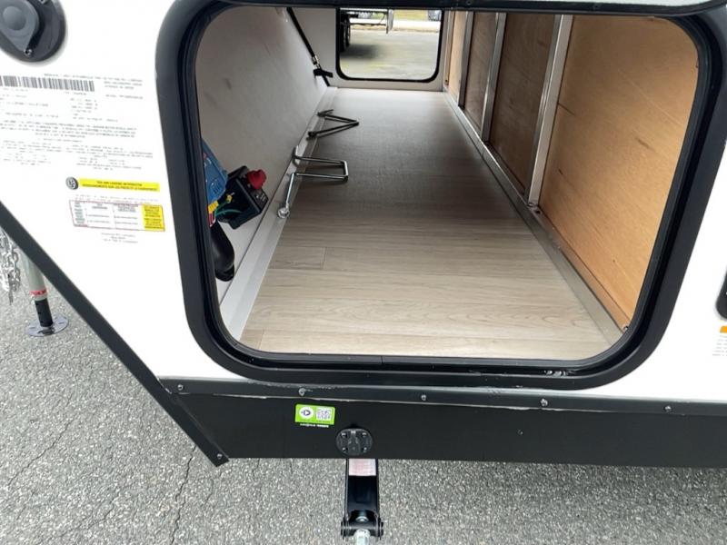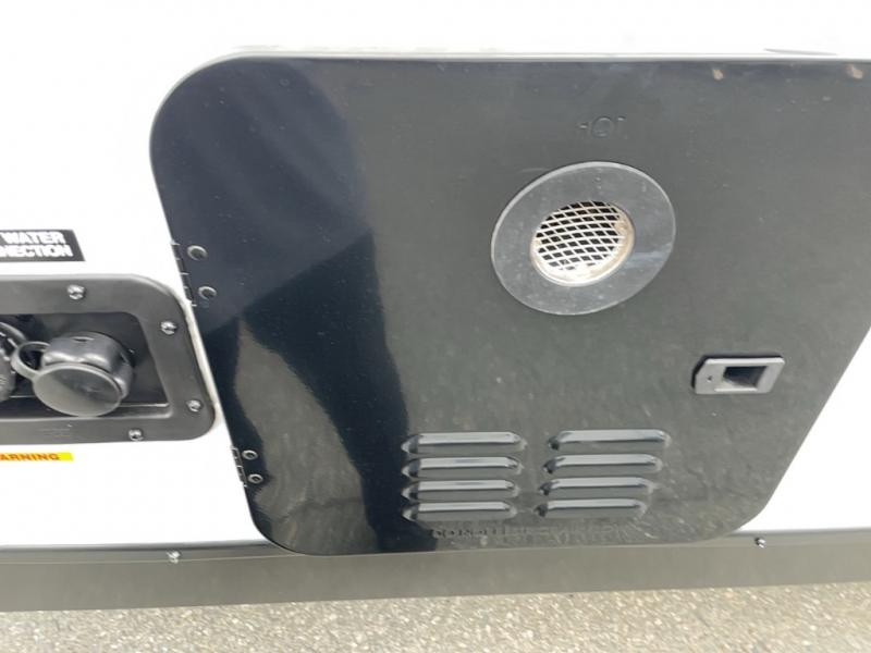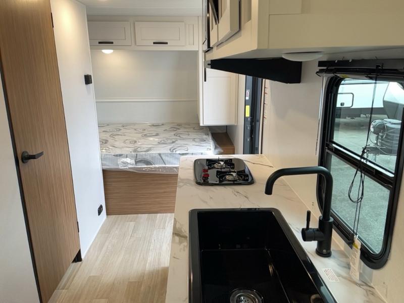 Pack your bags and hitch up this travel trailer for a fun weekend excursion! You can get a good night's sleep on the front queen bed with a wardrobe at the foot of the bed, and overhead cabinets above it for your items. You can also transform the U-shaped dinette with a counter next to it into an extra sleeping space. The chef of your group can make meals on the two burner range or in the microwave if you're on the go. There is also a large double door 12V refrigerator and pantry for food storage. Outside, you can relax underneath the patio awning and store all of your gear in the front exterior pass-through storage area!