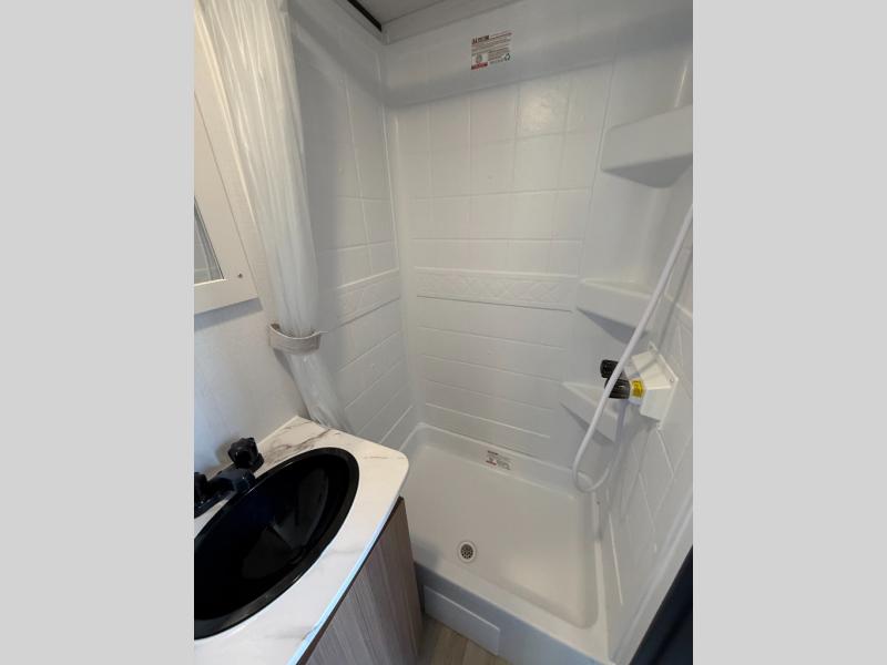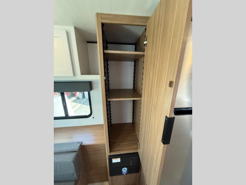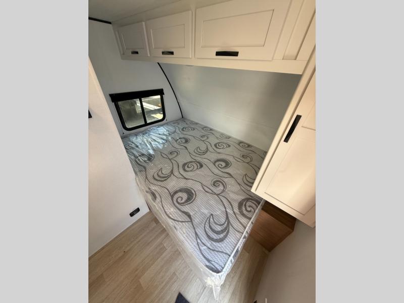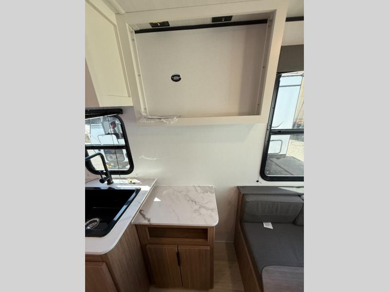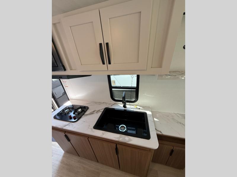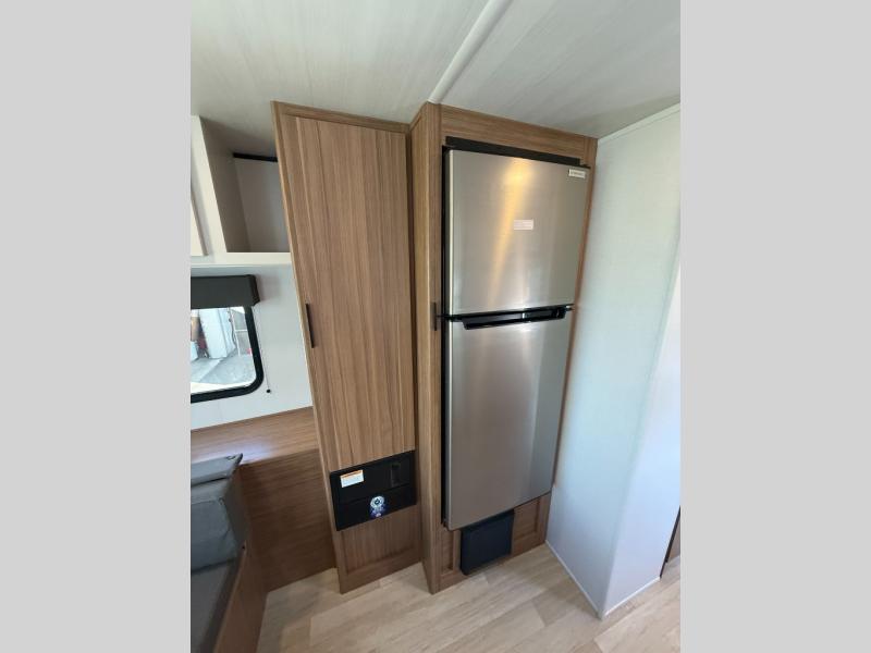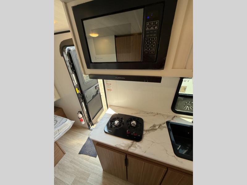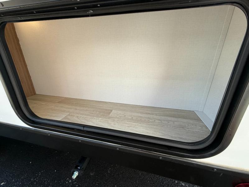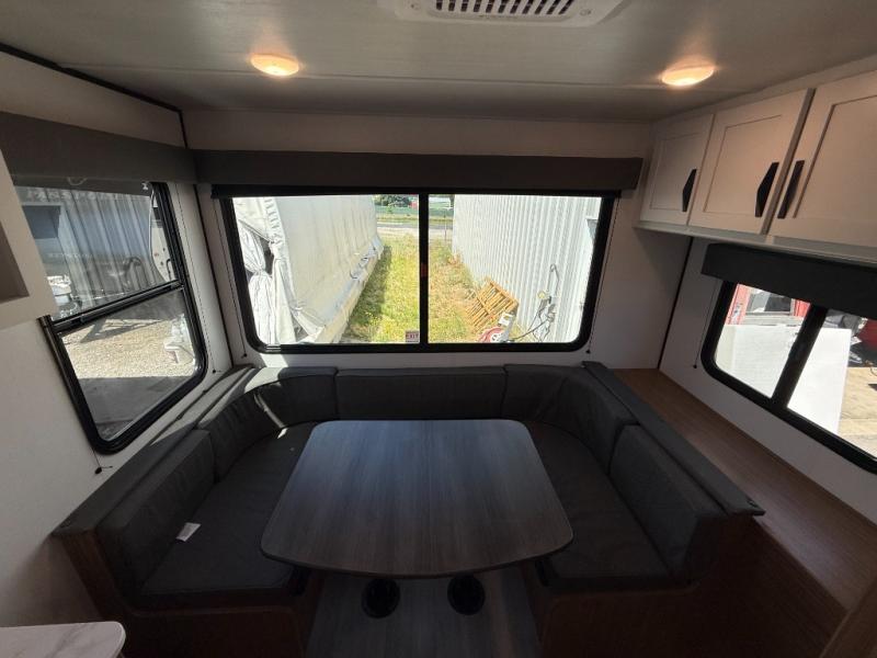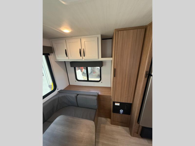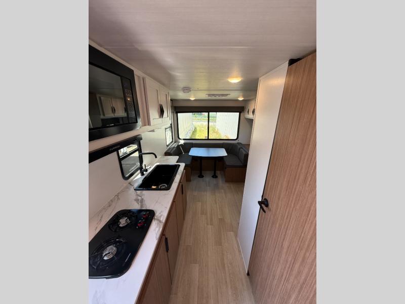 Pack your bags and hitch up this travel trailer for a fun weekend excursion! You can get a good night's sleep on the front queen bed with a wardrobe at the foot of the bed, and overhead cabinets above it for your items. You can also transform the U-shaped dinette with a counter next to it into an extra sleeping space. The chef of your group can make meals on the two burner range or in the microwave if you're on the go. There is also a large double door 12V refrigerator and pantry for food storage. Outside, you can relax underneath the patio awning and store all of your gear in the front exterior pass-through storage area!