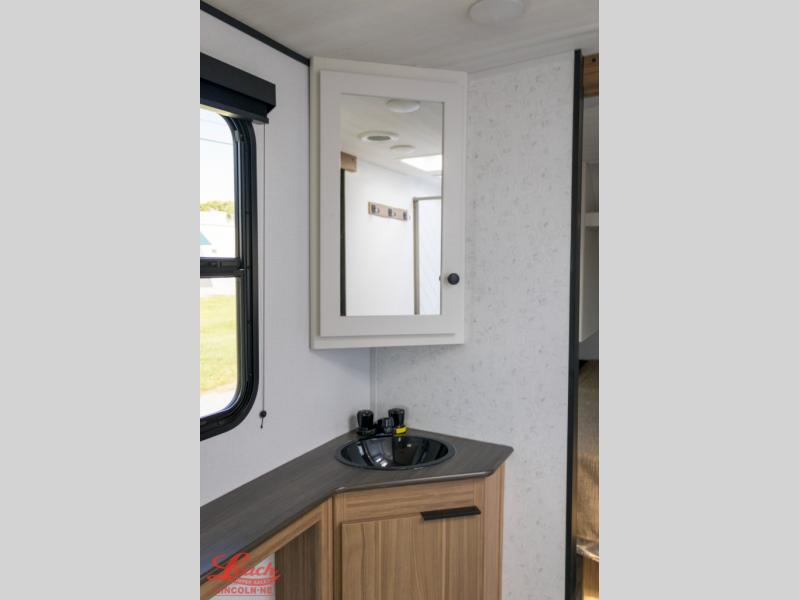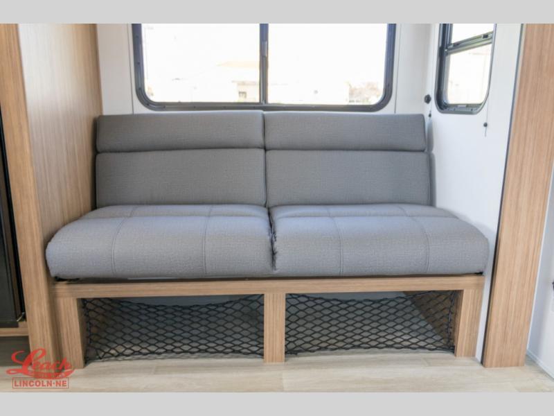 Camping trips in this spacious travel trailer will be trips well spent! With dual entry doors, you can enter in through the front private bedroom or the rear kitchen. Not only will find a walk-around queen bed in the bedroom, but you can also keep your things organized with the dual bedside wardrobes and nightstands. The walk-thru bath leads to the main living area that includes a jack knife sofa slide out and booth dinette. And the chef of your group will love cooking in the rear kitchen with a two burner cooktop, microwave oven, plus a pantry and 12V refrigerator for food storage!