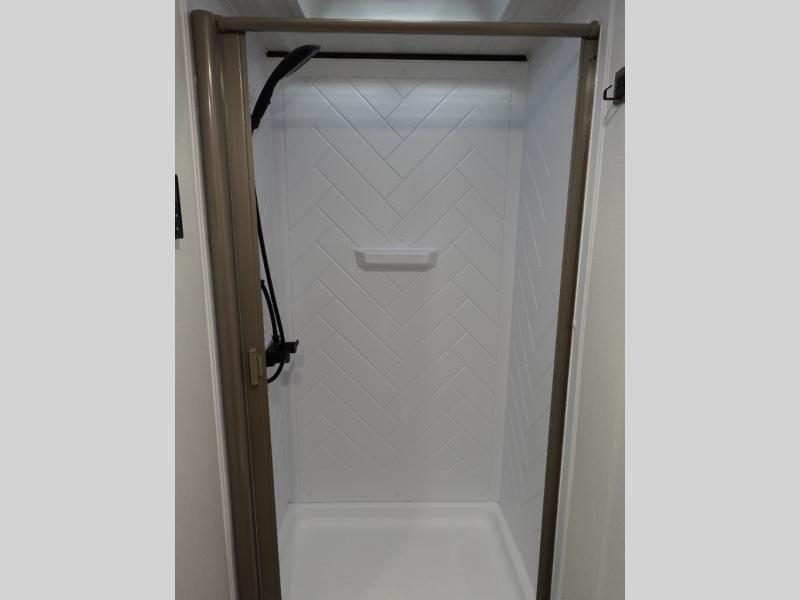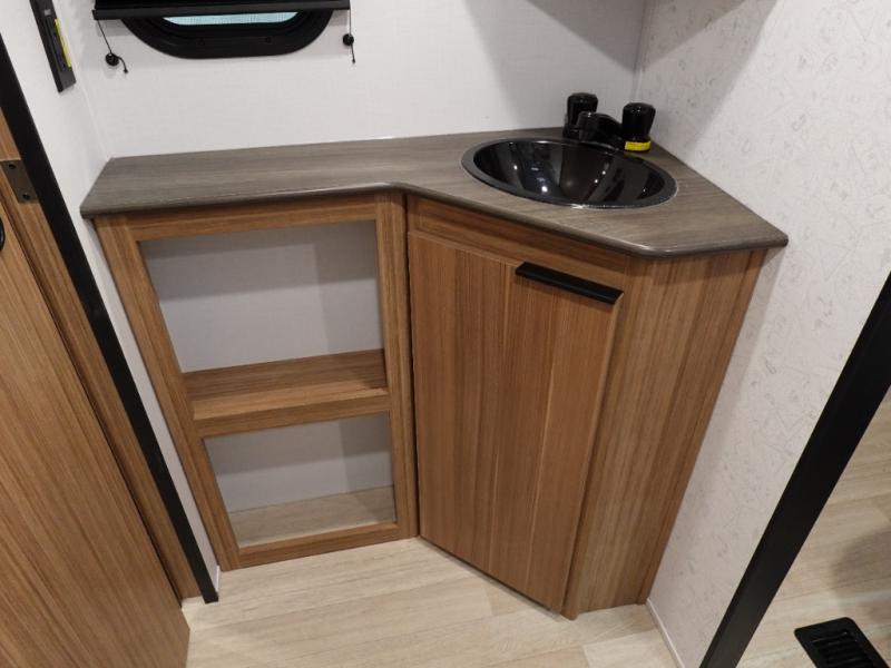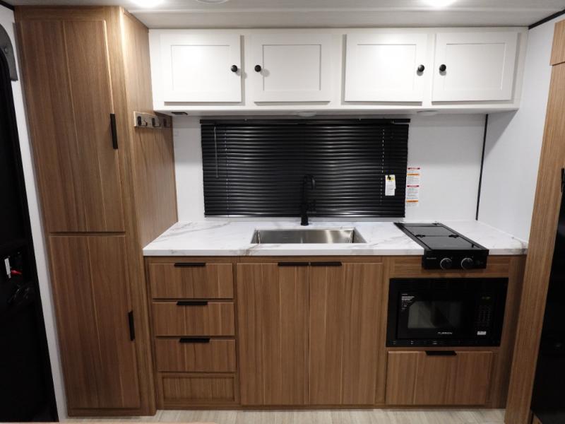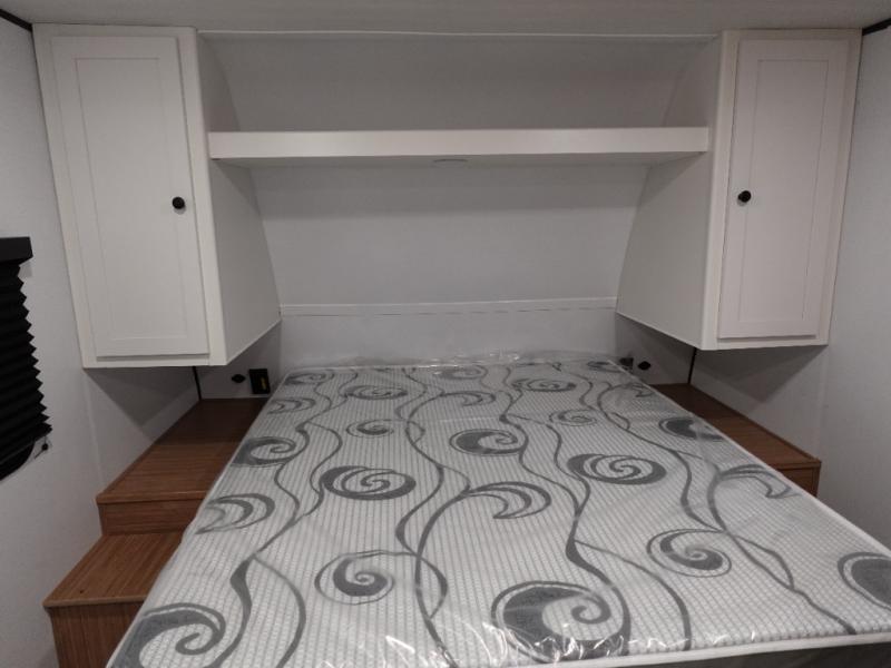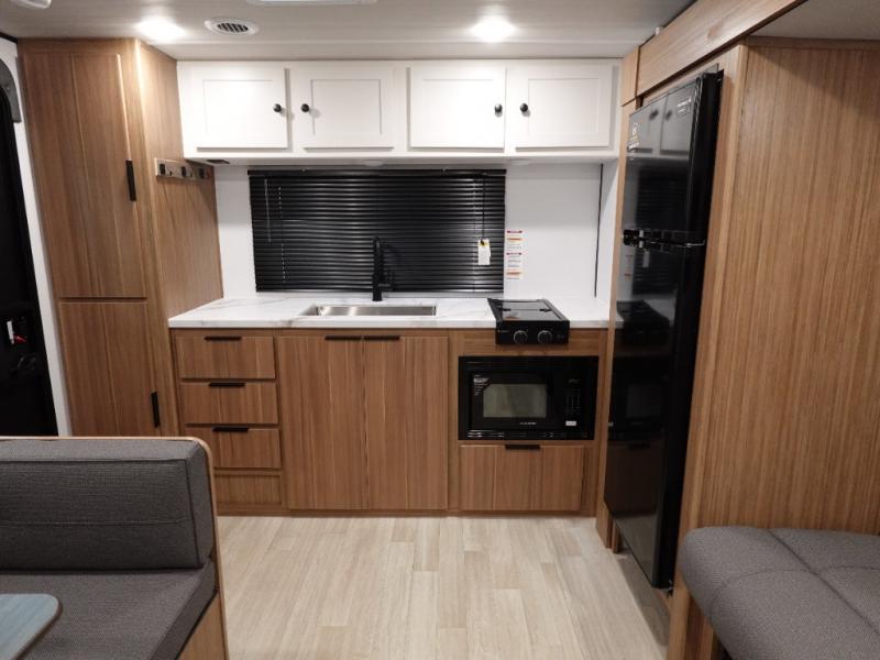 Camping trips in this spacious travel trailer will be trips well spent! With dual entry doors, you can enter in through the front private bedroom or the rear kitchen. Not only will find a walk-around queen bed in the bedroom, but you can also keep your things organized with the dual bedside wardrobes and nightstands. The walk-thru bath leads to the main living area that includes a jack knife sofa slide out and booth dinette. And the chef of your group will love cooking in the rear kitchen with a two burner cooktop, microwave oven, plus a pantry and 12V refrigerator for food storage!