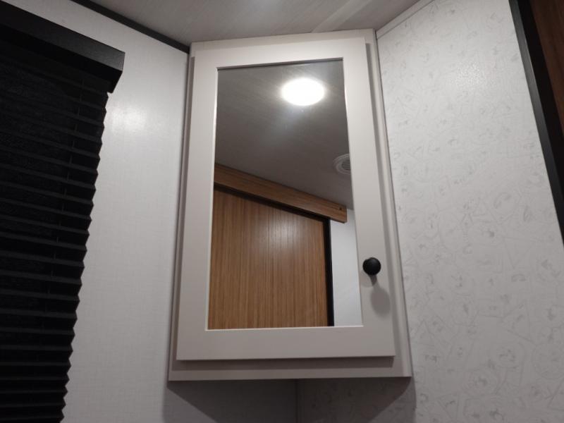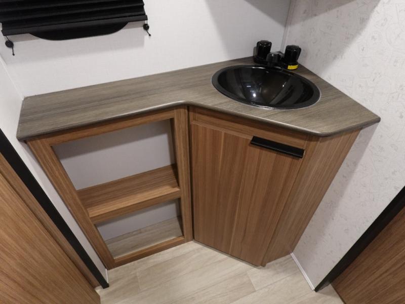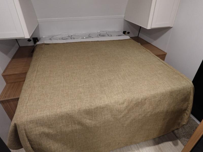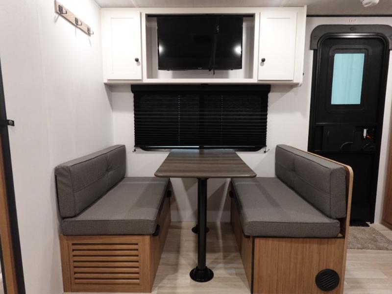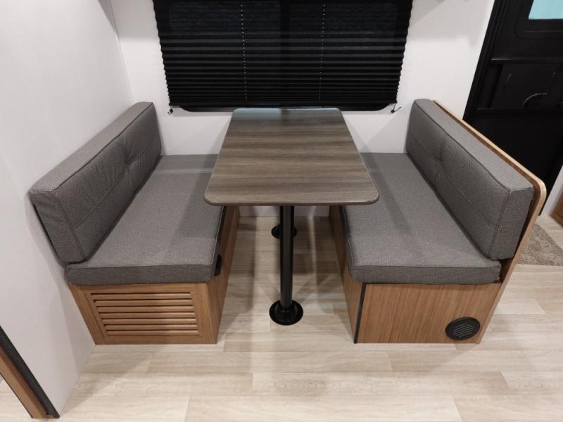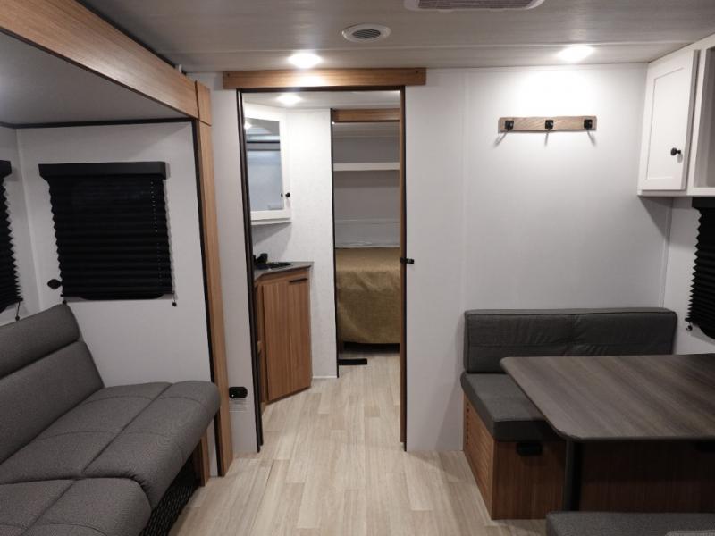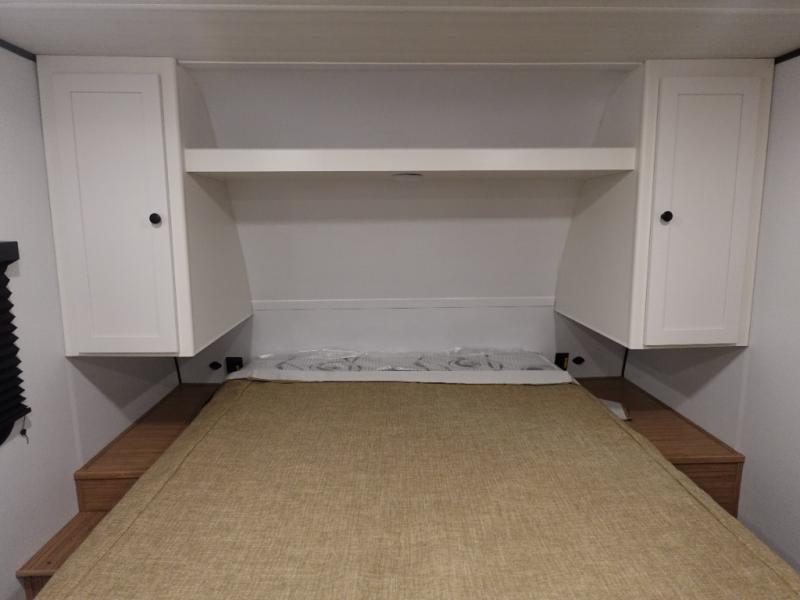 Camping trips in this spacious travel trailer will be trips well spent! With dual entry doors, you can enter in through the front private bedroom or the rear kitchen. Not only will find a walk-around queen bed in the bedroom, but you can also keep your things organized with the dual bedside wardrobes and nightstands. The walk-thru bath leads to the main living area that includes a jack knife sofa slide out and booth dinette. And the chef of your group will love cooking in the rear kitchen with a two burner cooktop, microwave oven, plus a pantry and 12V refrigerator for food storage!