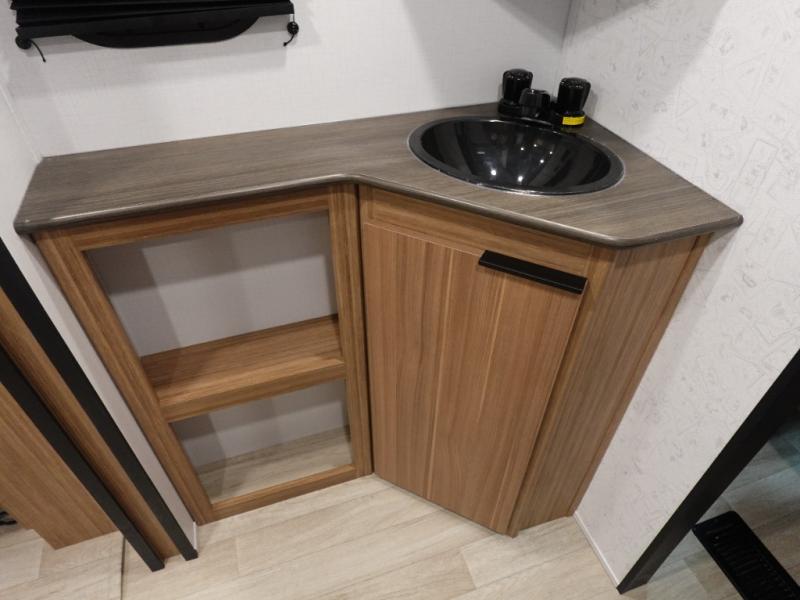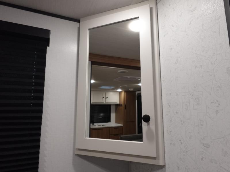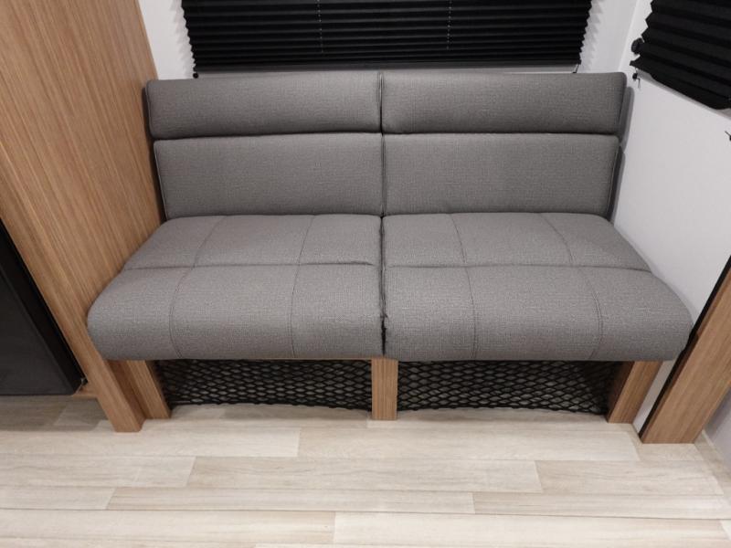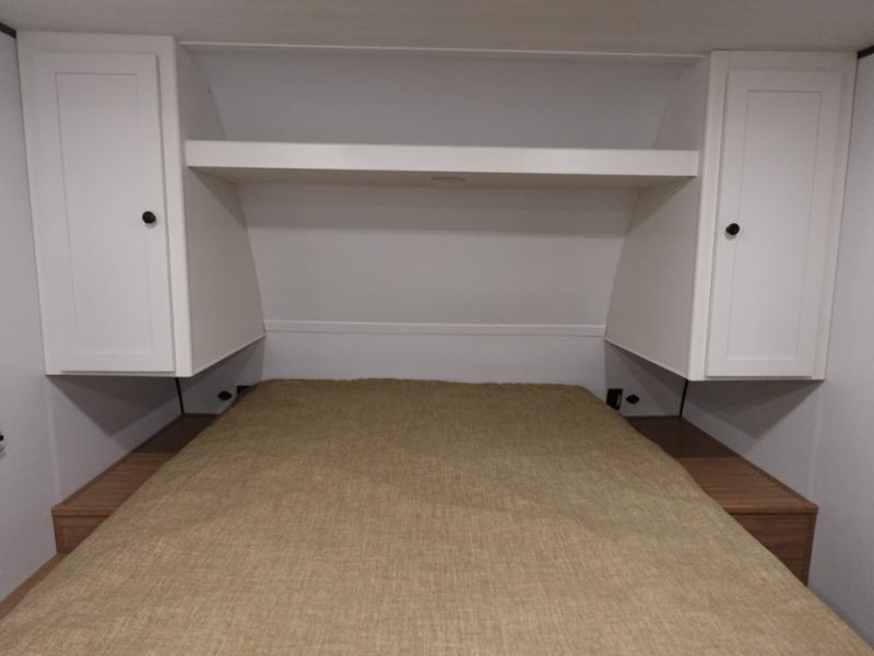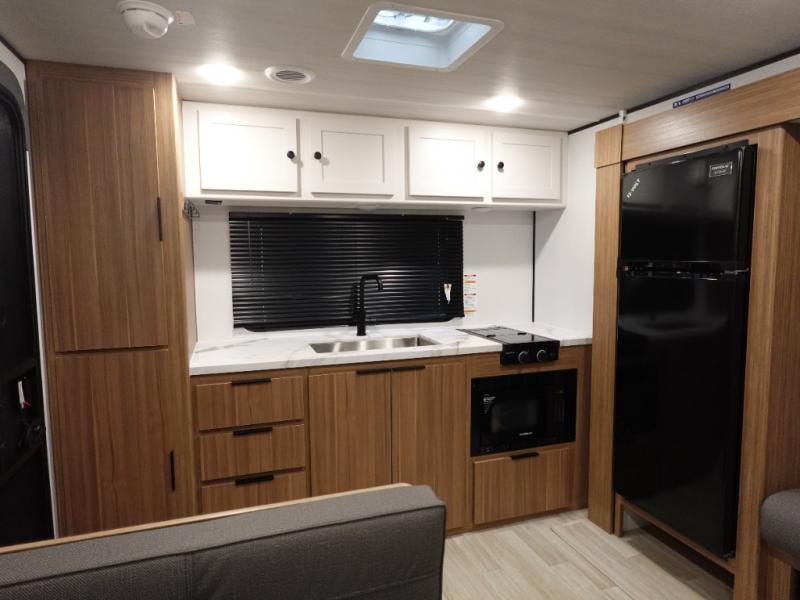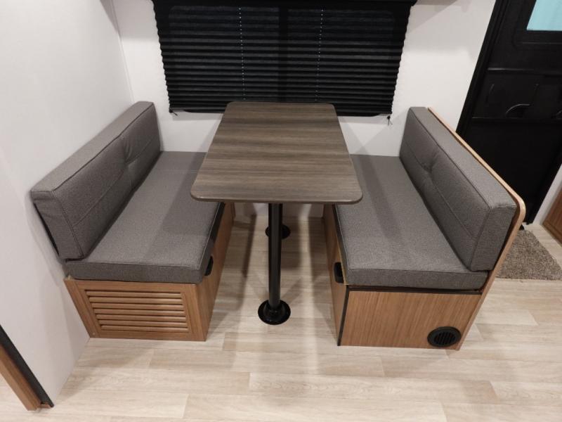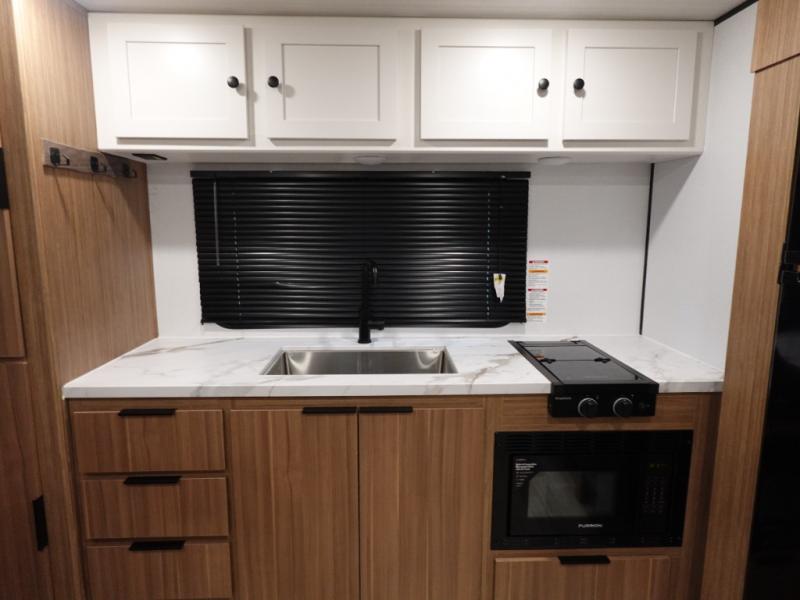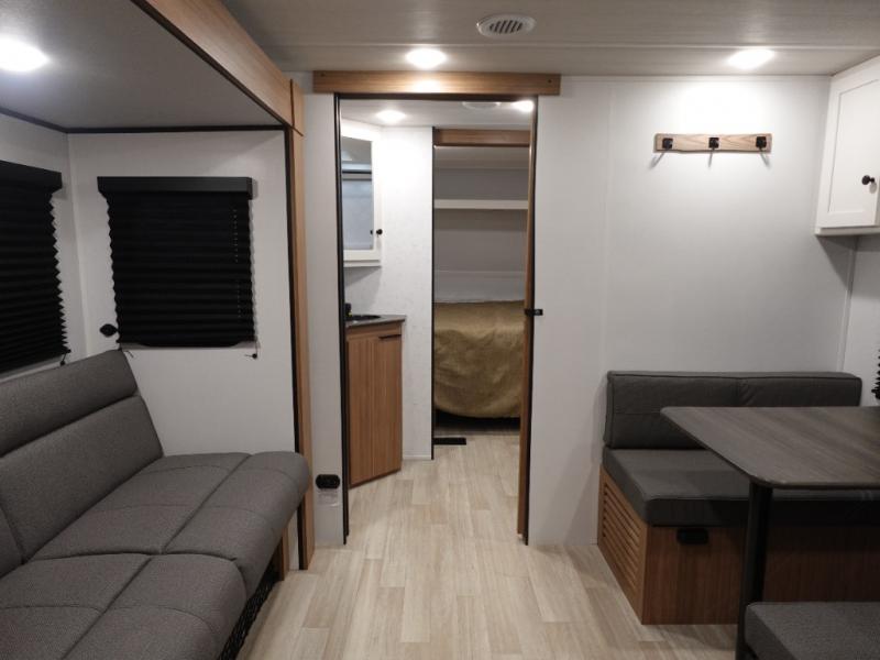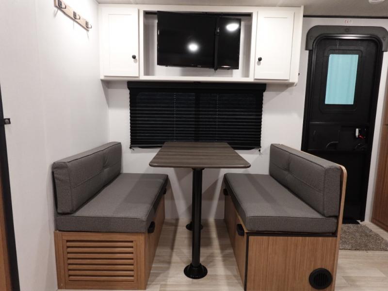 Camping trips in this spacious travel trailer will be trips well spent! With dual entry doors, you can enter in through the front private bedroom or the rear kitchen. Not only will find a walk-around queen bed in the bedroom, but you can also keep your things organized with the dual bedside wardrobes and nightstands. The walk-thru bath leads to the main living area that includes a jack knife sofa slide out and booth dinette. And the chef of your group will love cooking in the rear kitchen with a two burner cooktop, microwave oven, plus a pantry and 12V refrigerator for food storage!