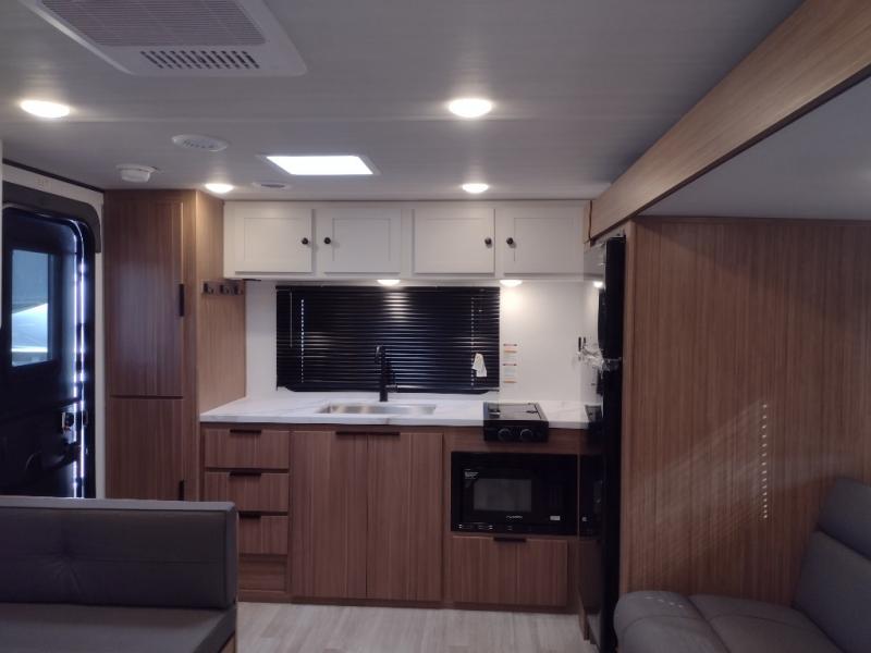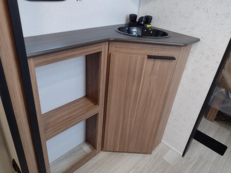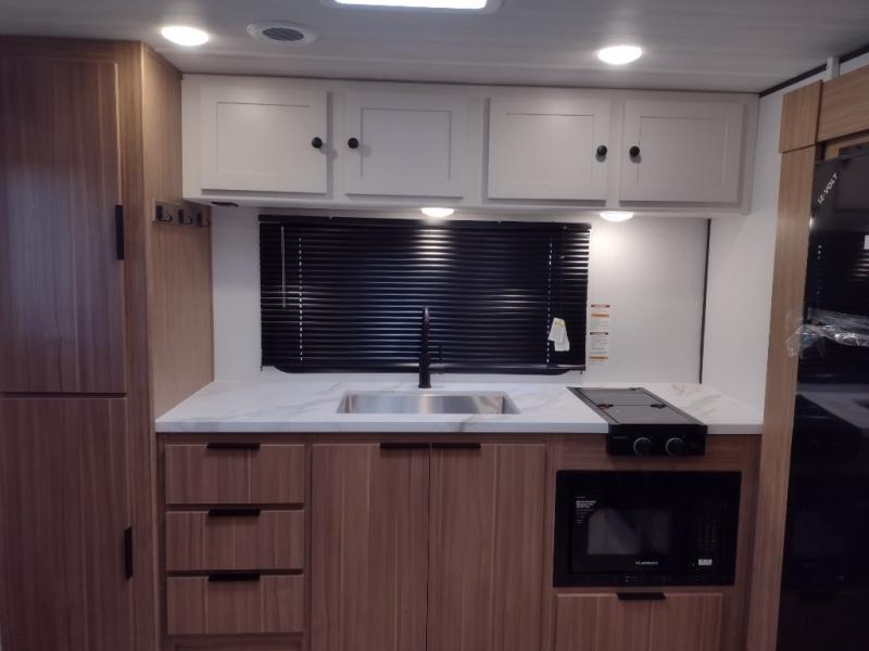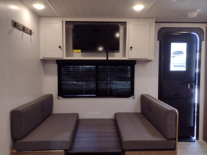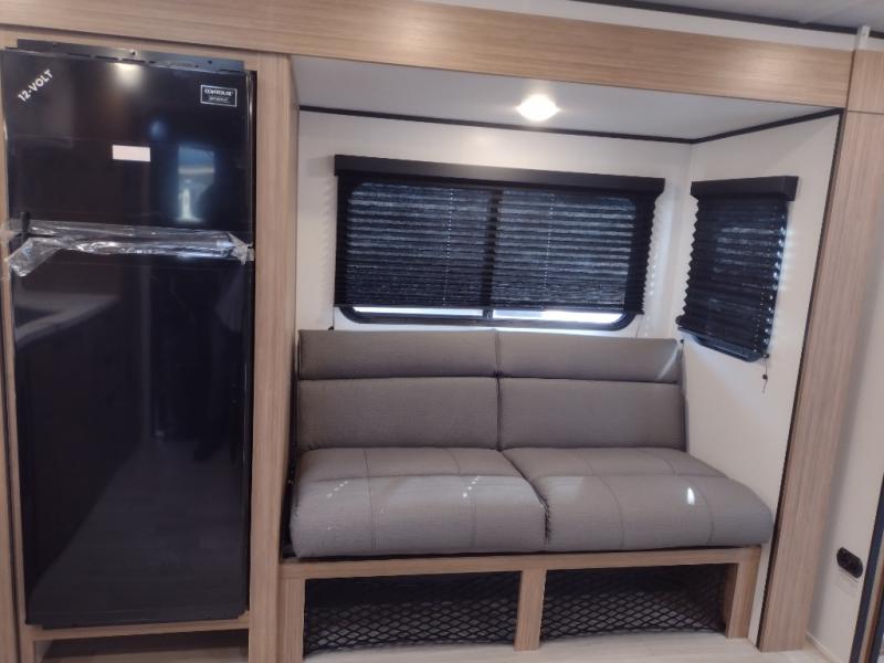 Camping trips in this spacious travel trailer will be trips well spent! With dual entry doors, you can enter in through the front private bedroom or the rear kitchen. Not only will find a walk-around queen bed in the bedroom, but you can also keep your things organized with the dual bedside wardrobes and nightstands. The walk-thru bath leads to the main living area that includes a jack knife sofa slide out and booth dinette. And the chef of your group will love cooking in the rear kitchen with a two burner cooktop, microwave oven, plus a pantry and 12V refrigerator for food storage!