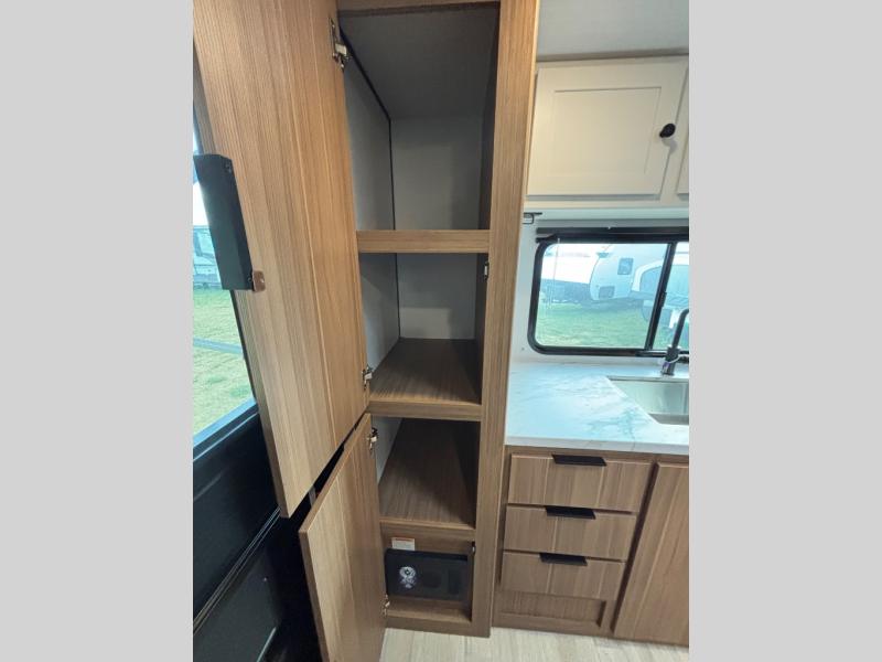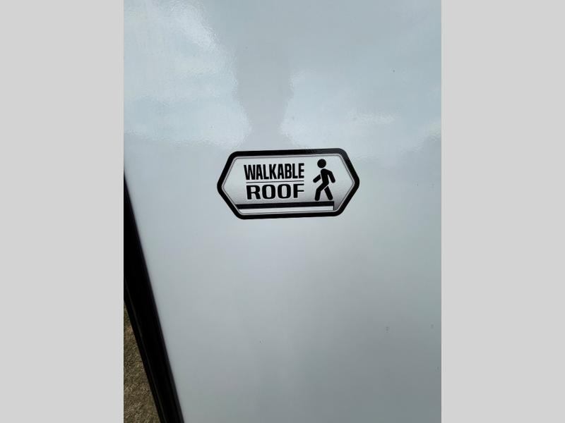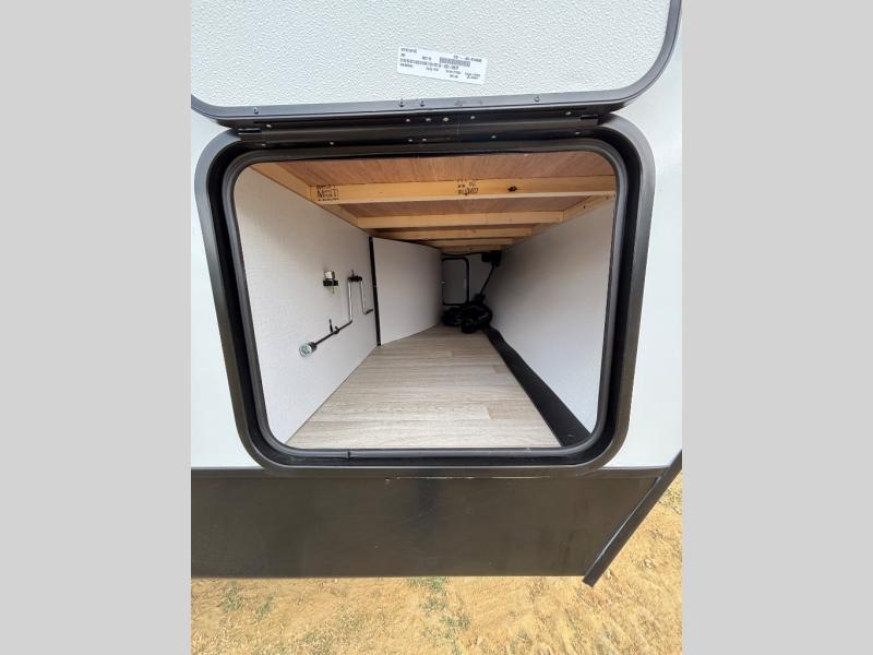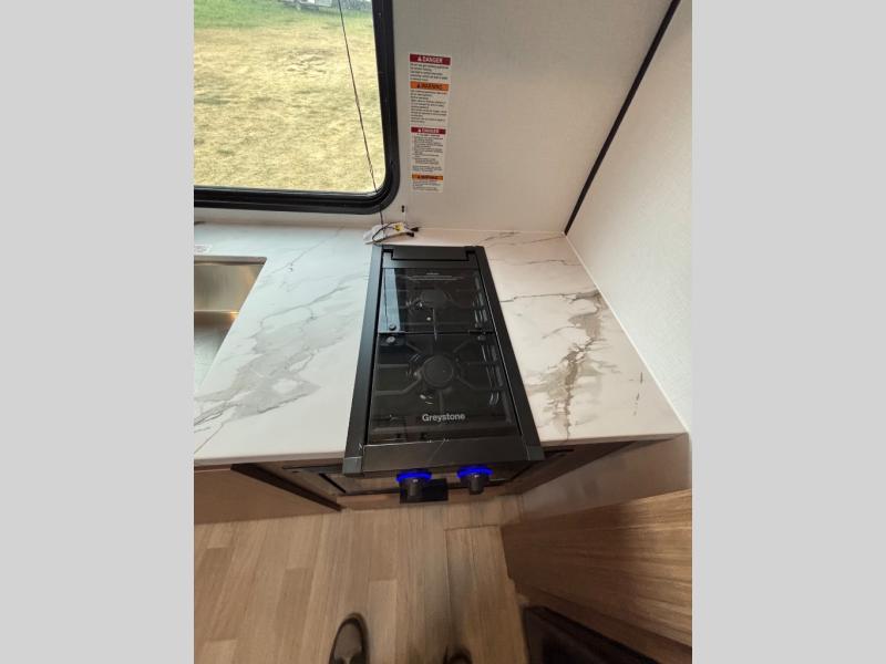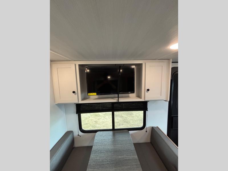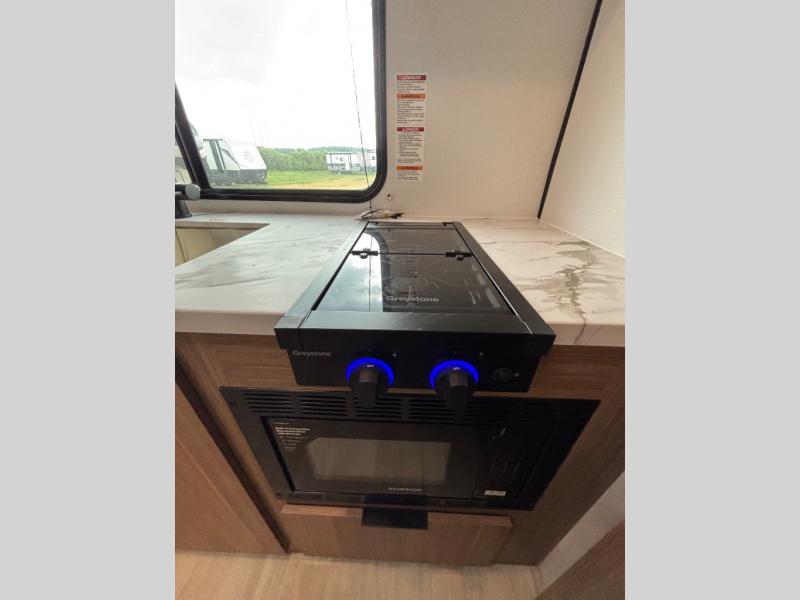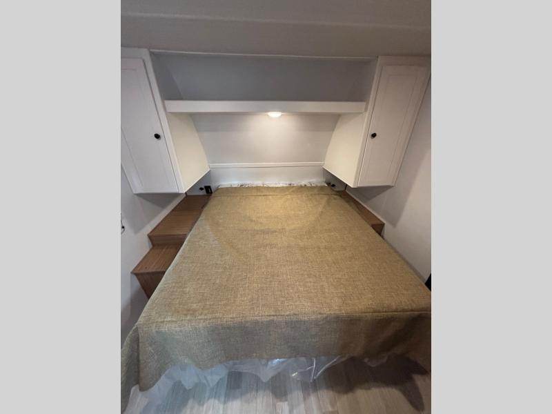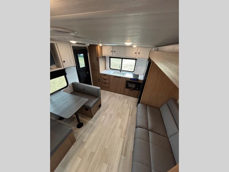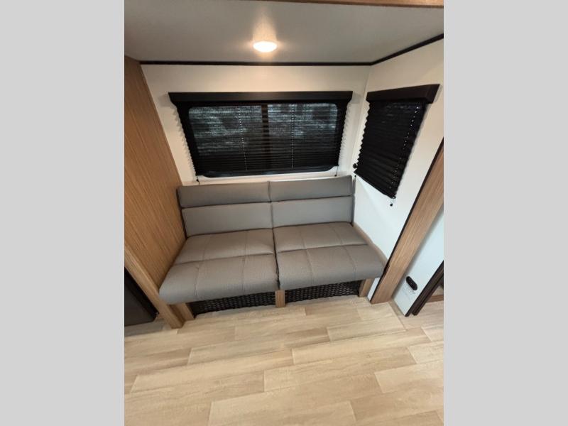 Camping trips in this spacious travel trailer will be trips well spent! With dual entry doors, you can enter in through the front private bedroom or the rear kitchen. Not only will find a walk-around queen bed in the bedroom, but you can also keep your things organized with the dual bedside wardrobes and nightstands. The walk-thru bath leads to the main living area that includes a jack knife sofa slide out and booth dinette. And the chef of your group will love cooking in the rear kitchen with a two burner cooktop, microwave oven, plus a pantry and 12V refrigerator for food storage!
