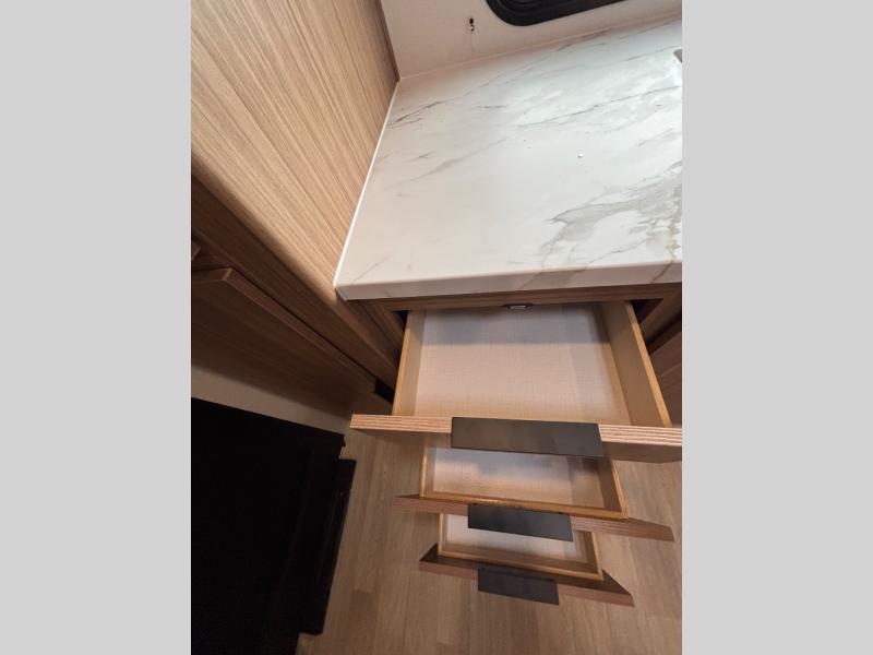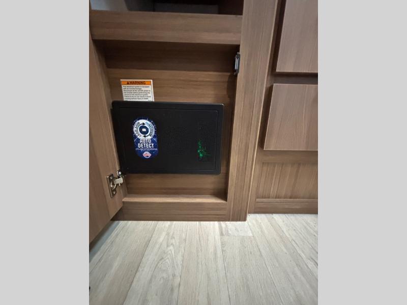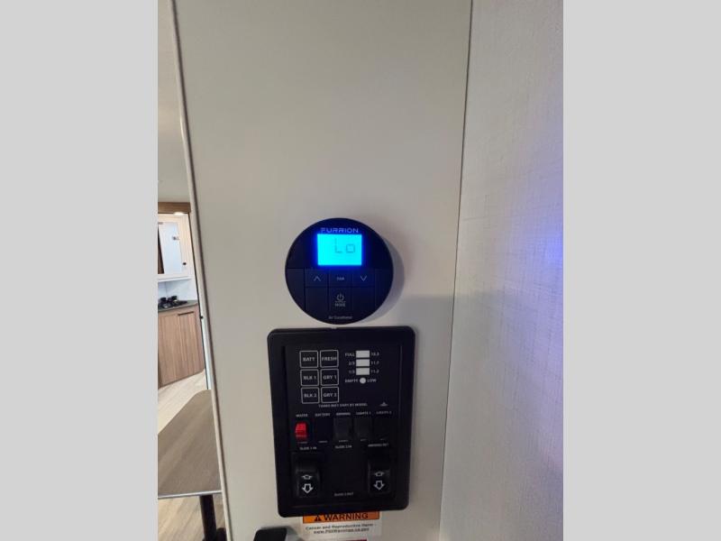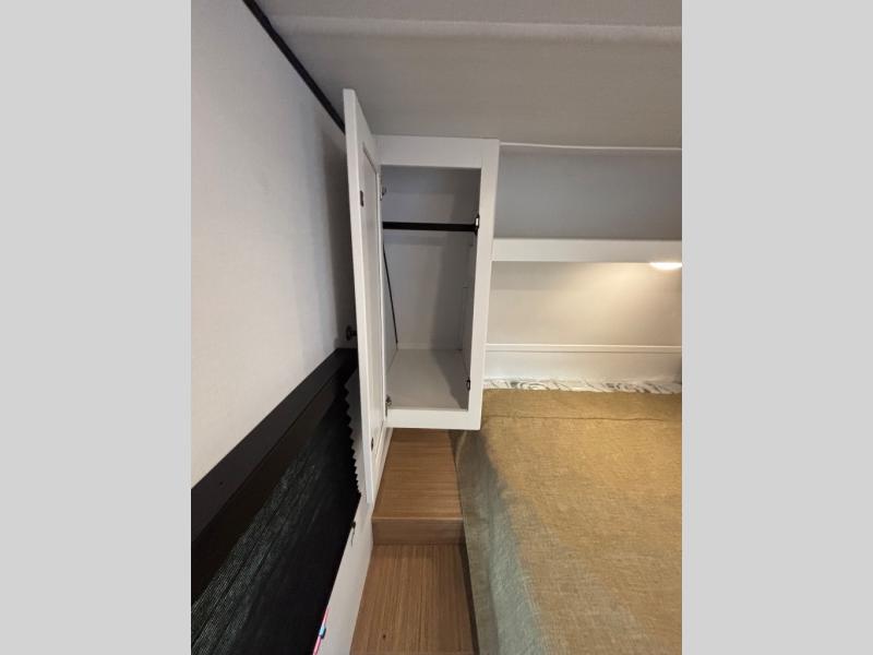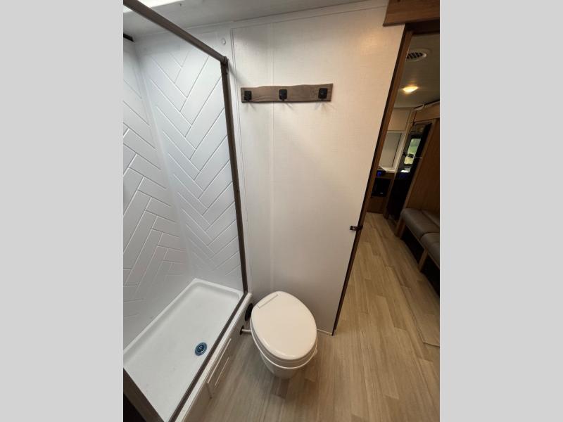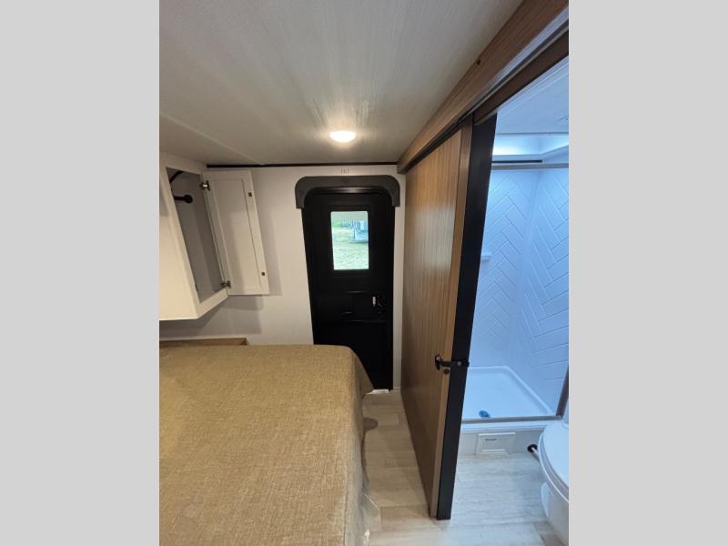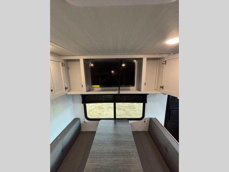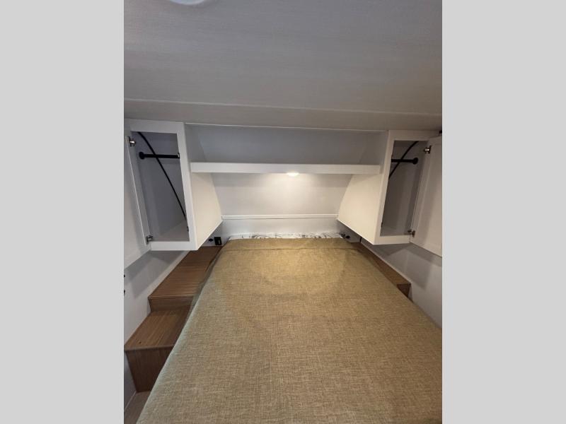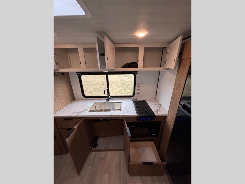 Camping trips in this spacious travel trailer will be trips well spent! With dual entry doors, you can enter in through the front private bedroom or the rear kitchen. Not only will find a walk-around queen bed in the bedroom, but you can also keep your things organized with the dual bedside wardrobes and nightstands. The walk-thru bath leads to the main living area that includes a jack knife sofa slide out and booth dinette. And the chef of your group will love cooking in the rear kitchen with a two burner cooktop, microwave oven, plus a pantry and 12V refrigerator for food storage!