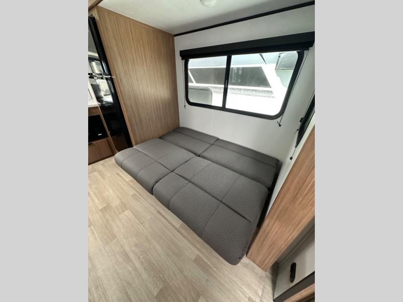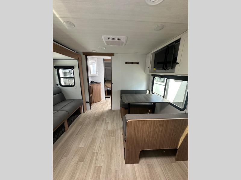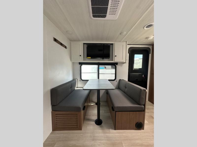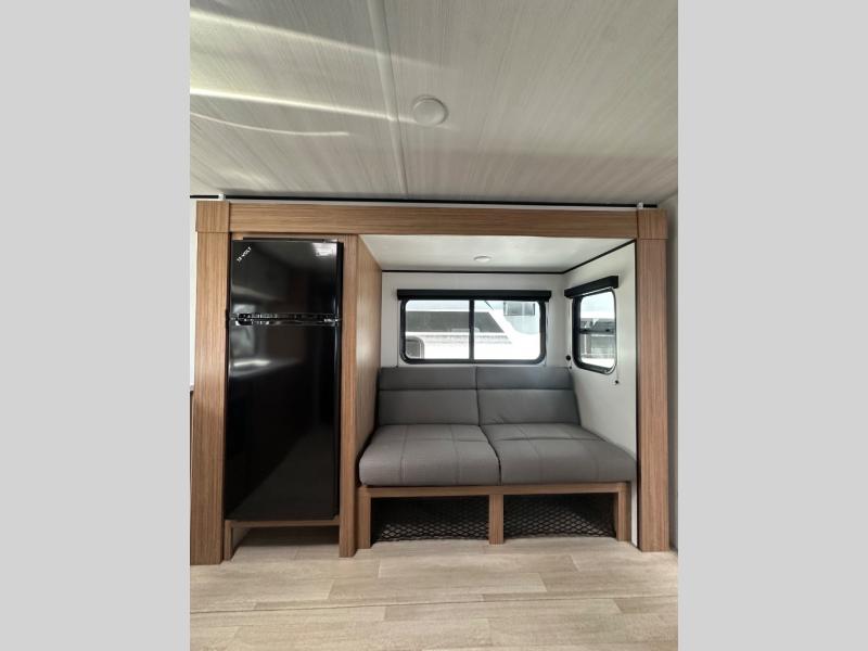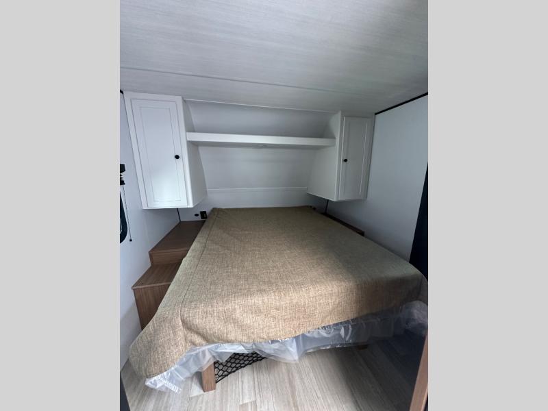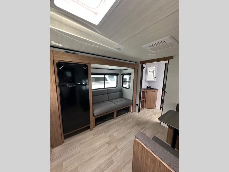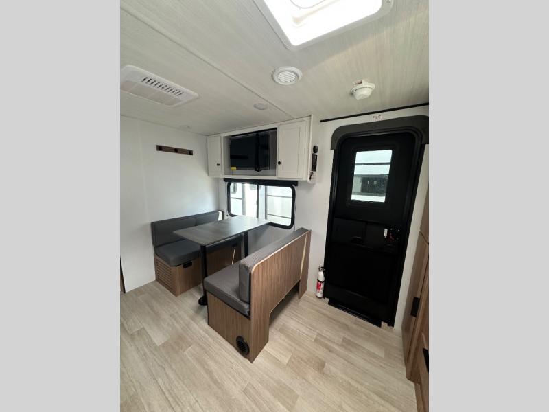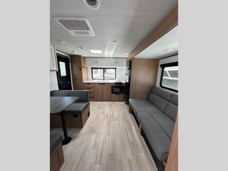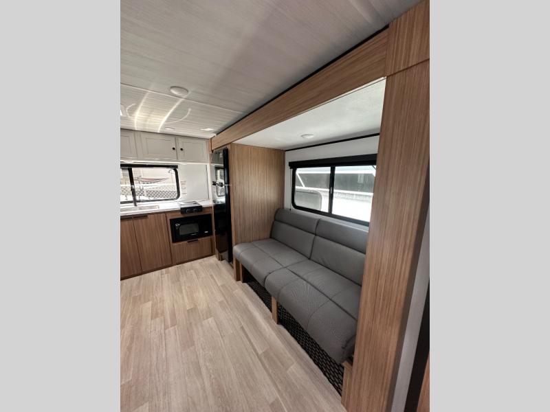 Camping trips in this spacious travel trailer will be trips well spent! With dual entry doors, you can enter in through the front private bedroom or the rear kitchen. Not only will find a walk-around queen bed in the bedroom, but you can also keep your things organized with the dual bedside wardrobes and nightstands. The walk-thru bath leads to the main living area that includes a jack knife sofa slide out and booth dinette. And the chef of your group will love cooking in the rear kitchen with a two burner cooktop, microwave oven, plus a pantry and 12V refrigerator for food storage!