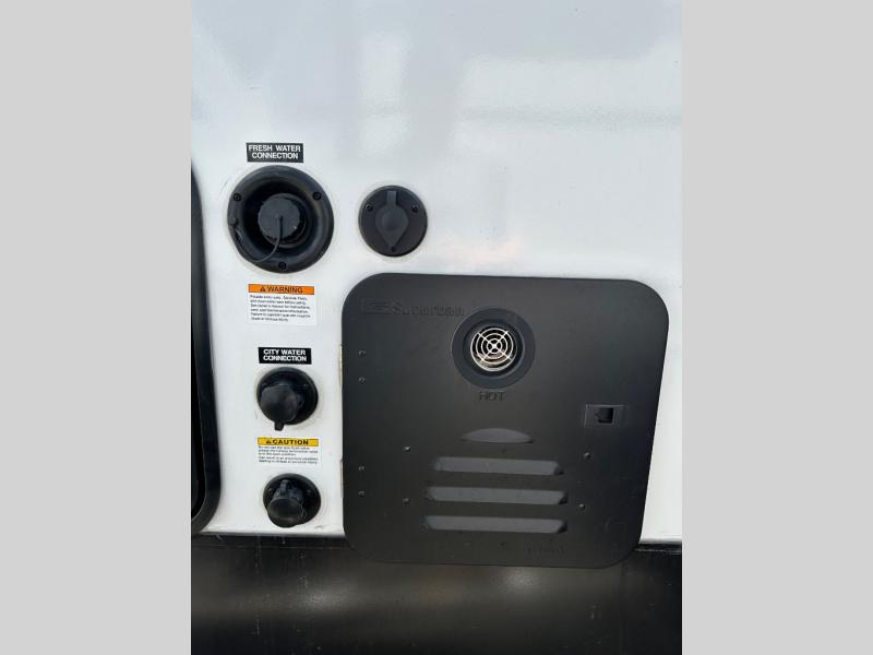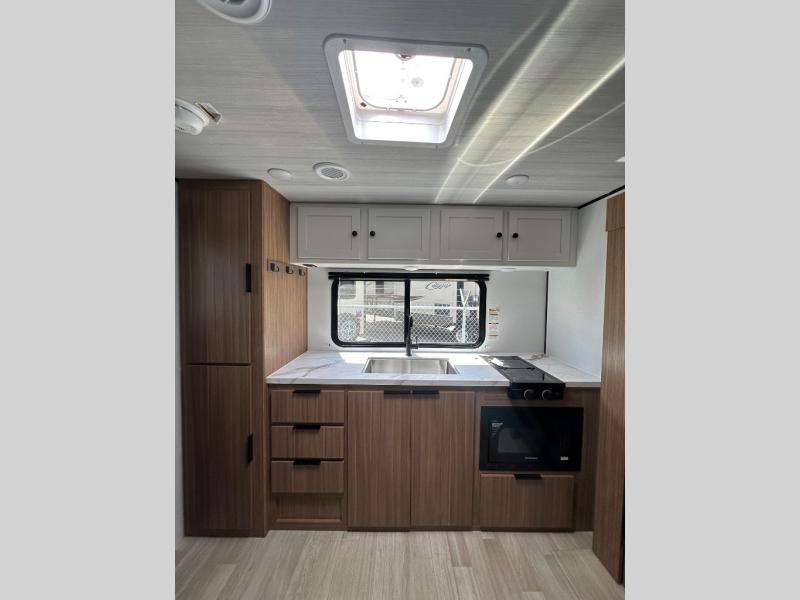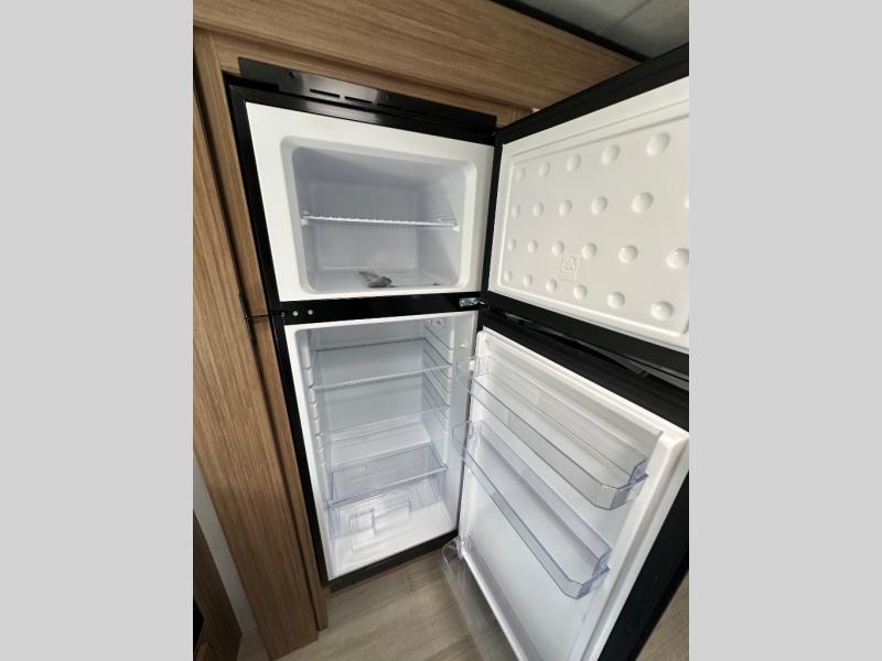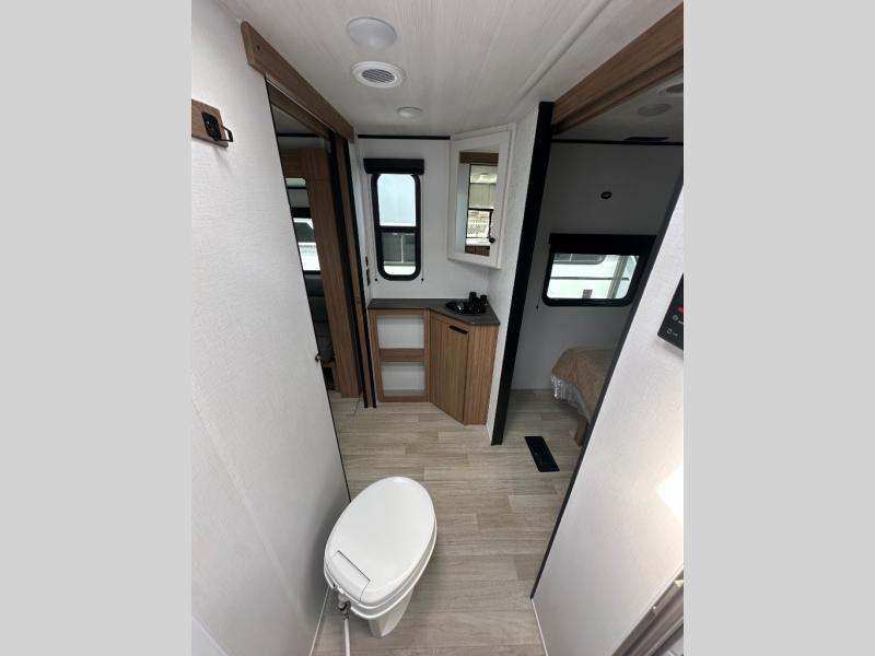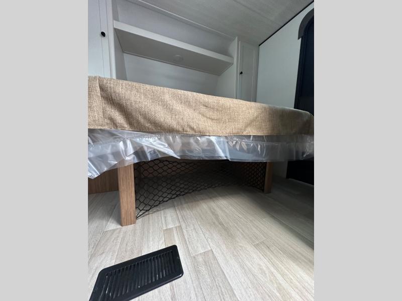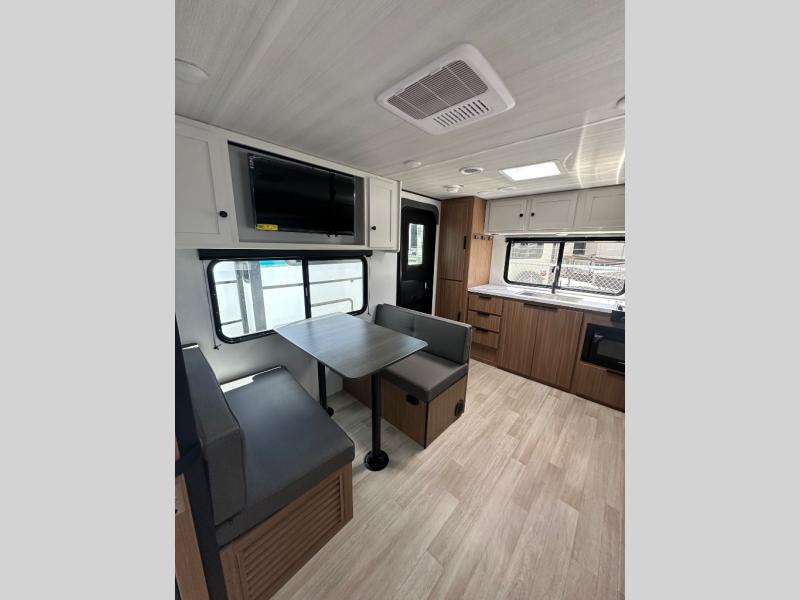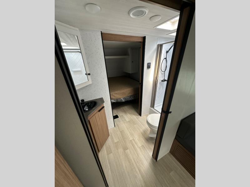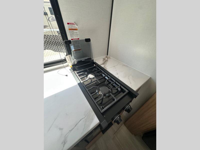 Camping trips in this spacious travel trailer will be trips well spent! With dual entry doors, you can enter in through the front private bedroom or the rear kitchen. Not only will find a walk-around queen bed in the bedroom, but you can also keep your things organized with the dual bedside wardrobes and nightstands. The walk-thru bath leads to the main living area that includes a jack knife sofa slide out and booth dinette. And the chef of your group will love cooking in the rear kitchen with a two burner cooktop, microwave oven, plus a pantry and 12V refrigerator for food storage!