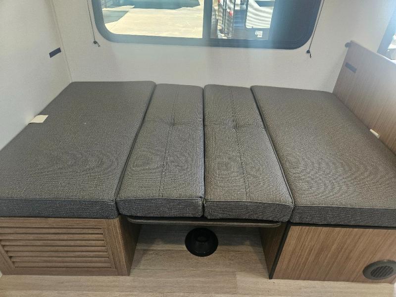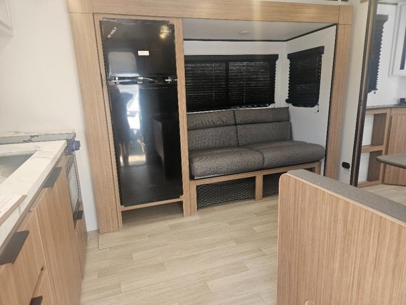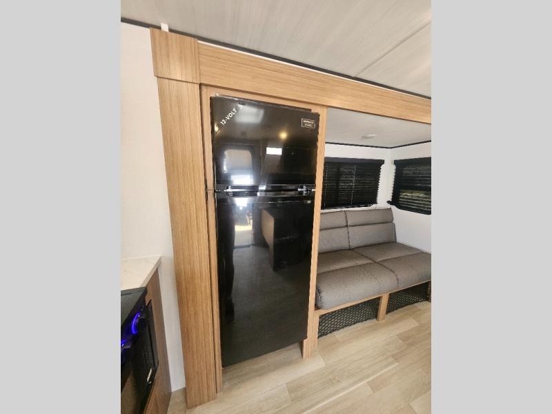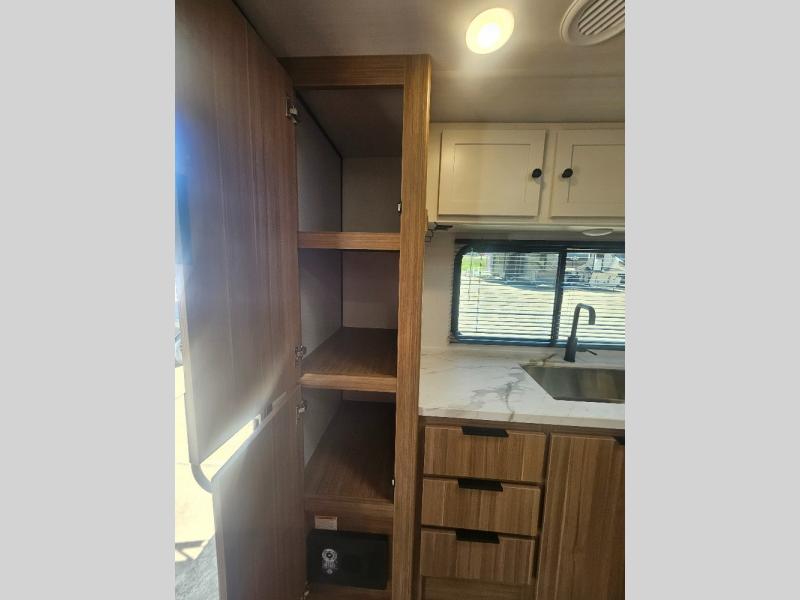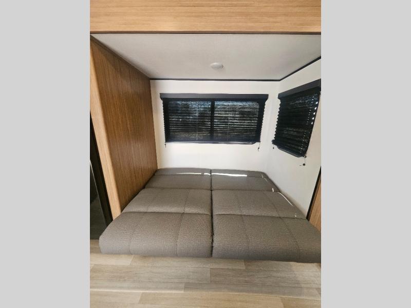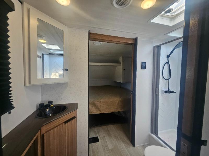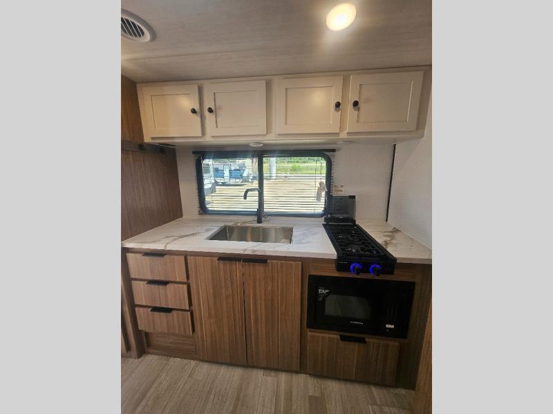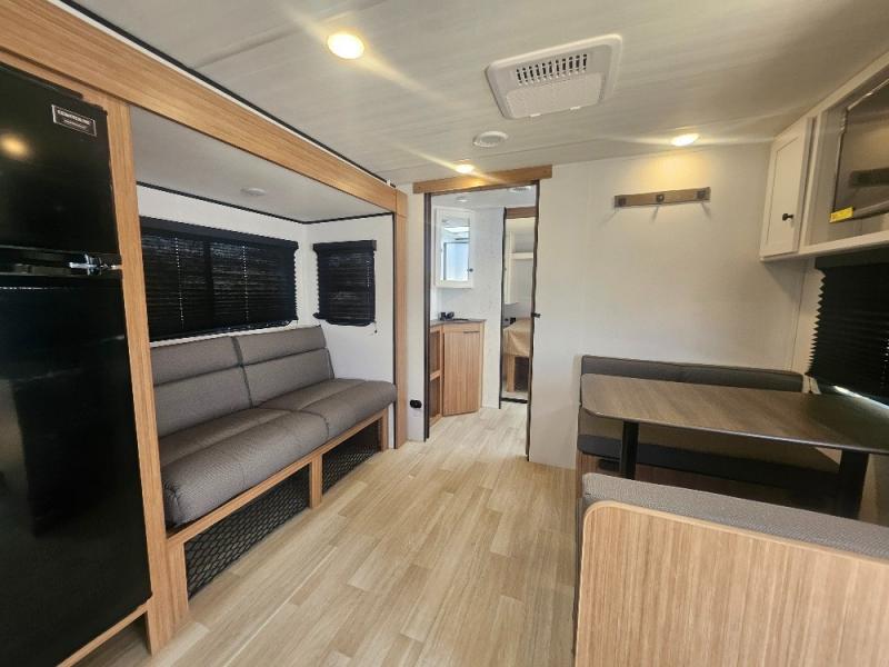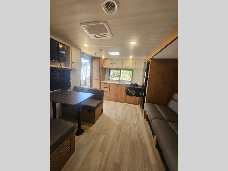Camping trips in this spacious travel trailer will be trips well spent! With dual entry doors, you can enter in through the front private bedroom or the rear kitchen. Not only will find a walk-around queen bed in the bedroom, but you can also keep your things organized with the dual bedside wardrobes and nightstands. The walk-thru bath leads to the main living area that includes a jack knife sofa slide out and booth dinette. And the chef of your group will love cooking in the rear kitchen with a two burner cooktop, microwave oven, plus a pantry and 12V refrigerator for food storage!