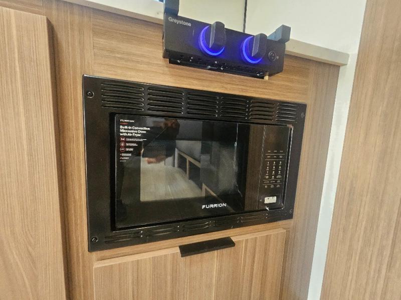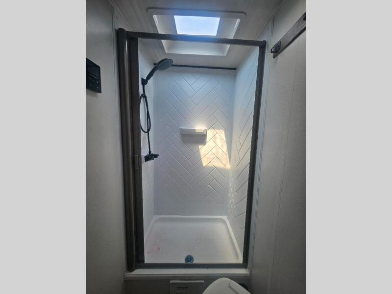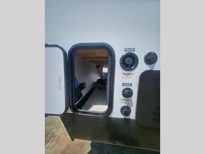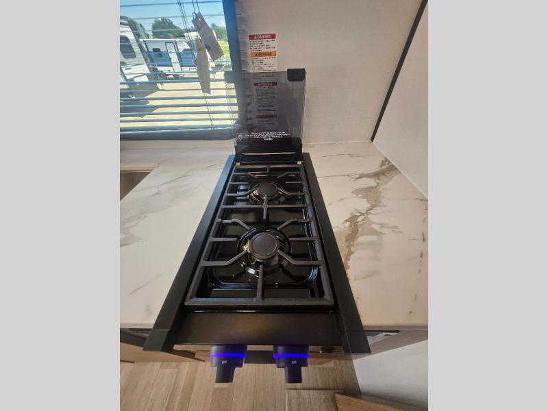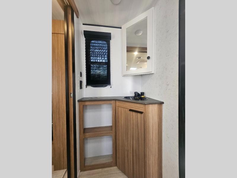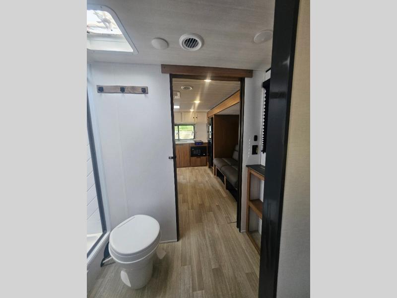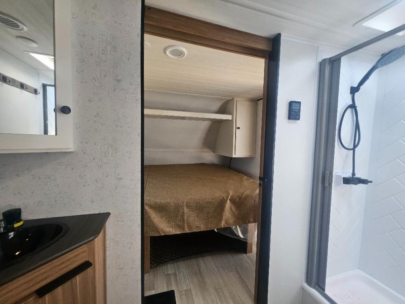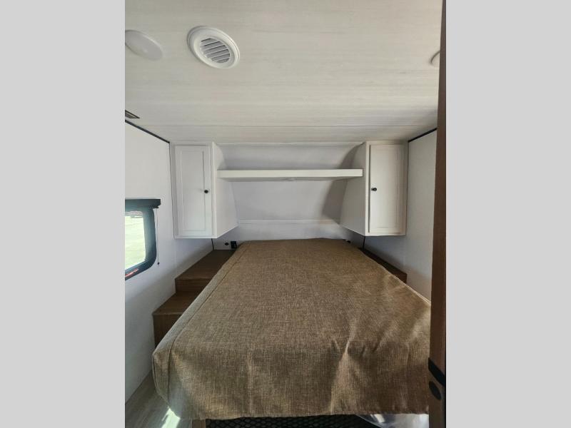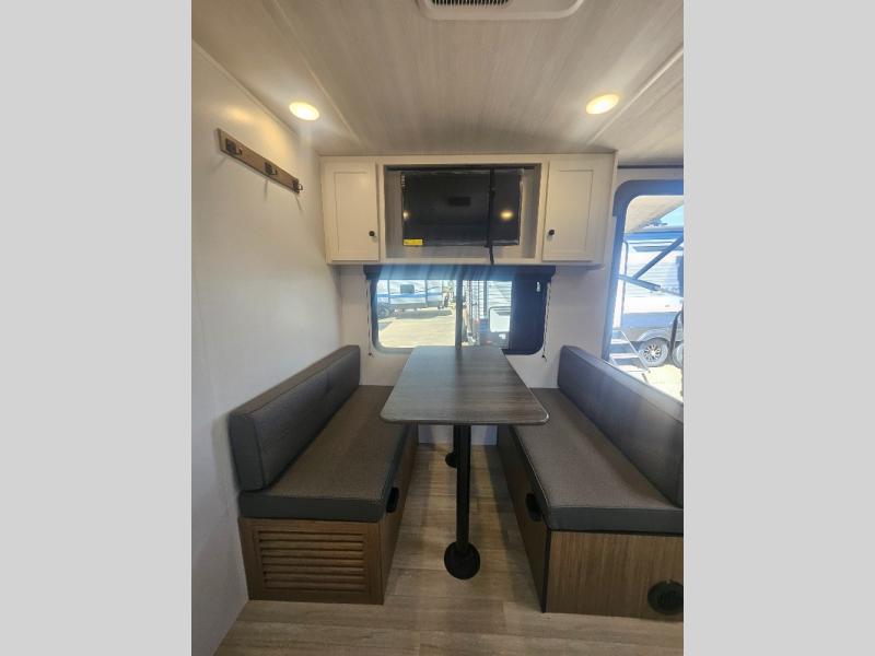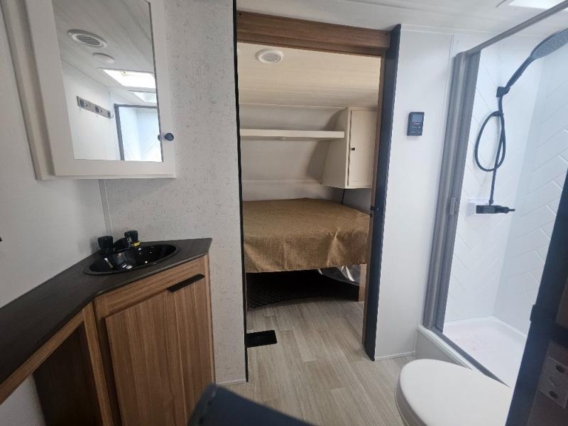 Camping trips in this spacious travel trailer will be trips well spent! With dual entry doors, you can enter in through the front private bedroom or the rear kitchen. Not only will find a walk-around queen bed in the bedroom, but you can also keep your things organized with the dual bedside wardrobes and nightstands. The walk-thru bath leads to the main living area that includes a jack knife sofa slide out and booth dinette. And the chef of your group will love cooking in the rear kitchen with a two burner cooktop, microwave oven, plus a pantry and 12V refrigerator for food storage!