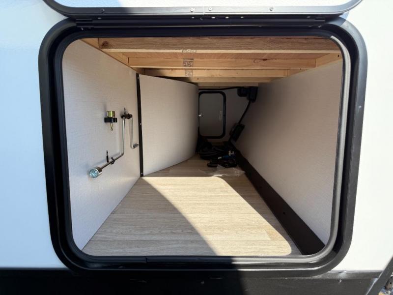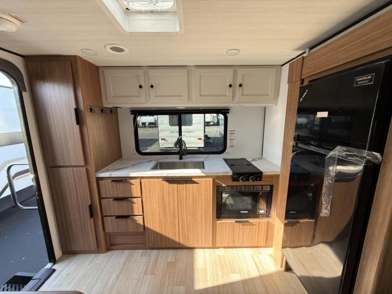 Camping trips in this spacious travel trailer will be trips well spent! With dual entry doors, you can enter in through the front private bedroom or the rear kitchen. Not only will find a walk-around queen bed in the bedroom, but you can also keep your things organized with the dual bedside wardrobes and nightstands. The walk-thru bath leads to the main living area that includes a jack knife sofa slide out and booth dinette. And the chef of your group will love cooking in the rear kitchen with a two burner cooktop, microwave oven, plus a pantry and 12V refrigerator for food storage!