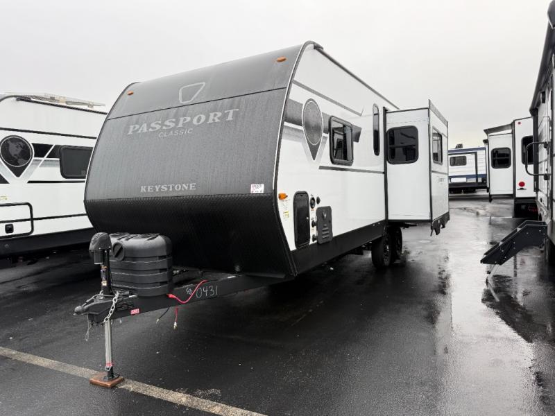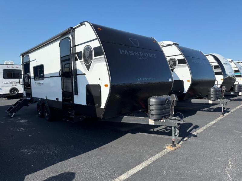 Comfort is found all throughout each one of these Keystone RV Passport Classic travel trailers! They are built with a one-piece polypropylene underbelly to protect your unit's vitals, and a seamless, laminated and gel-coated filon exterior that is sure to turn heads at the campsite. A fully walkable roof makes it easy to access when needed, and the leaf spring straight axles help provide smooth towing. The residential durable Beauflor vinyl flooring throughout and the seamless kitchen countertops will be easy to clean, and you can stay cool on a hot summer day with the A/C unit. Come find the Passport Classic that fits your needs best!