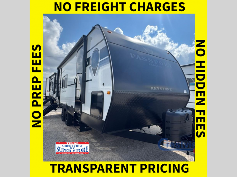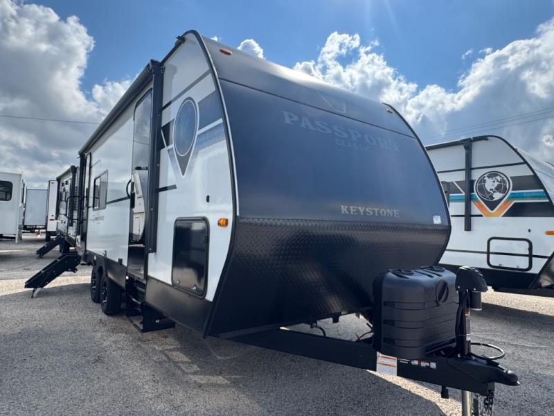 Comfort is found all throughout each one of these Keystone RV Passport Classic travel trailers! They are built with a one-piece polypropylene underbelly to protect your unit's vitals, and a seamless, laminated and gel-coated filon exterior that is sure to turn heads at the campsite. A fully walkable roof makes it easy to access when needed, and the leaf spring straight axles help provide smooth towing. The residential durable Beauflor vinyl flooring throughout and the seamless kitchen countertops will be easy to clean, and you can stay cool on a hot summer day with the A/C unit. Come find the Passport Classic that fits your needs best!