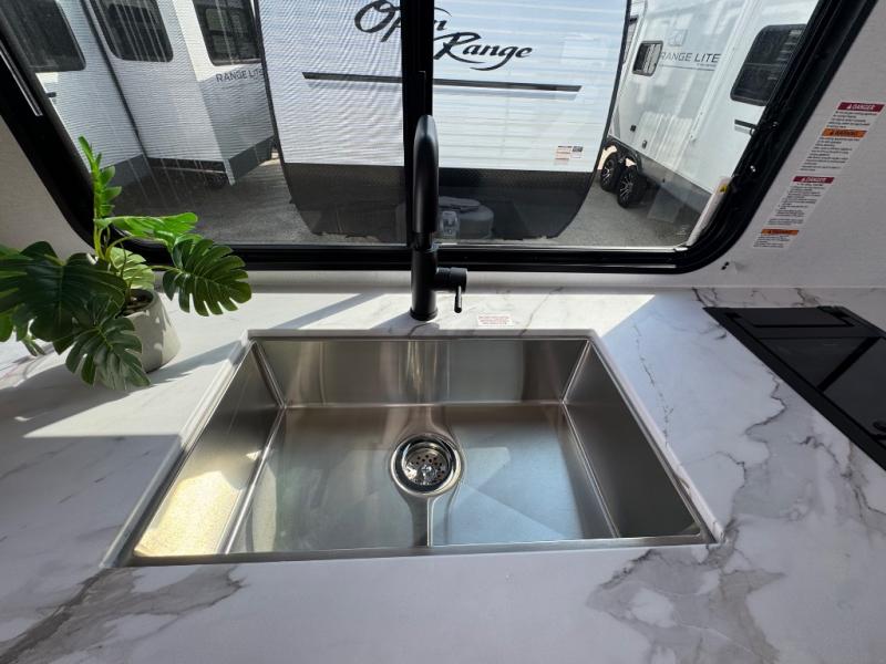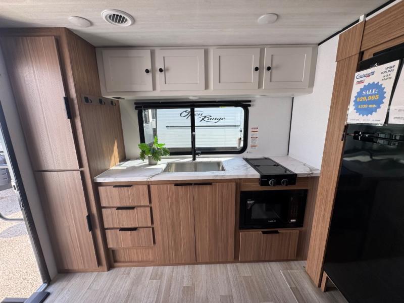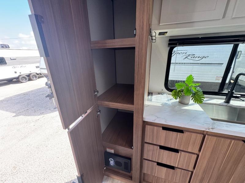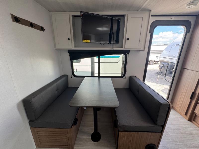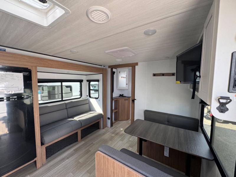 Camping trips in this spacious travel trailer will be trips well spent! With dual entry doors, you can enter in through the front private bedroom or the rear kitchen. Not only will find a walk-around queen bed in the bedroom, but you can also keep your things organized with the dual bedside wardrobes and nightstands. The walk-thru bath leads to the main living area that includes a jack knife sofa slide out and booth dinette. And the chef of your group will love cooking in the rear kitchen with a two burner cooktop, microwave oven, plus a pantry and 12V refrigerator for food storage!