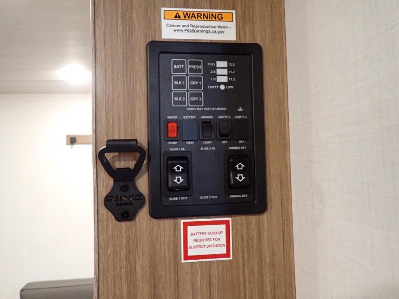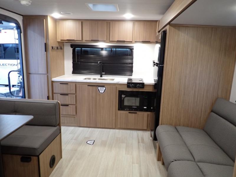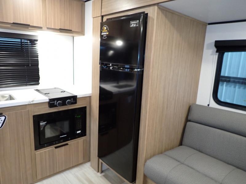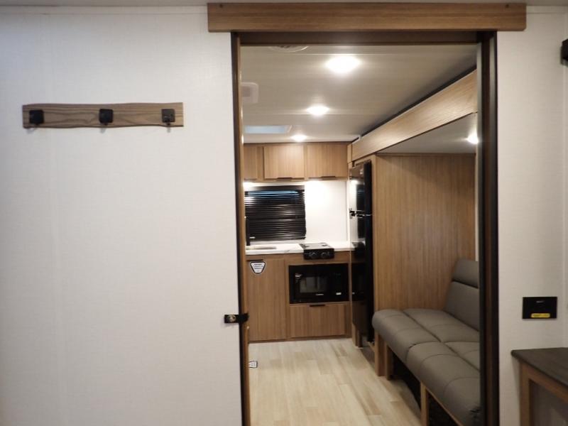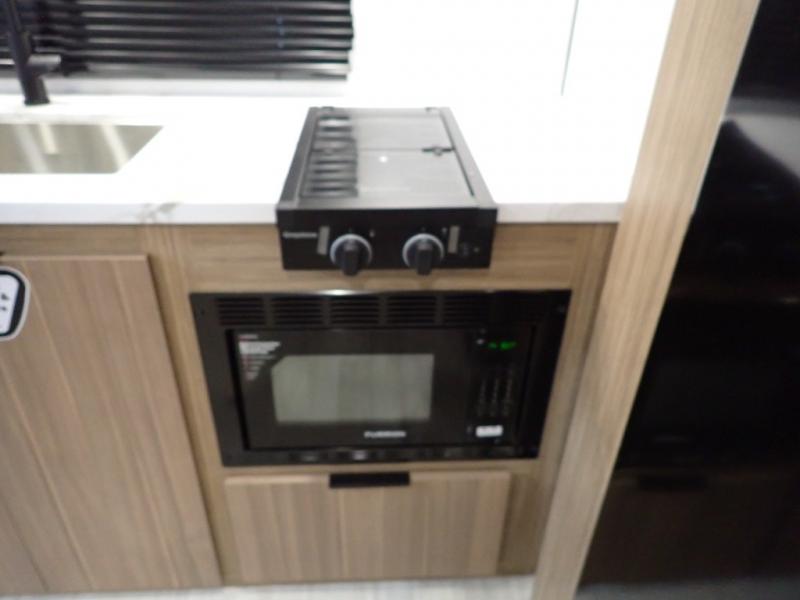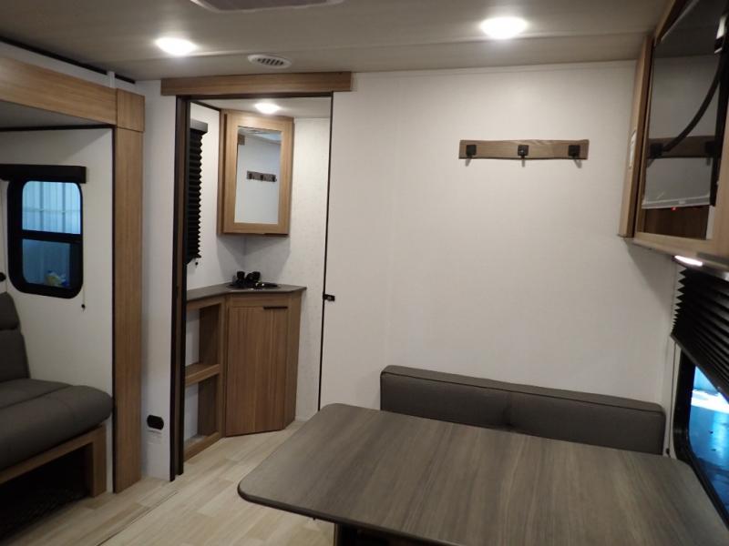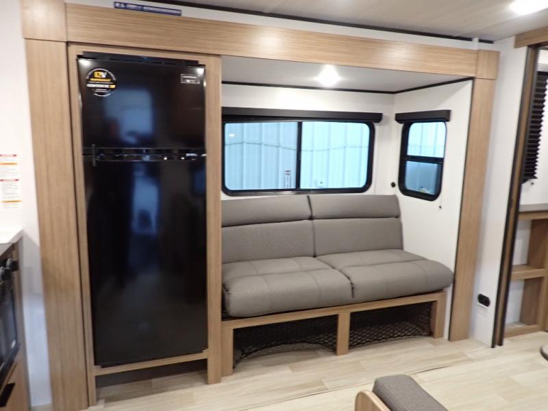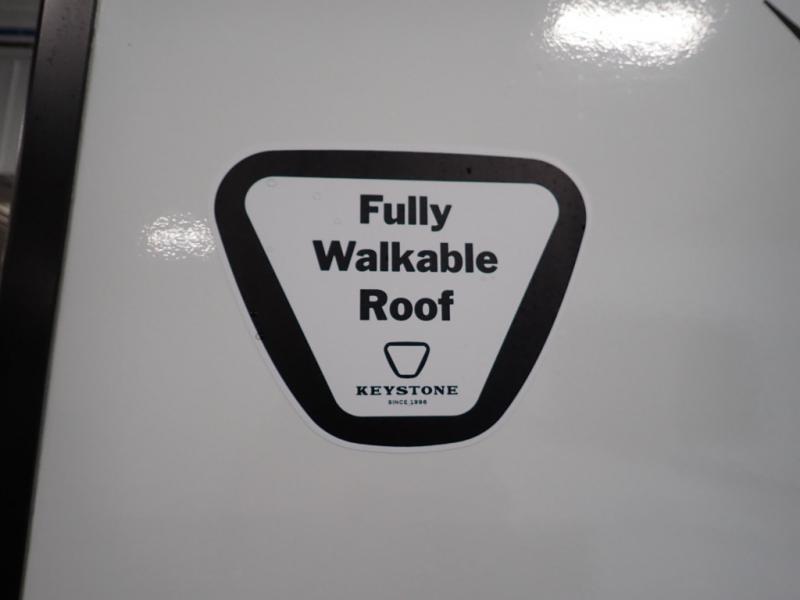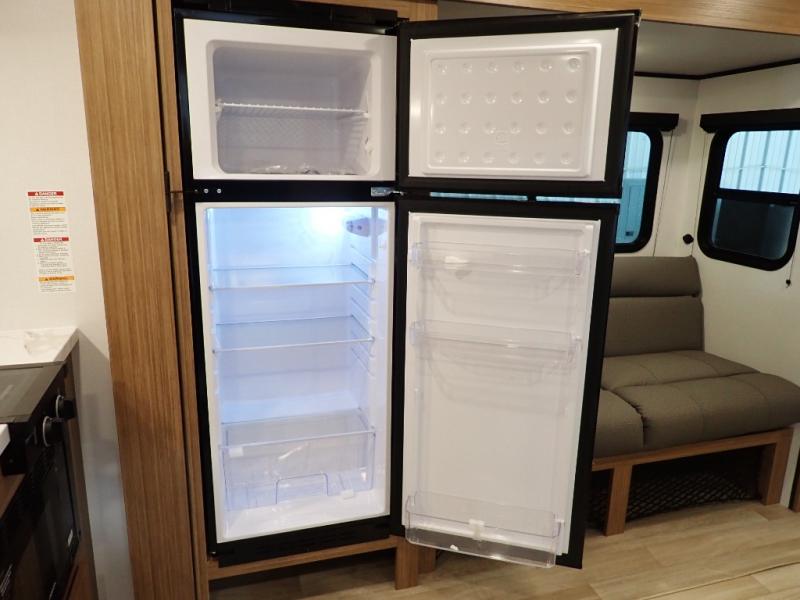 Camping trips in this spacious travel trailer will be trips well spent! With dual entry doors, you can enter in through the front private bedroom or the rear kitchen. Not only will find a walk-around queen bed in the bedroom, but you can also keep your things organized with the dual bedside wardrobes and nightstands. The walk-thru bath leads to the main living area that includes a jack knife sofa slide out and booth dinette. And the chef of your group will love cooking in the rear kitchen with a two burner cooktop, microwave oven, plus a pantry and 12V refrigerator for food storage!
