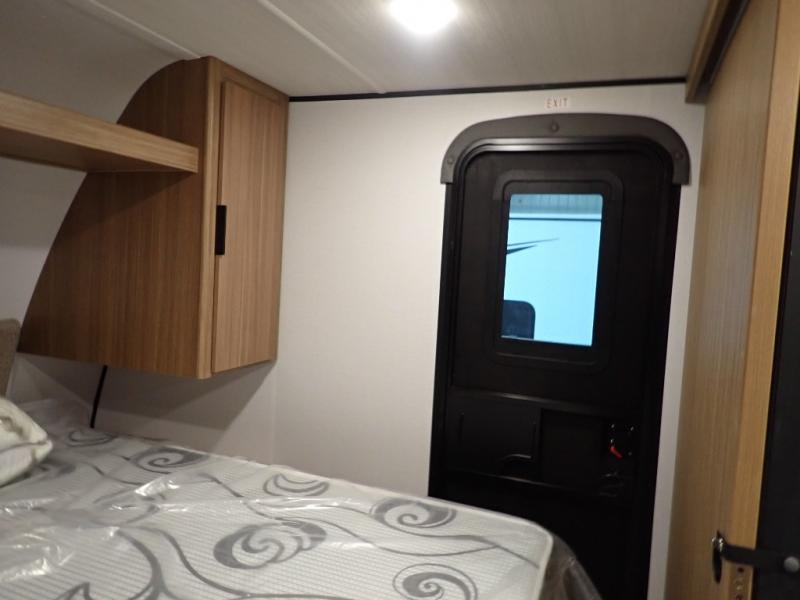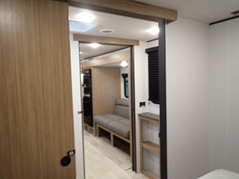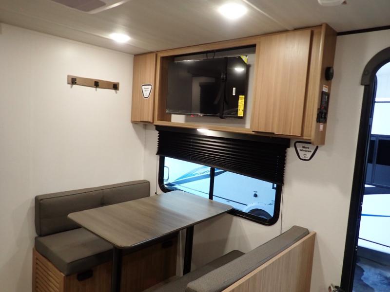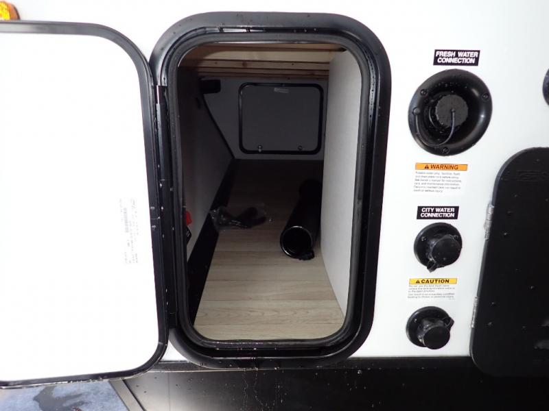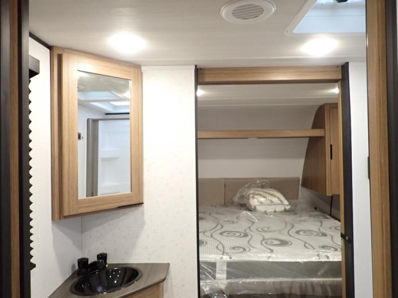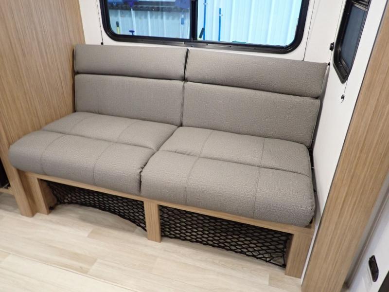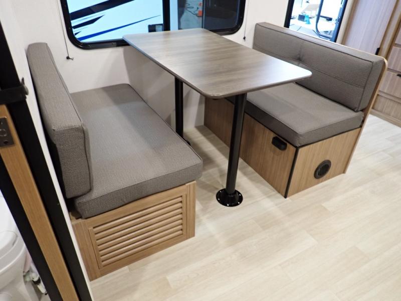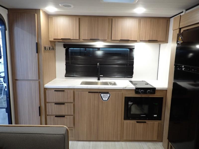 Camping trips in this spacious travel trailer will be trips well spent! With dual entry doors, you can enter in through the front private bedroom or the rear kitchen. Not only will find a walk-around queen bed in the bedroom, but you can also keep your things organized with the dual bedside wardrobes and nightstands. The walk-thru bath leads to the main living area that includes a jack knife sofa slide out and booth dinette. And the chef of your group will love cooking in the rear kitchen with a two burner cooktop, microwave oven, plus a pantry and 12V refrigerator for food storage!