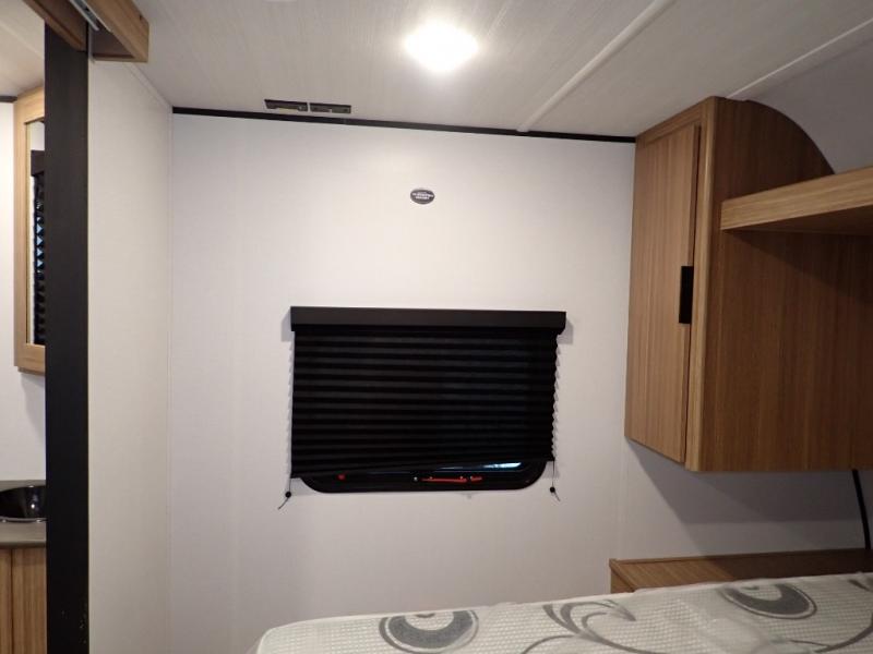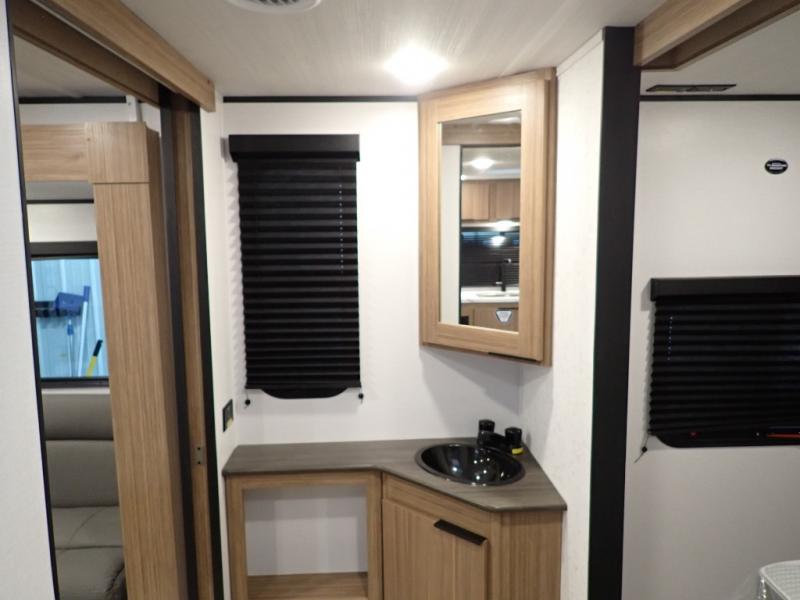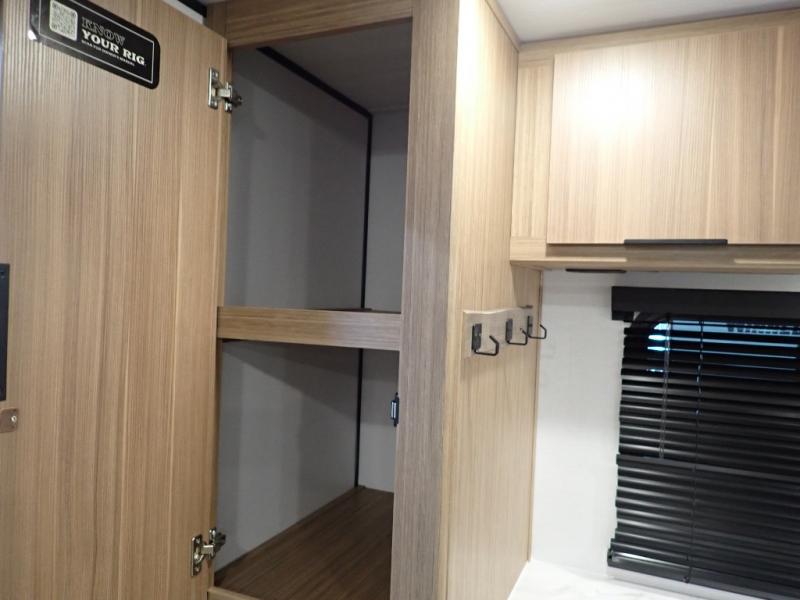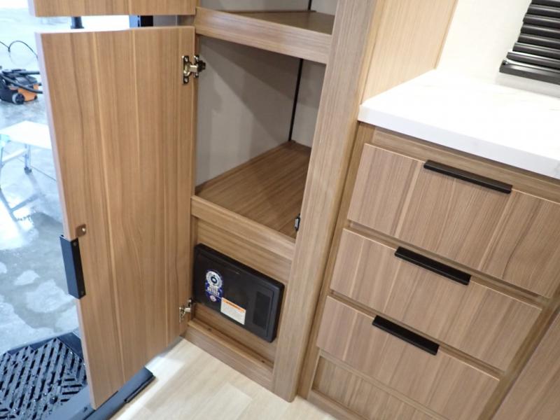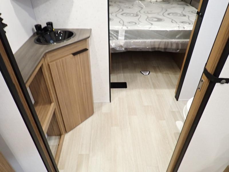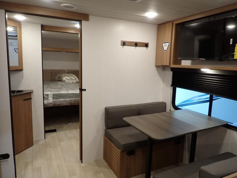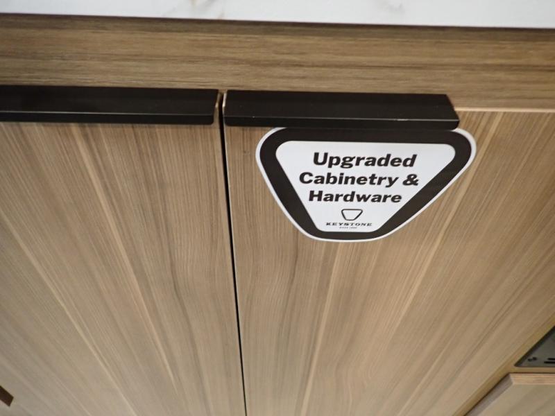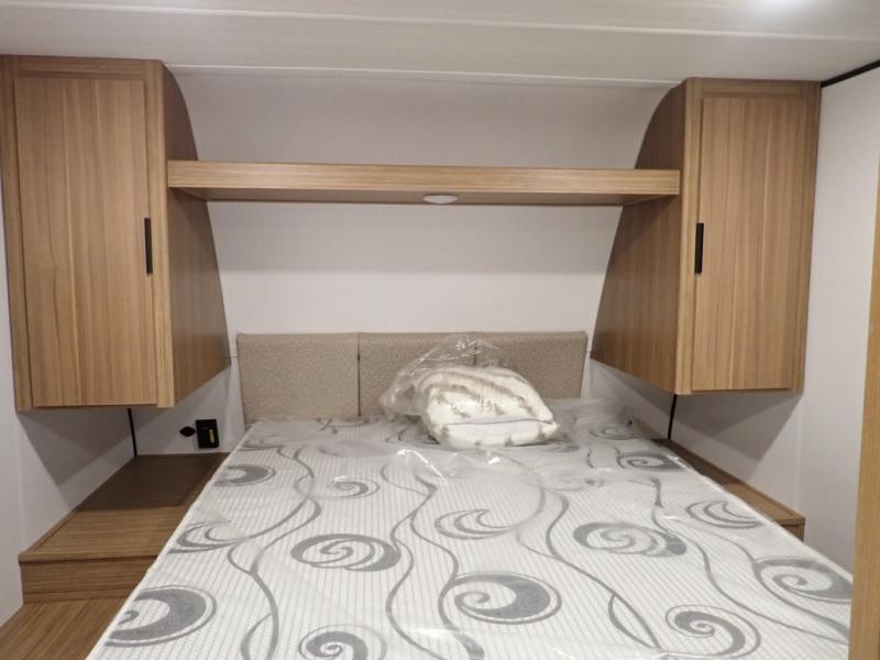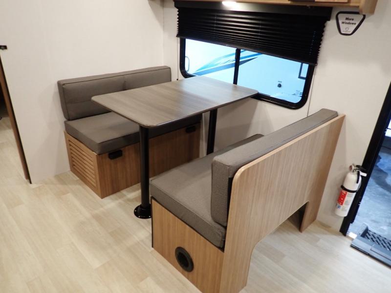 Camping trips in this spacious travel trailer will be trips well spent! With dual entry doors, you can enter in through the front private bedroom or the rear kitchen. Not only will find a walk-around queen bed in the bedroom, but you can also keep your things organized with the dual bedside wardrobes and nightstands. The walk-thru bath leads to the main living area that includes a jack knife sofa slide out and booth dinette. And the chef of your group will love cooking in the rear kitchen with a two burner cooktop, microwave oven, plus a pantry and 12V refrigerator for food storage!