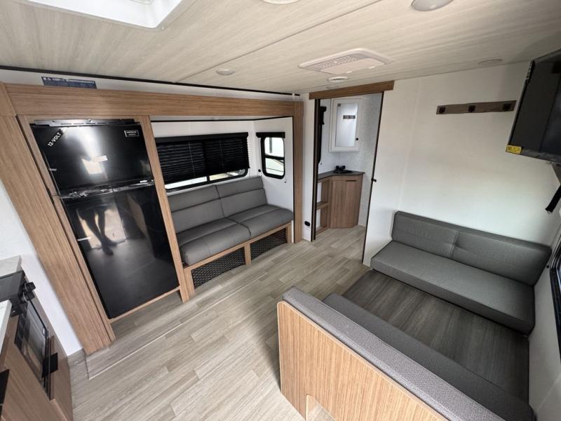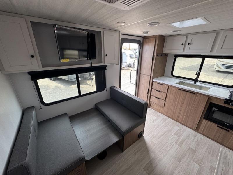 Camping trips in this spacious travel trailer will be trips well spent! With dual entry doors, you can enter in through the front private bedroom or the rear kitchen. Not only will find a walk-around queen bed in the bedroom, but you can also keep your things organized with the dual bedside wardrobes and nightstands. The walk-thru bath leads to the main living area that includes a jack knife sofa slide out and booth dinette. And the chef of your group will love cooking in the rear kitchen with a two burner cooktop, microwave oven, plus a pantry and 12V refrigerator for food storage!