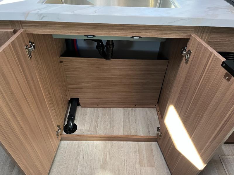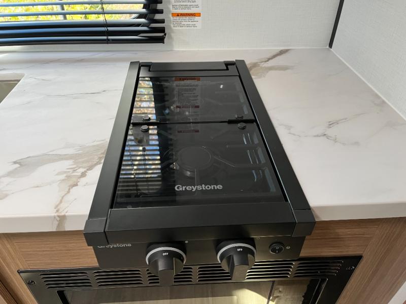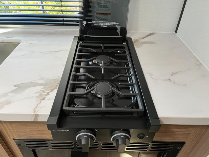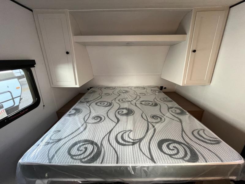 Camping trips in this spacious travel trailer will be trips well spent! With dual entry doors, you can enter in through the front private bedroom or the rear kitchen. Not only will find a walk-around queen bed in the bedroom, but you can also keep your things organized with the dual bedside wardrobes and nightstands. The walk-thru bath leads to the main living area that includes a jack knife sofa slide out and booth dinette. And the chef of your group will love cooking in the rear kitchen with a two burner cooktop, microwave oven, plus a pantry and 12V refrigerator for food storage!