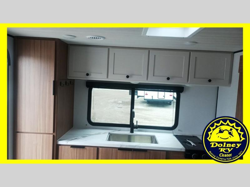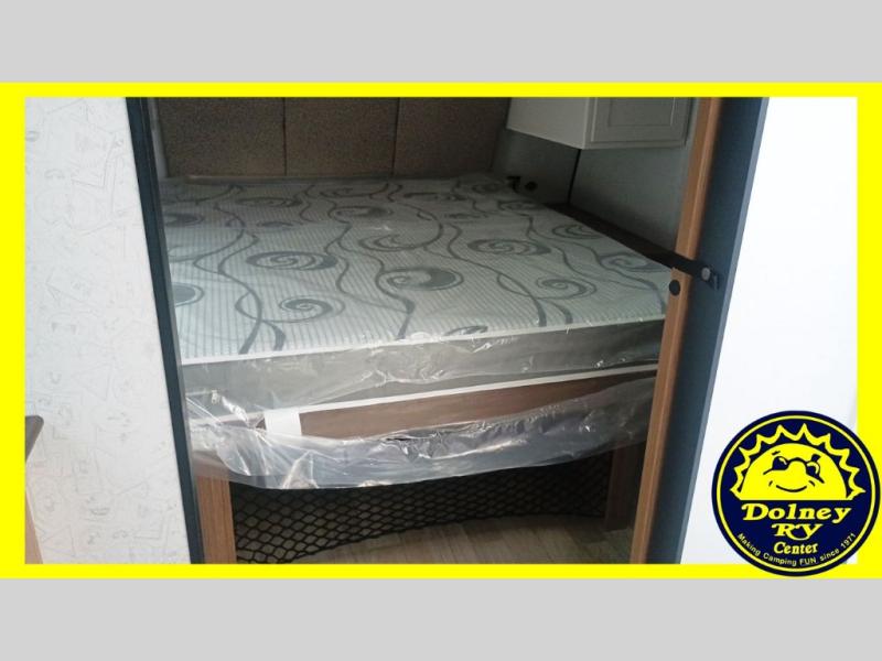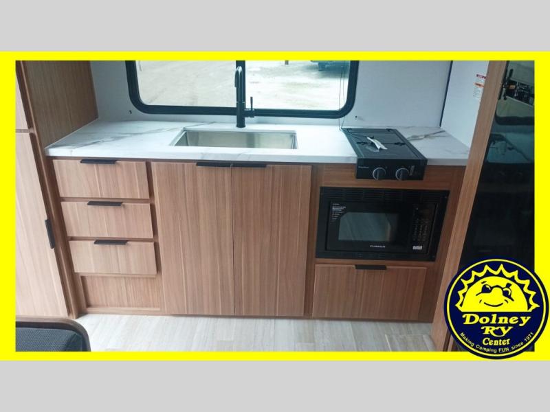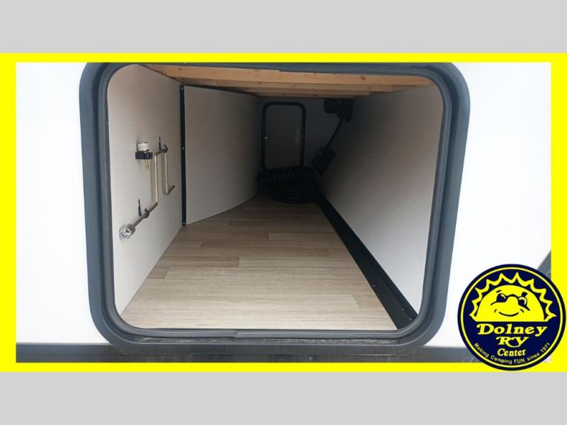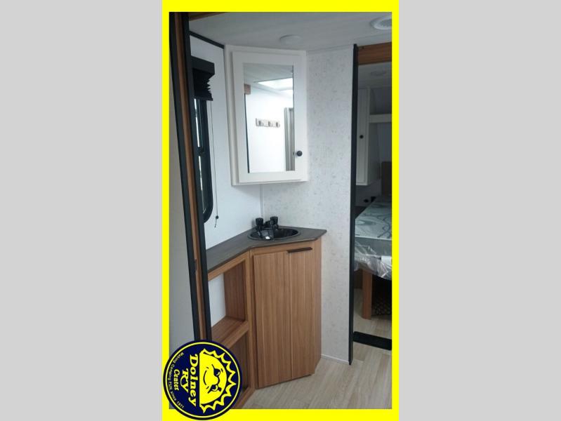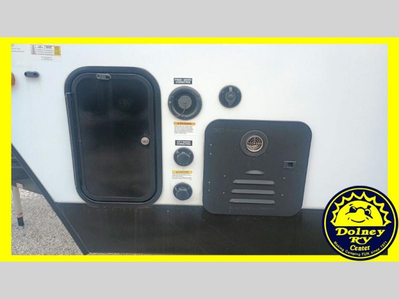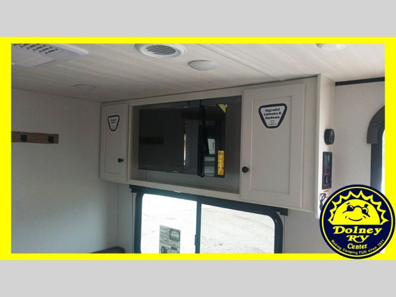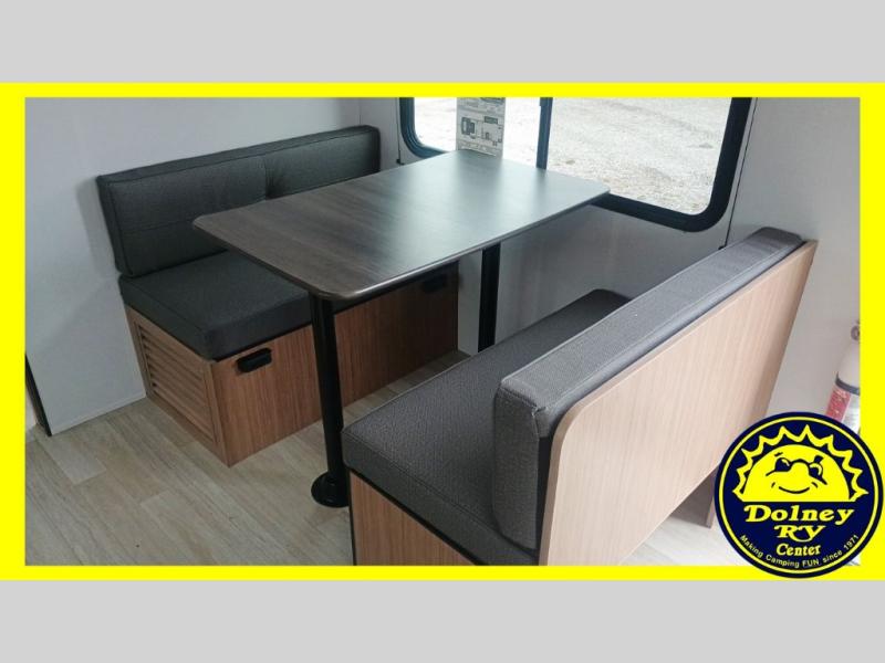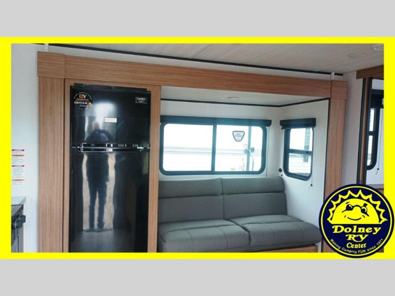 Camping trips in this spacious travel trailer will be trips well spent! With dual entry doors, you can enter in through the front private bedroom or the rear kitchen. Not only will find a walk-around queen bed in the bedroom, but you can also keep your things organized with the dual bedside wardrobes and nightstands. The walk-thru bath leads to the main living area that includes a jack knife sofa slide out and booth dinette. And the chef of your group will love cooking in the rear kitchen with a two burner cooktop, microwave oven, plus a pantry and 12V refrigerator for food storage!
