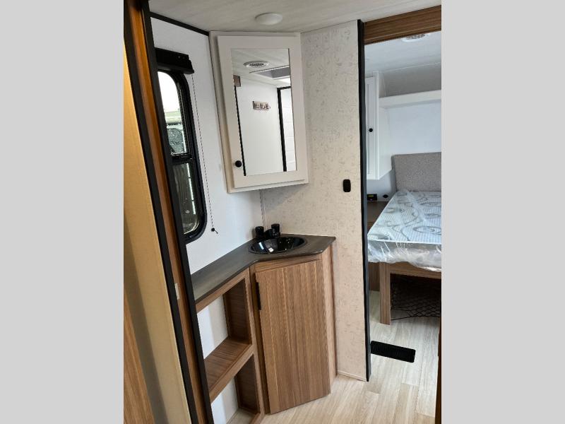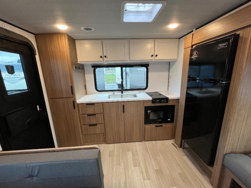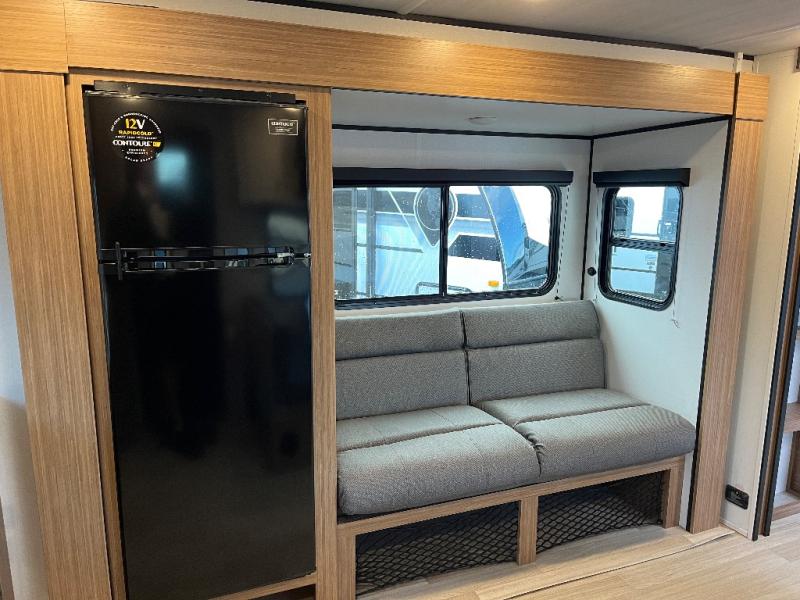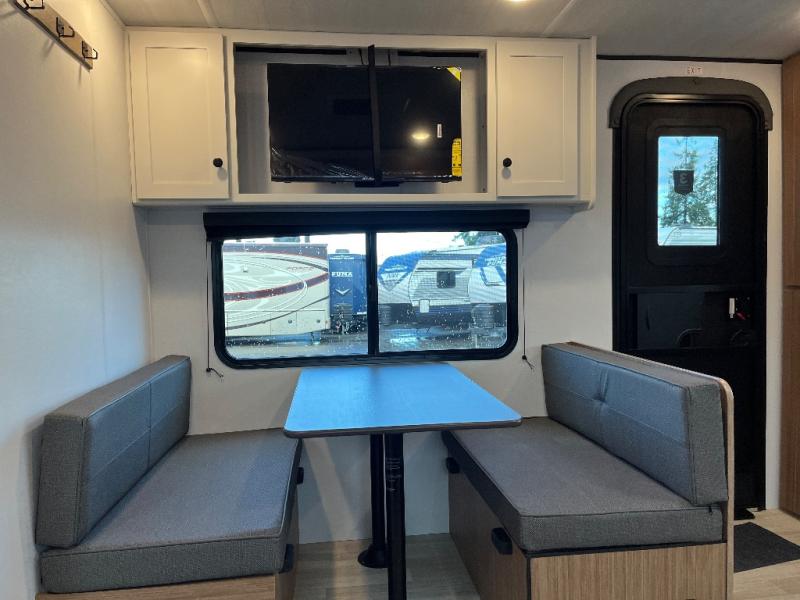 Camping trips in this spacious travel trailer will be trips well spent! With dual entry doors, you can enter in through the front private bedroom or the rear kitchen. Not only will find a walk-around queen bed in the bedroom, but you can also keep your things organized with the dual bedside wardrobes and nightstands. The walk-thru bath leads to the main living area that includes a jack knife sofa slide out and booth dinette. And the chef of your group will love cooking in the rear kitchen with a two burner cooktop, microwave oven, plus a pantry and 12V refrigerator for food storage!
