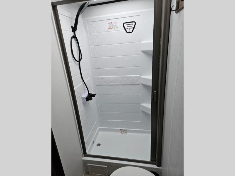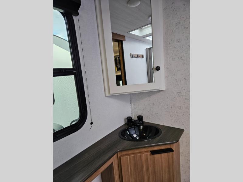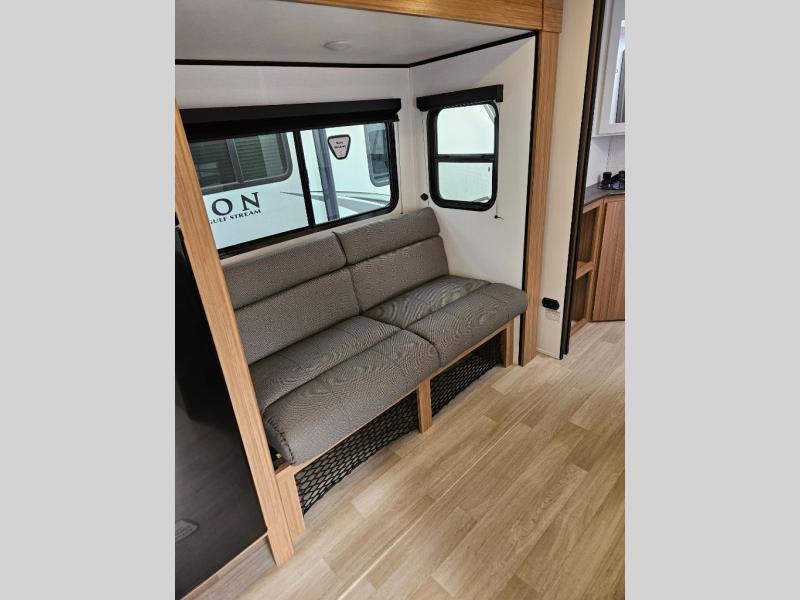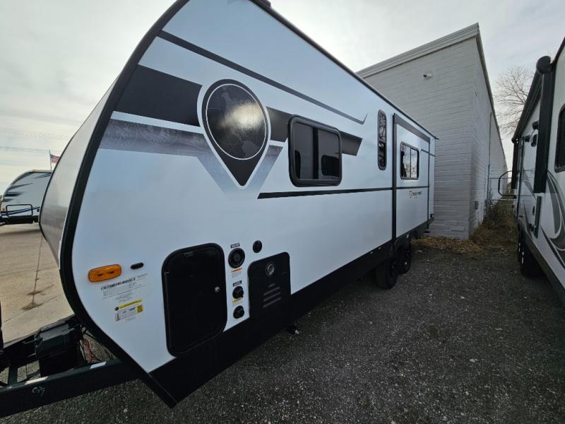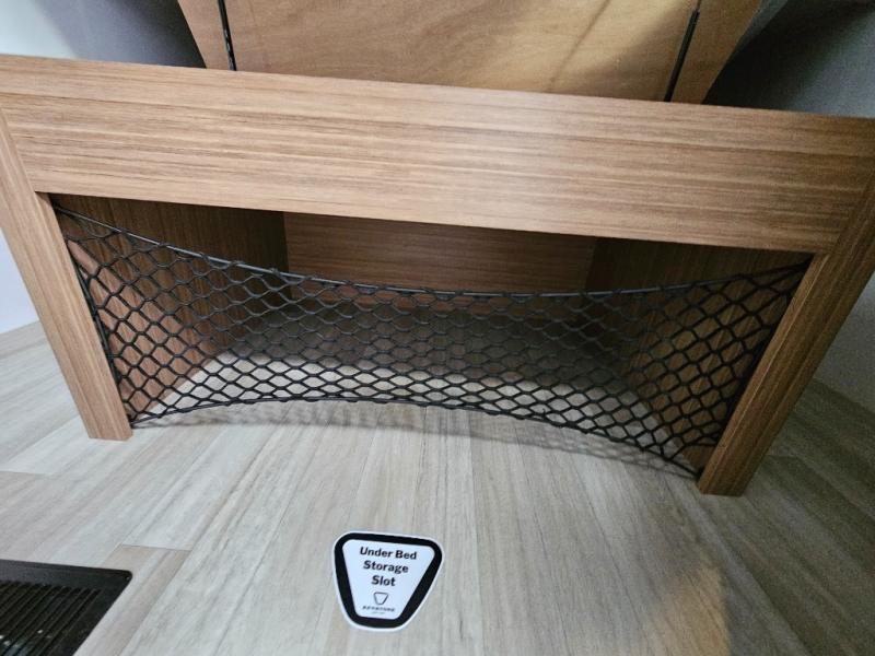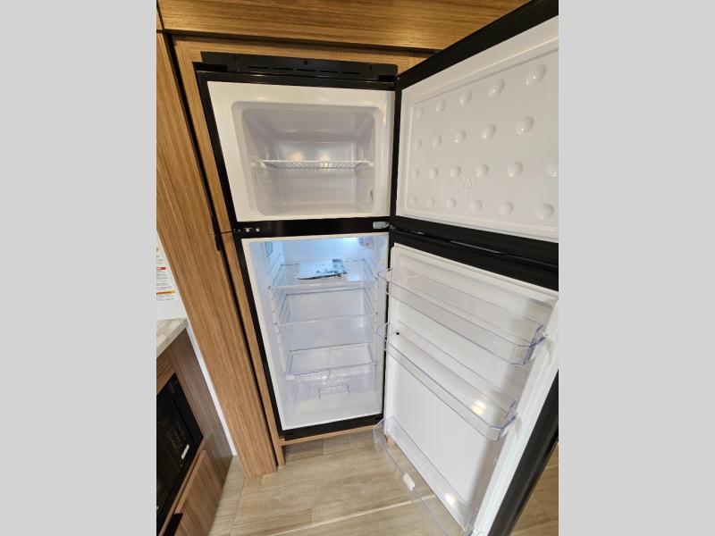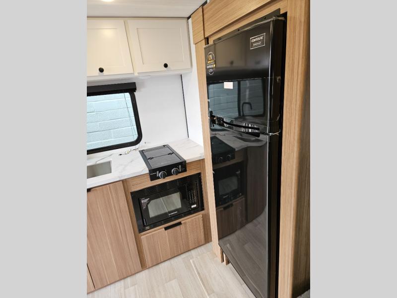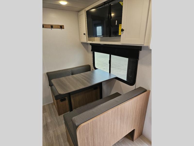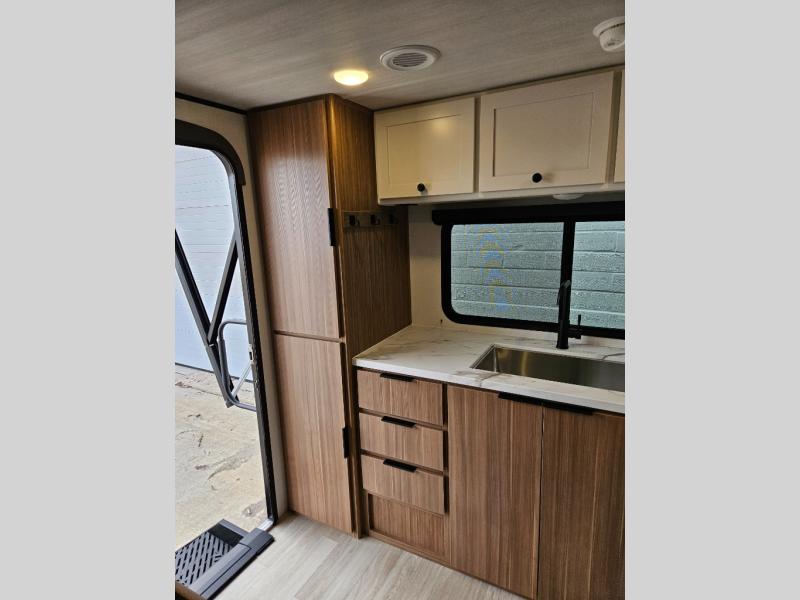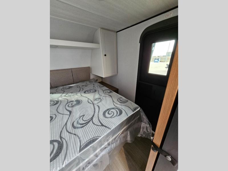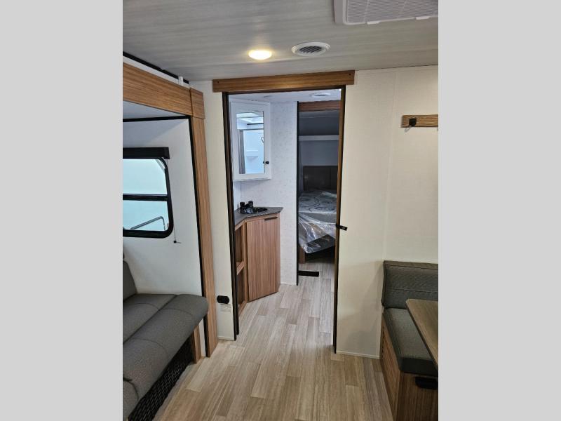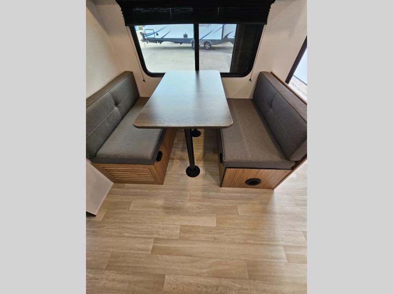 Camping trips in this spacious travel trailer will be trips well spent! With dual entry doors, you can enter in through the front private bedroom or the rear kitchen. Not only will find a walk-around queen bed in the bedroom, but you can also keep your things organized with the dual bedside wardrobes and nightstands. The walk-thru bath leads to the main living area that includes a jack knife sofa slide out and booth dinette. And the chef of your group will love cooking in the rear kitchen with a two burner cooktop, microwave oven, plus a pantry and 12V refrigerator for food storage!