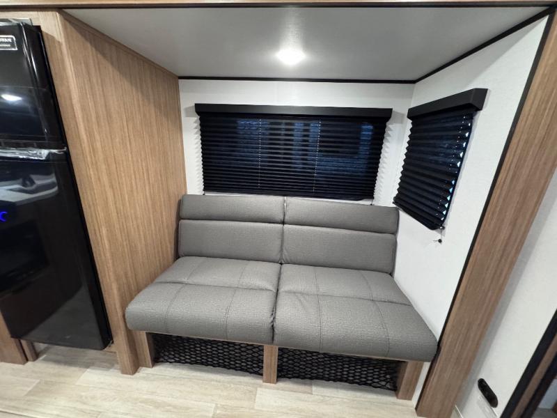 Camping trips in this spacious travel trailer will be trips well spent! With dual entry doors, you can enter in through the front private bedroom or the rear kitchen. Not only will find a walk-around queen bed in the bedroom, but you can also keep your things organized with the dual bedside wardrobes and nightstands. The walk-thru bath leads to the main living area that includes a jack knife sofa slide out and booth dinette. And the chef of your group will love cooking in the rear kitchen with a two-burner cooktop, microwave oven, plus a pantry and 12V refrigerator for food storage!