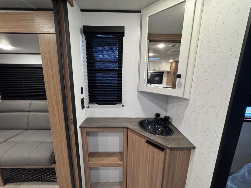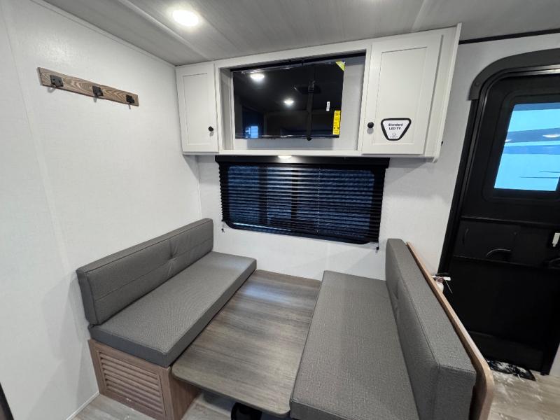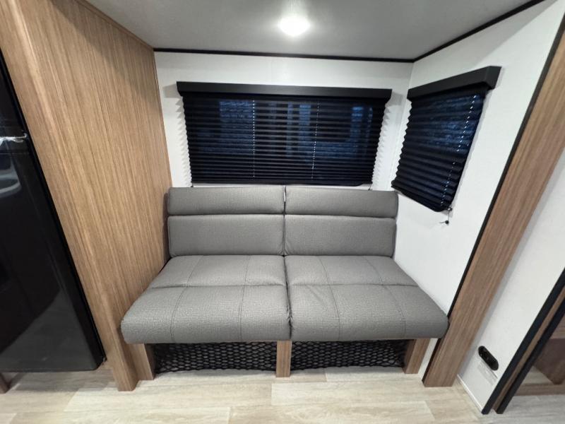Camping trips in this spacious travel trailer will be trips well spent! With dual entry doors, you can enter in through the front private bedroom or the rear kitchen. Not only will find a walk-around queen bed in the bedroom, but you can also keep your things organized with the dual bedside wardrobes and nightstands. The walk-thru bath leads to the main living area that includes a jack knife sofa slide out and booth dinette. And the chef of your group will love cooking in the rear kitchen with a two-burner cooktop, microwave oven, plus a pantry and 12V refrigerator for food storage!