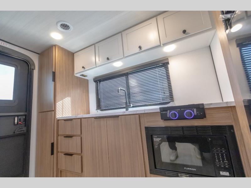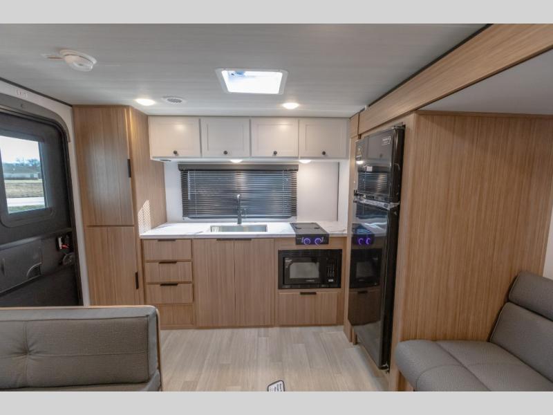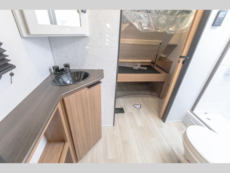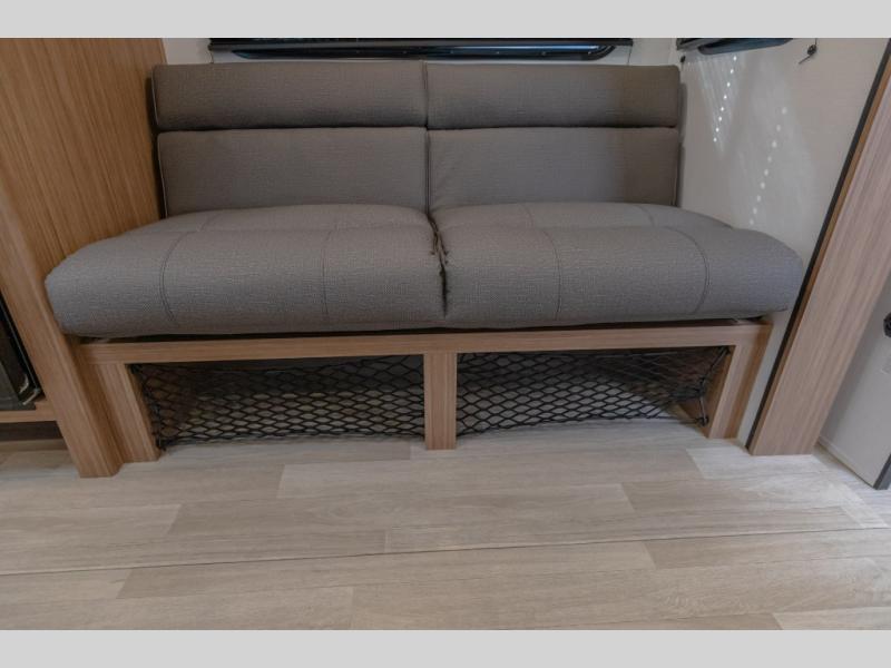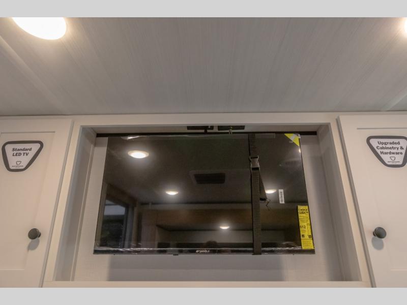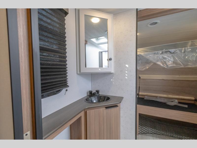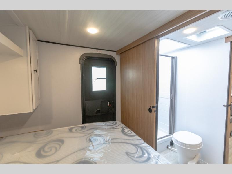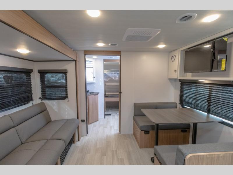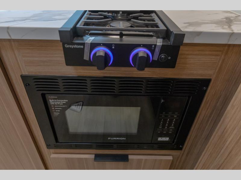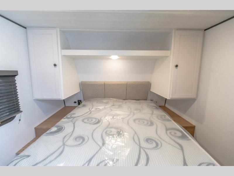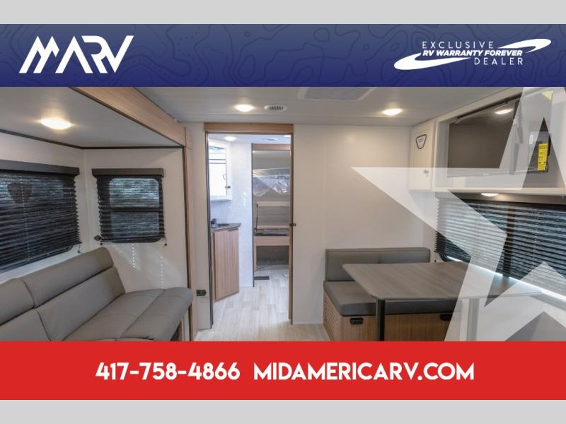 Camping trips in this spacious travel trailer will be trips well spent! With dual entry doors, you can enter in through the front private bedroom or the rear kitchen. Not only will find a walk-around queen bed in the bedroom, but you can also keep your things organized with the dual bedside wardrobes and nightstands. The walk-thru bath leads to the main living area that includes a jack knife sofa slide out and booth dinette. And the chef of your group will love cooking in the rear kitchen with a two-burner cooktop, microwave oven, plus a pantry and 12V refrigerator for food storage!