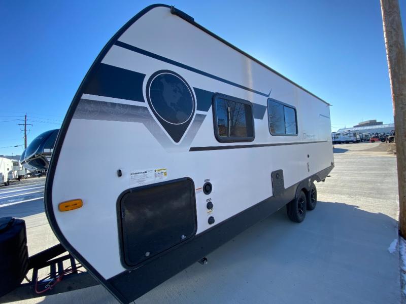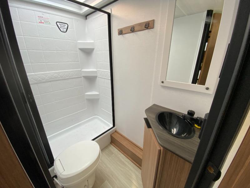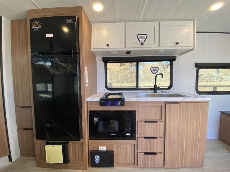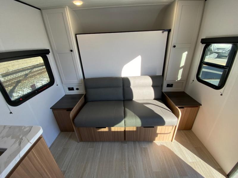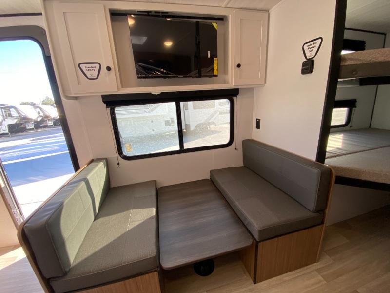 Your kids will love this travel trailer! The double-size bunks provide comfortable sleeping quarters, while the booth dinette offers a cozy spot for meals and relaxation. The full bathroom features everything you need to take care of yourself and is convenient on the go, plus, a refrigerator, microwave, and two-burner cooktop make meal prep a breeze. The overhead cabinets and pantry provide ample storage for your favorite spices and belongings. Moreover, the Murphy bed offers additional sleeping space, and the wardrobe and nightstand on each side of the bed provide convenient storage and comfort. On the outside, you will find A 17' awning that provides shade and protection, while pass-thru storage offers additional space for gear and equipment.