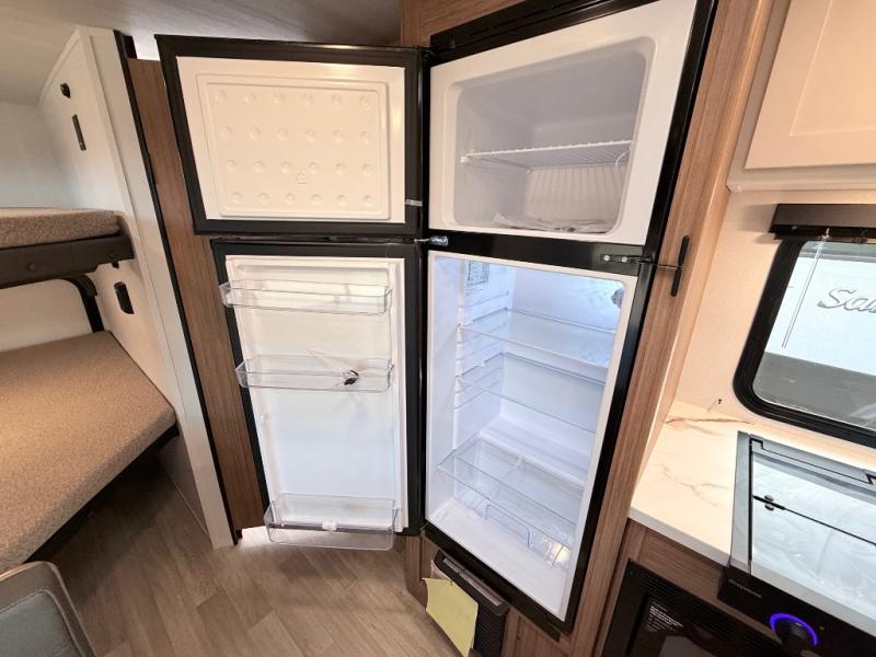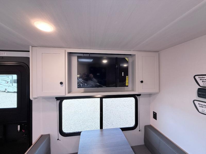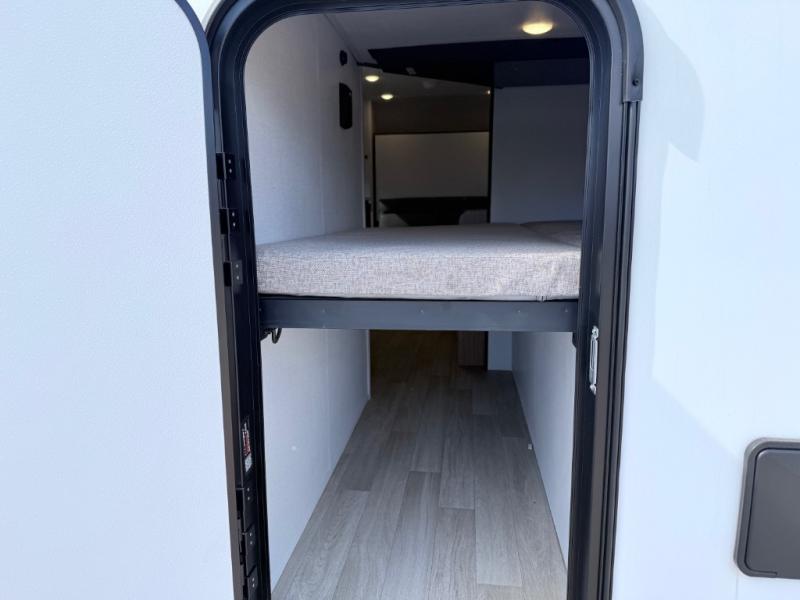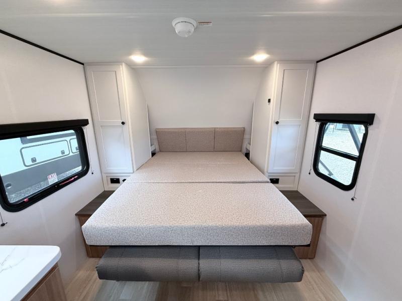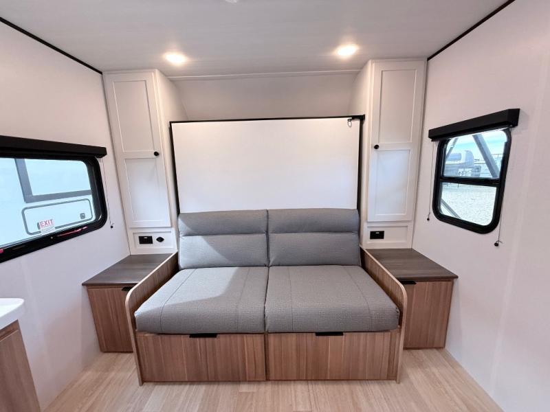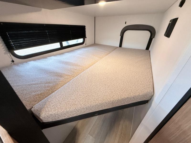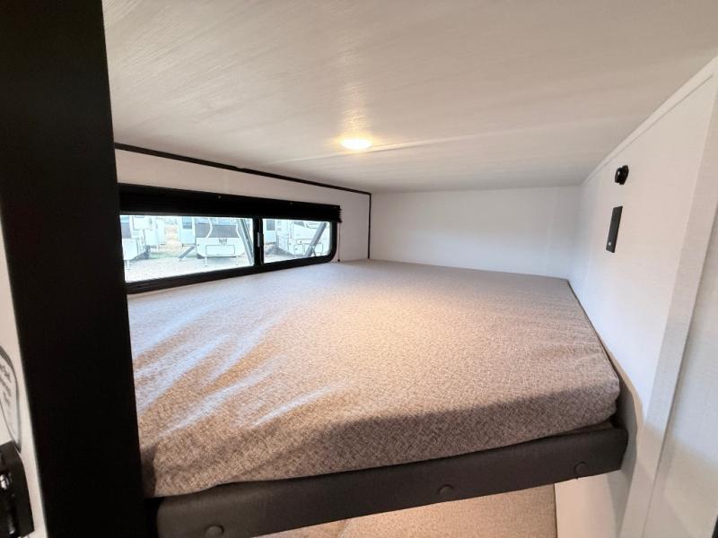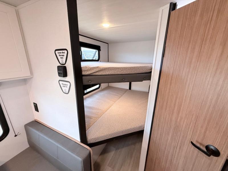 Your kids will love this travel trailer! The double-size bunks provide comfortable sleeping quarters, while the booth dinette offers a cozy spot for meals and relaxation. The full bathroom features everything you need to take care of yourself and is convenient on the go, plus, a refrigerator, microwave, and two-burner cooktop make meal prep a breeze. The overhead cabinets and pantry provide ample storage for your favorite spices and belongings. Moreover, the Murphy bed offers additional sleeping space, and the wardrobe and nightstand on each side of the bed provide convenient storage and comfort. On the outside, you will find a 17' awning that provides shade and protection, while pass-thru storage offers additional space for gear and equipment.