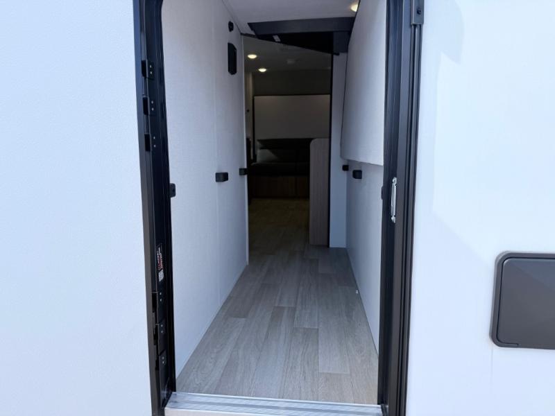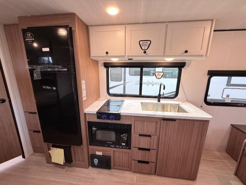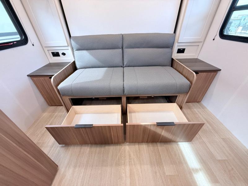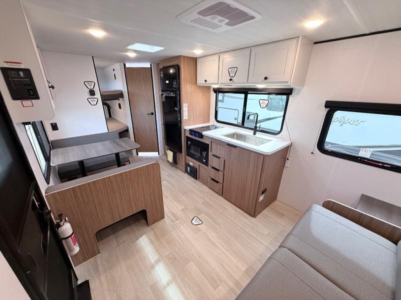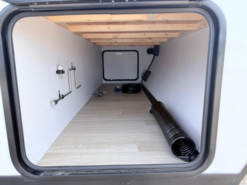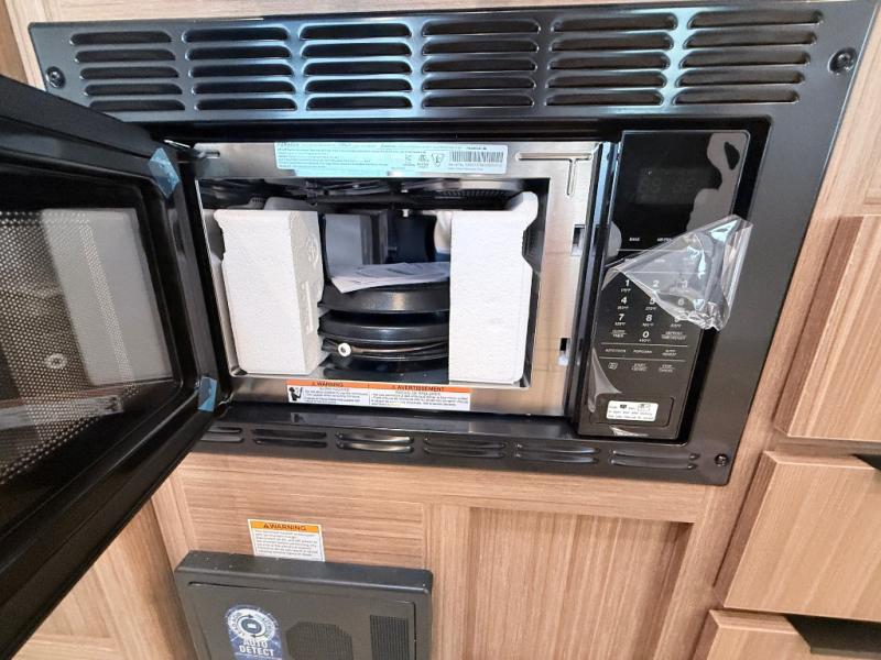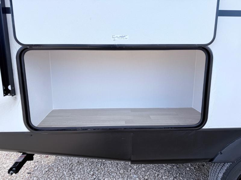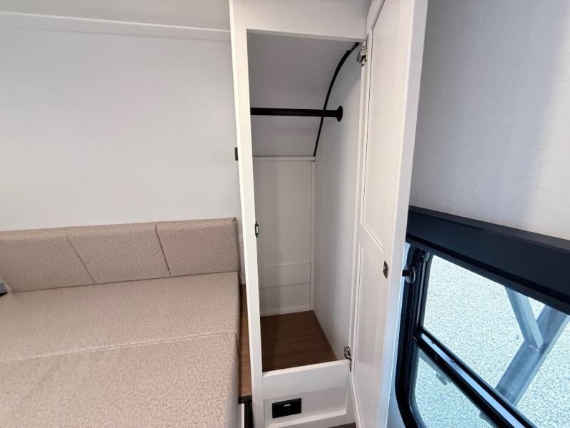 Your kids will love this travel trailer! The double-size bunks provide comfortable sleeping quarters, while the booth dinette offers a cozy spot for meals and relaxation. The full bathroom features everything you need to take care of yourself and is convenient on the go, plus, a refrigerator, microwave, and two-burner cooktop make meal prep a breeze. The overhead cabinets and pantry provide ample storage for your favorite spices and belongings. Moreover, the Murphy bed offers additional sleeping space, and the wardrobe and nightstand on each side of the bed provide convenient storage and comfort. On the outside, you will find a 17' awning that provides shade and protection, while pass-thru storage offers additional space for gear and equipment.