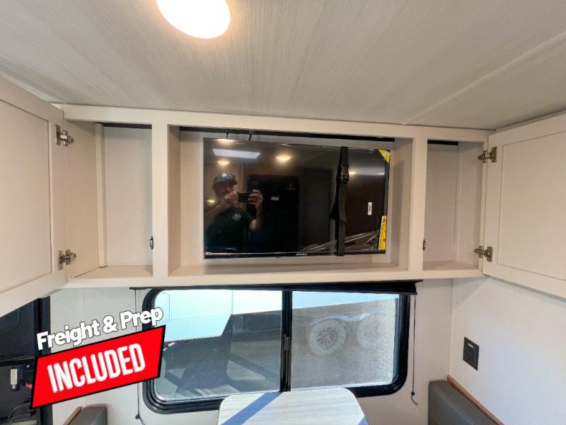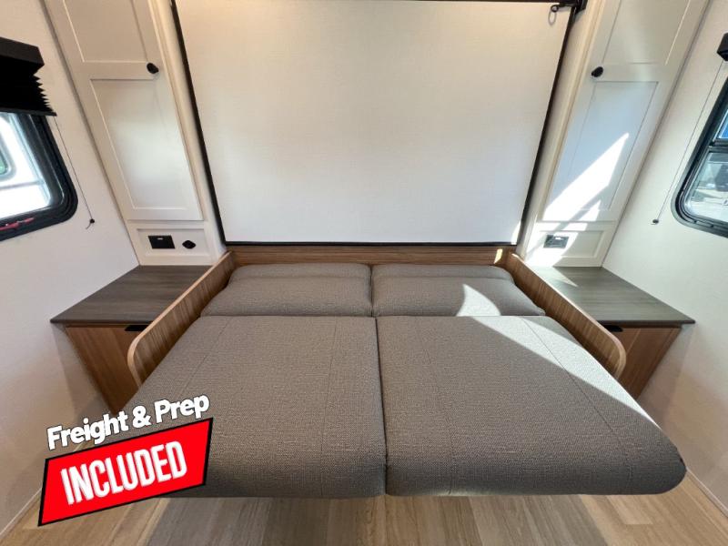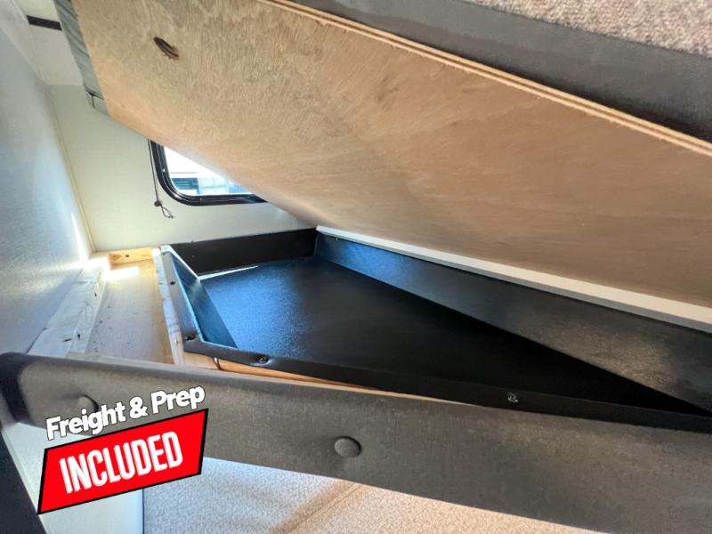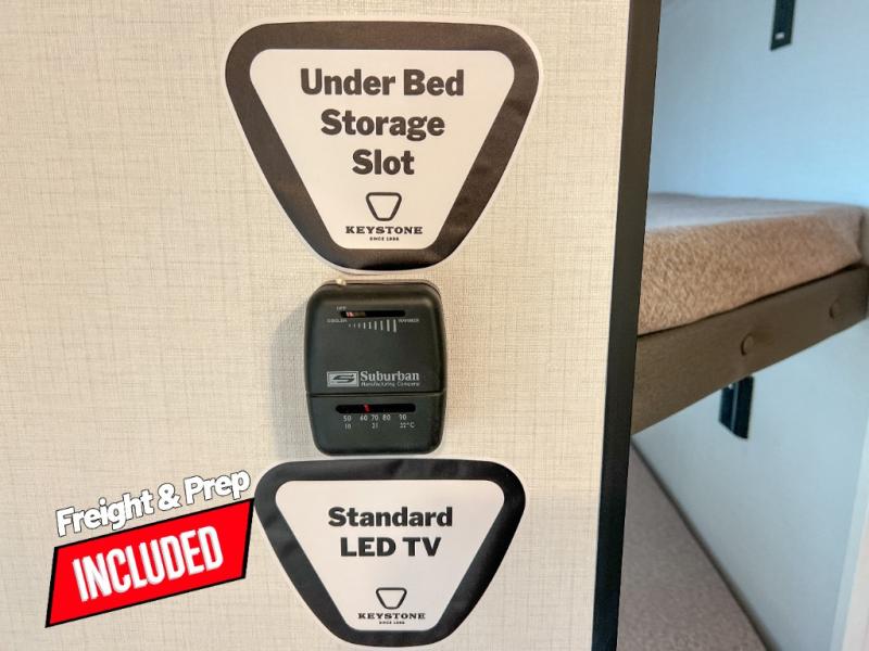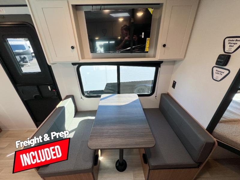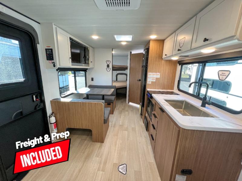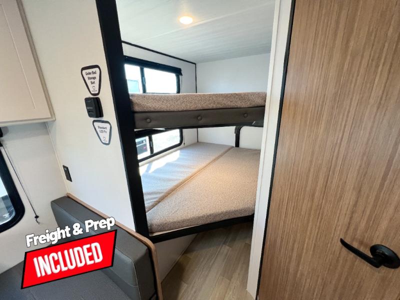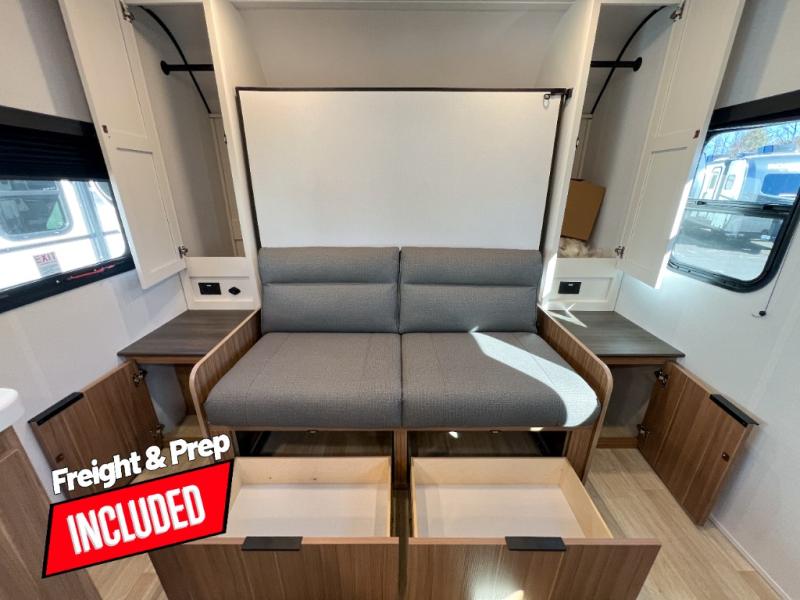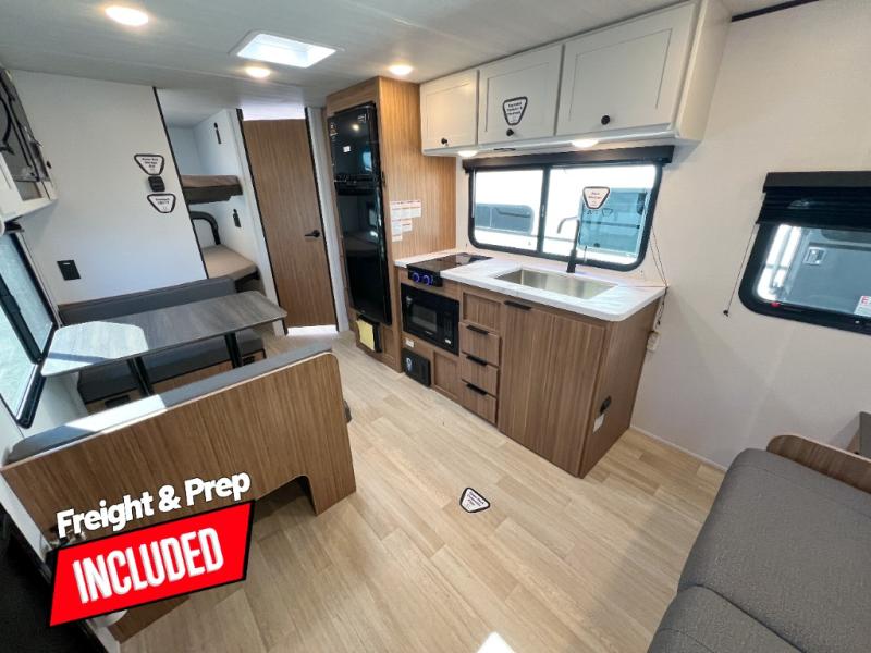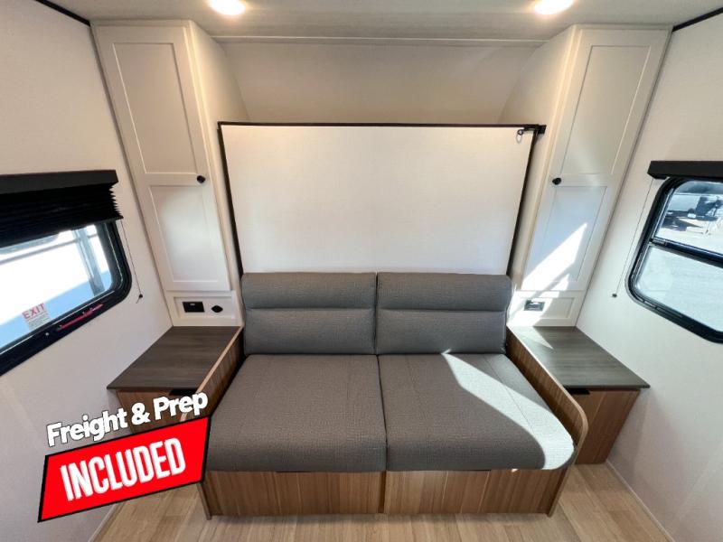 Your kids will love this travel trailer! The double-size bunks provide comfortable sleeping quarters, while the booth dinette offers a cozy spot for meals and relaxation. The full bathroom features everything you need to take care of yourself and is convenient on the go, plus, a refrigerator, microwave, and two-burner cooktop make meal prep a breeze. The overhead cabinets and pantry provide ample storage for your favorite spices and belongings. Moreover, the Murphy bed offers additional sleeping space, and the wardrobe and nightstand on each side of the bed provide convenient storage and comfort. On the outside, you will find a 17' awning that provides shade and protection, while pass-thru storage offers additional space for gear and equipment.