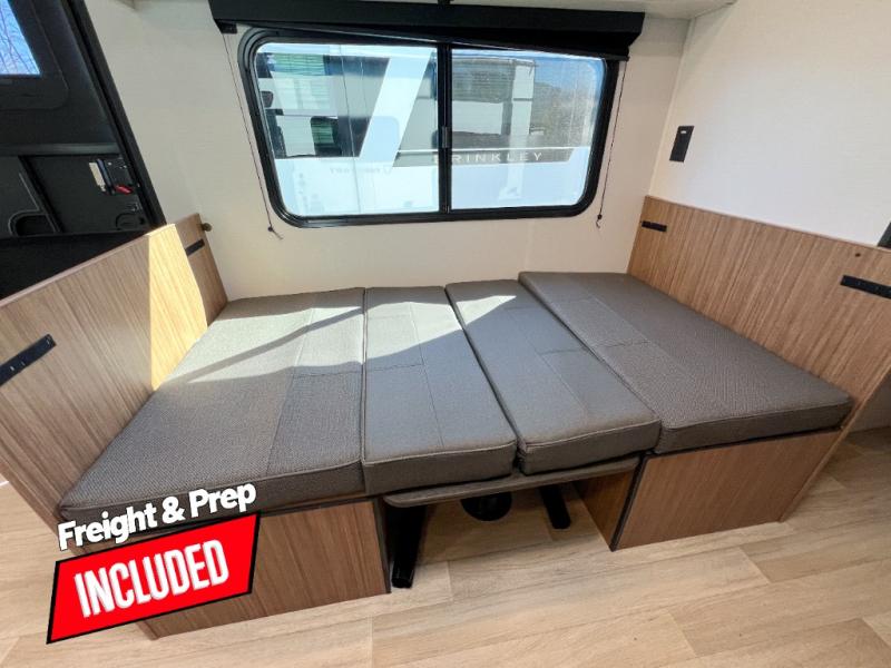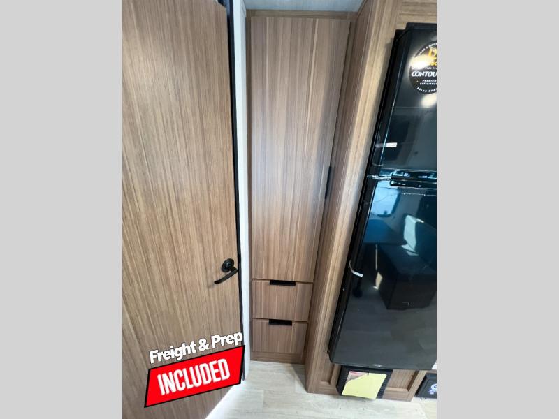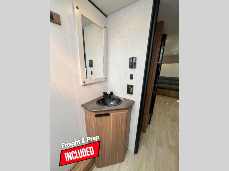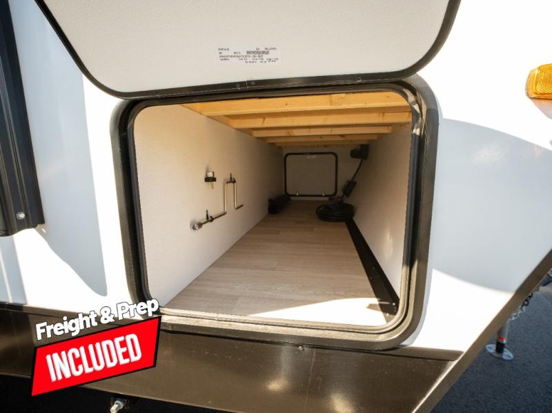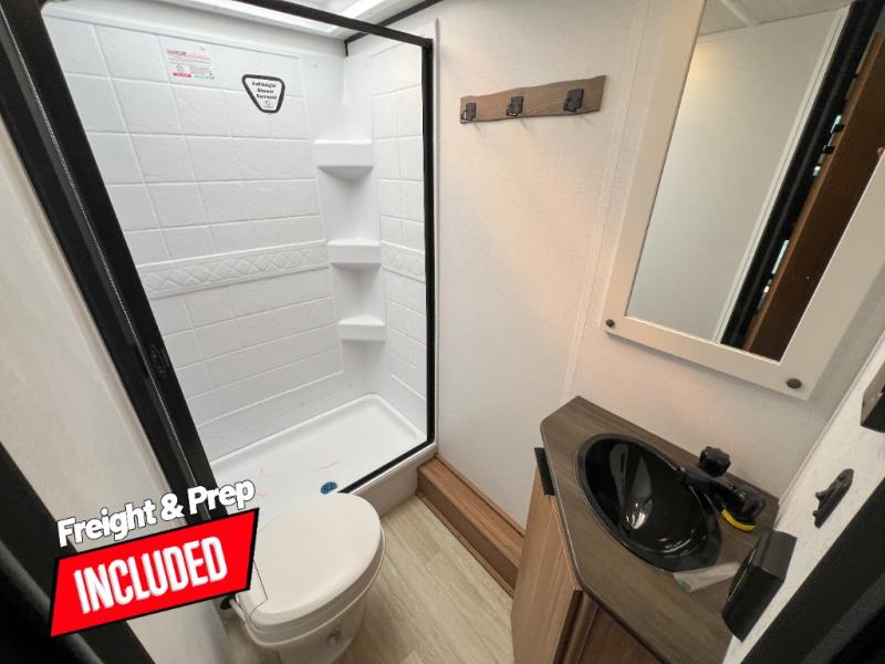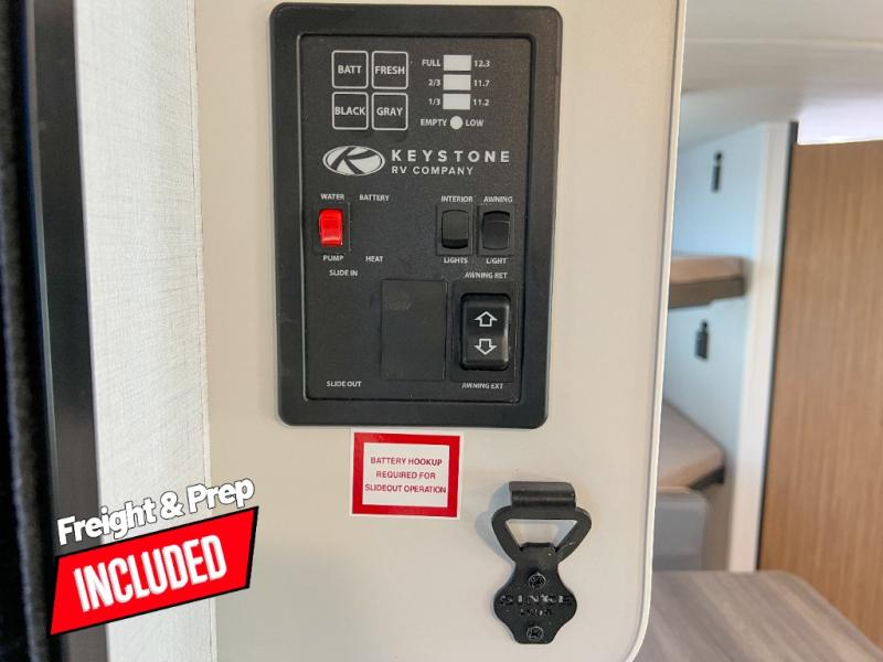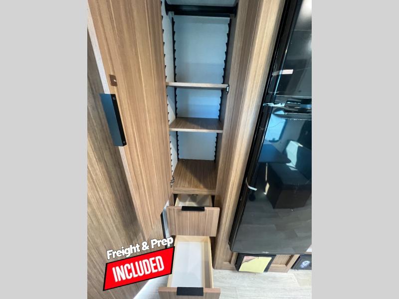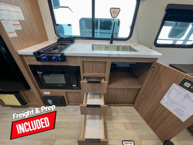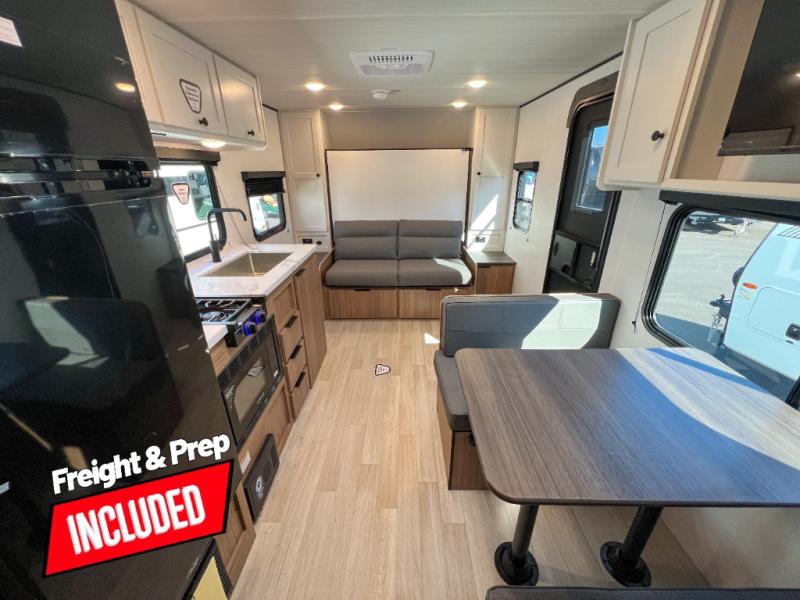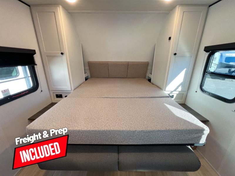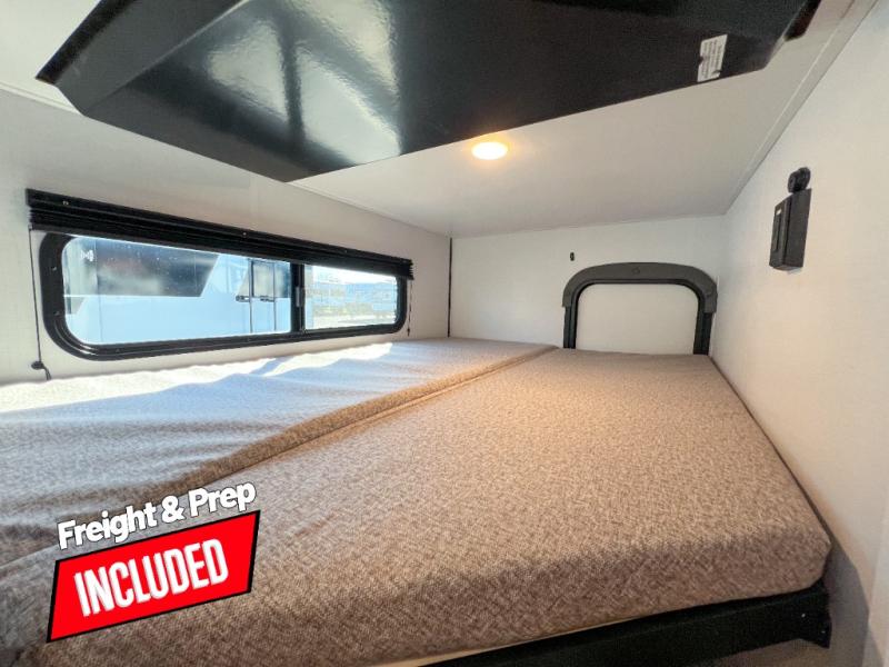 Your kids will love this travel trailer! The double-size bunks provide comfortable sleeping quarters, while the booth dinette offers a cozy spot for meals and relaxation. The full bathroom features everything you need to take care of yourself and is convenient on the go, plus, a refrigerator, microwave, and two-burner cooktop make meal prep a breeze. The overhead cabinets and pantry provide ample storage for your favorite spices and belongings. Moreover, the Murphy bed offers additional sleeping space, and the wardrobe and nightstand on each side of the bed provide convenient storage and comfort. On the outside, you will find a 17' awning that provides shade and protection, while pass-thru storage offers additional space for gear and equipment.
