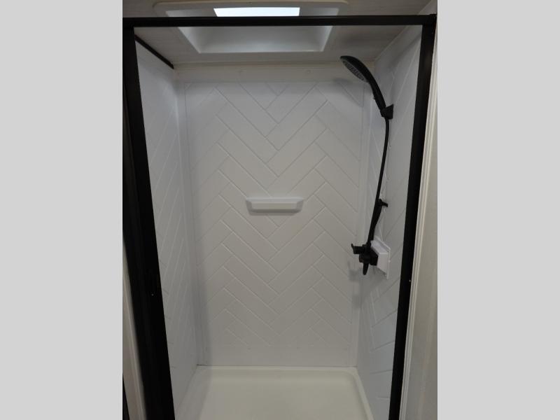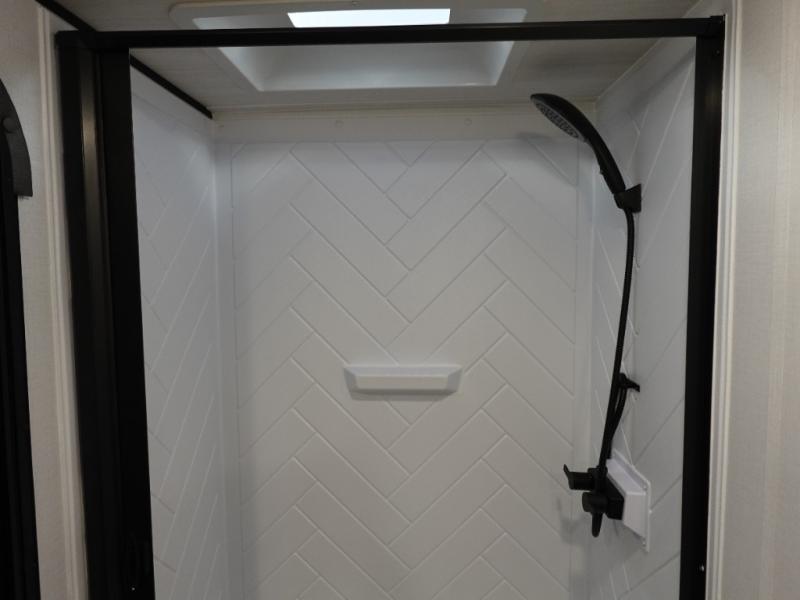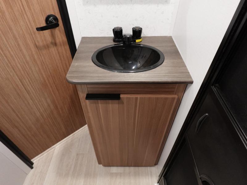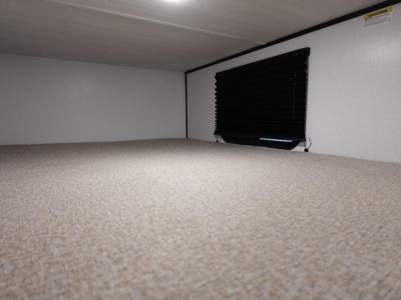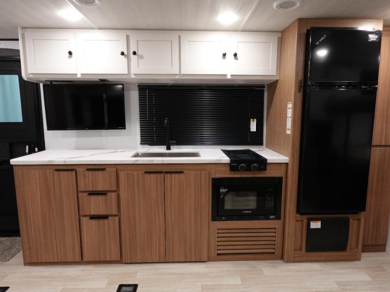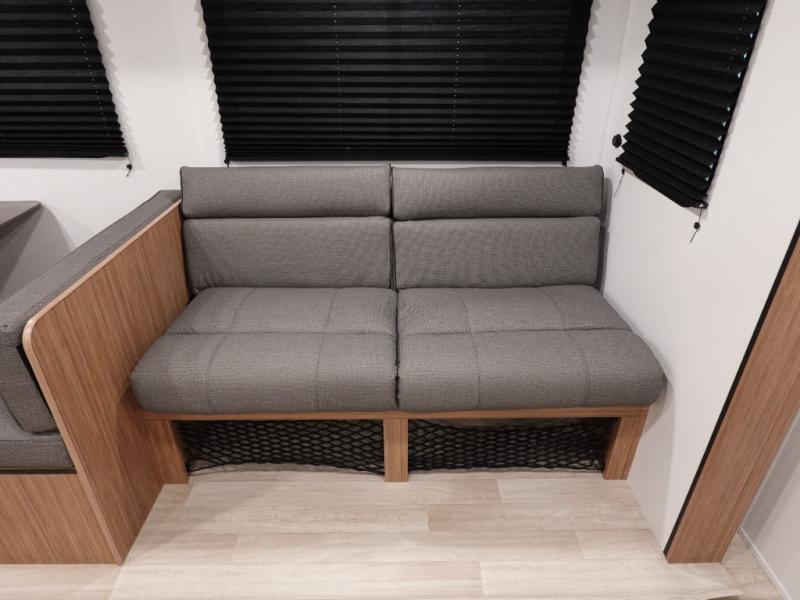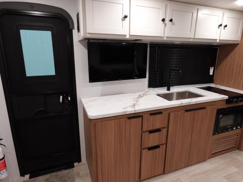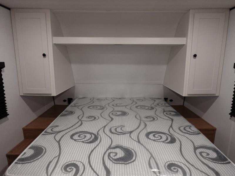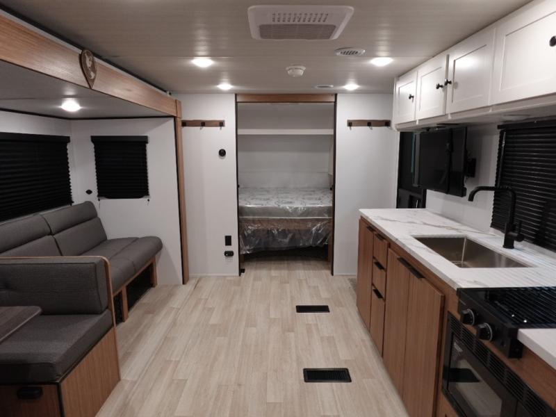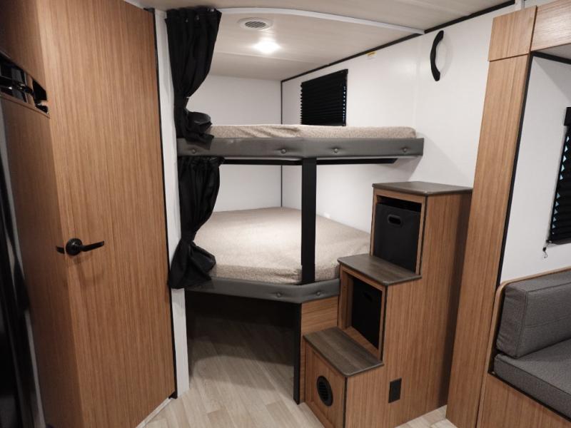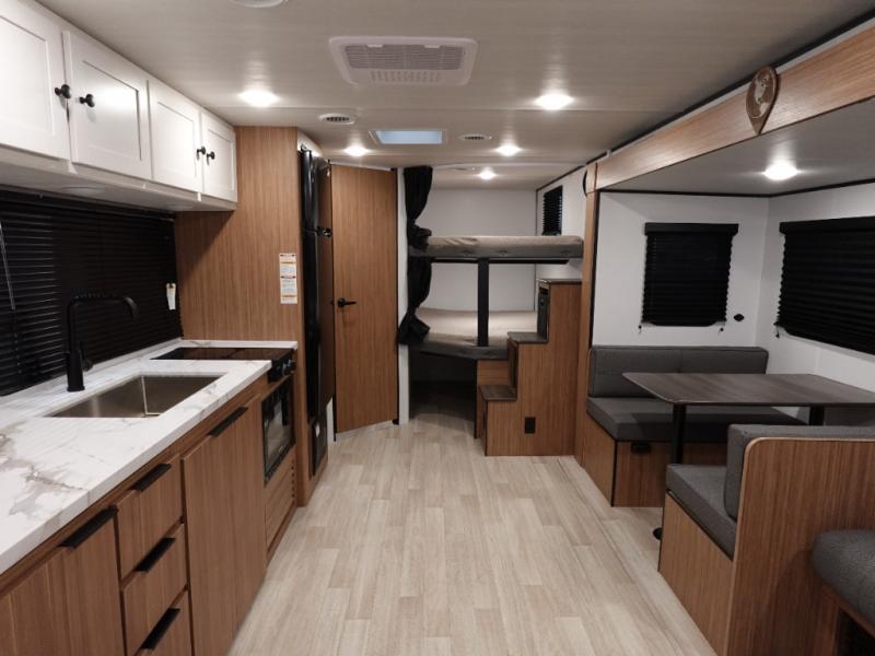 The double-size bunks in this spacious travel trailer make it family approved and perfect for camping with a larger group. You'll have your own private bedroom up front with a queen bed and dual bedside wardrobes, and there are sliding doors to the bedroom which help save space. The main living area and kitchen is made open thanks to the large slide out which houses the booth dinette and jack knife sofa. The fully equipped kitchen lets the chef of your group whip up their best meals, and the full bath with its own exterior entry door is sure to come in handy!