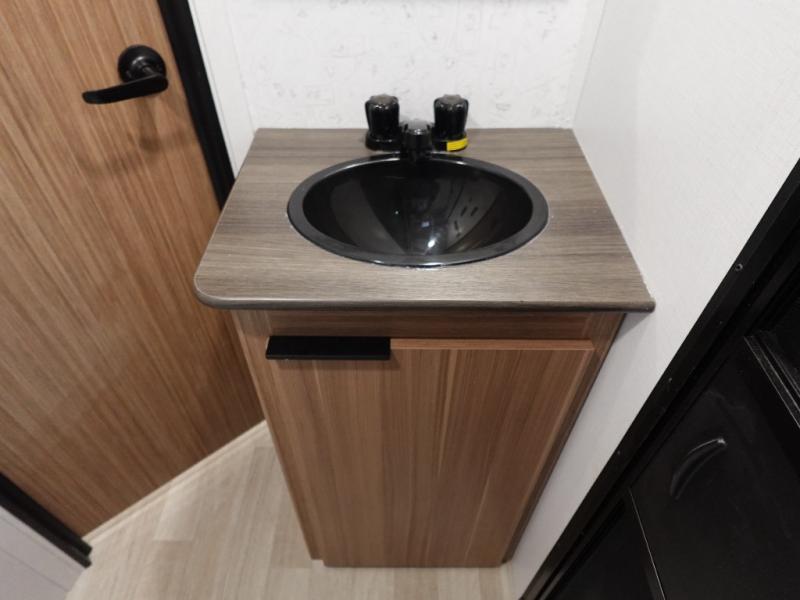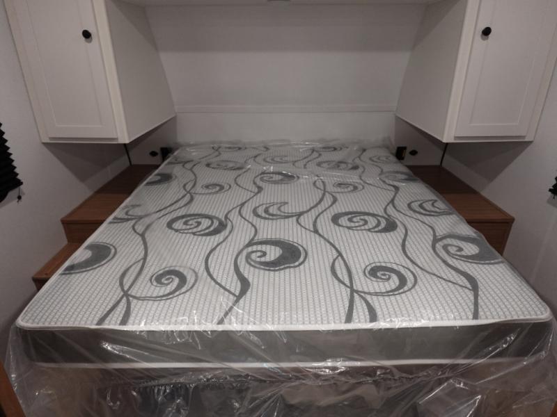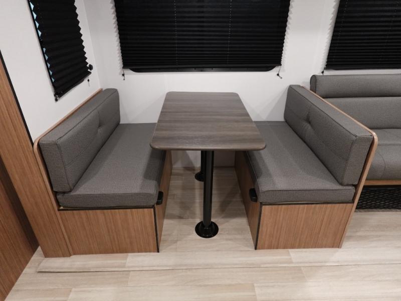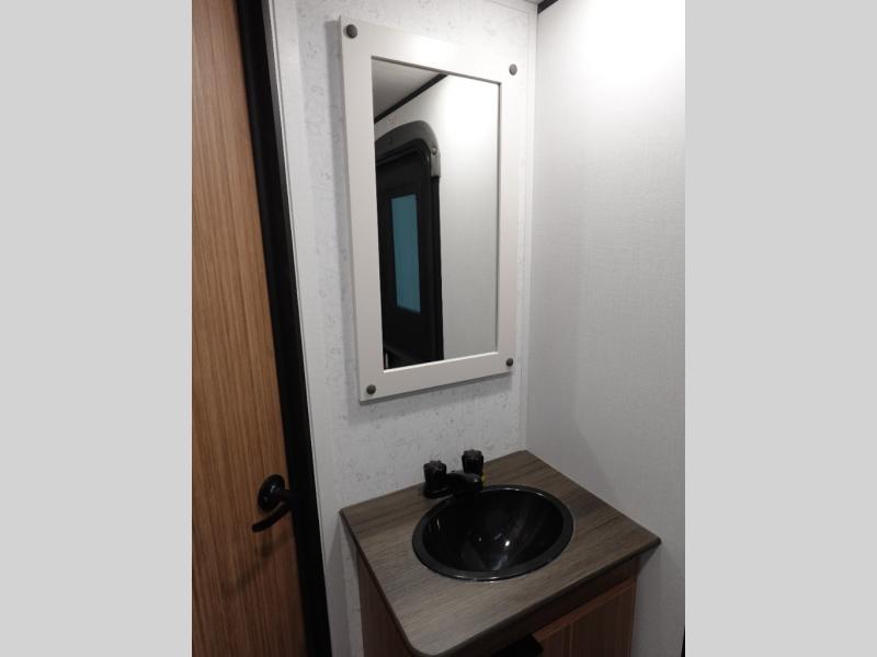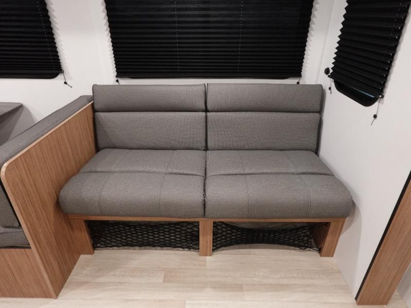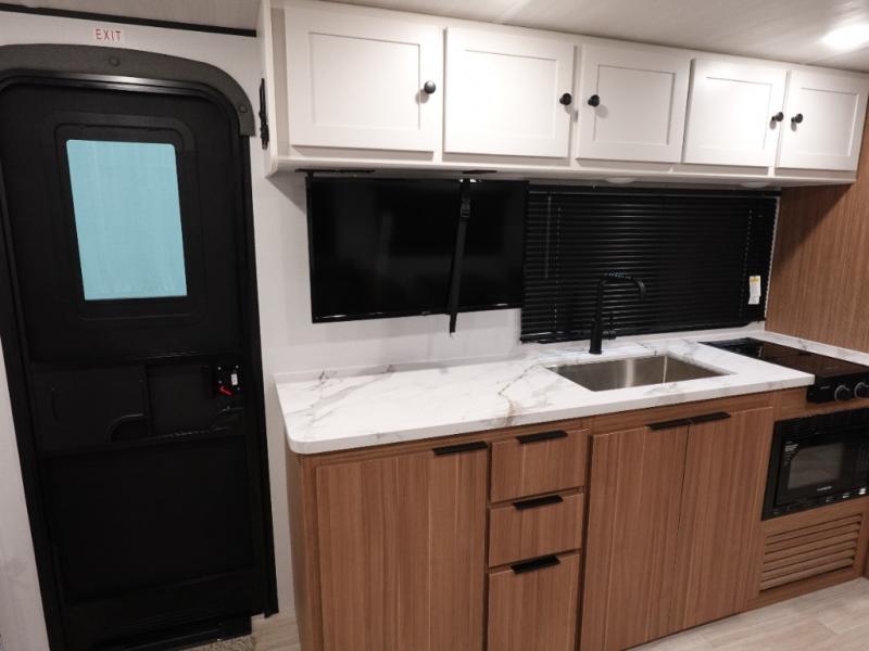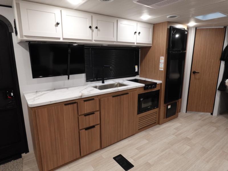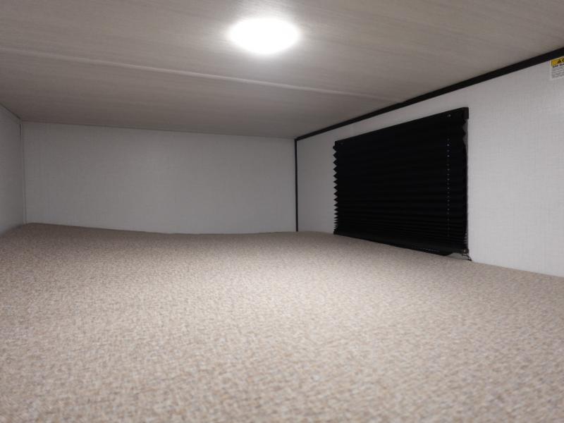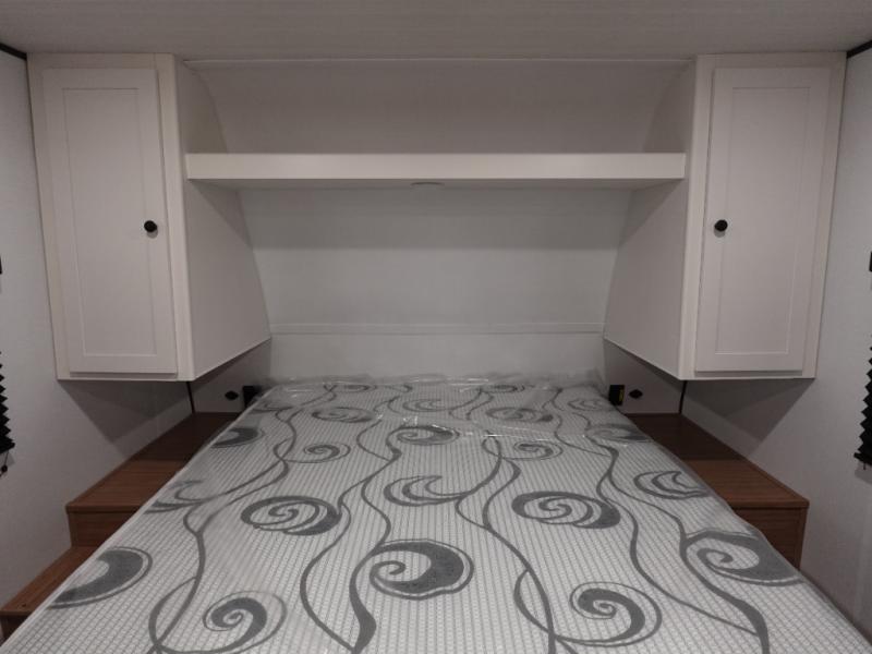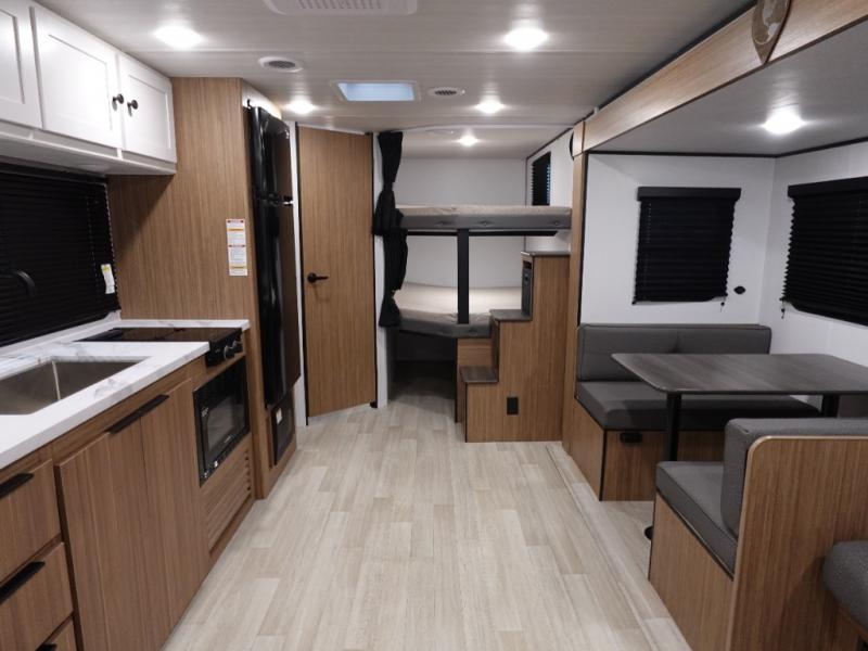The double-size bunks in this spacious travel trailer make it family approved and perfect for camping with a larger group. You'll have your own private bedroom up front with a queen bed and dual bedside wardrobes, and there are sliding doors to the bedroom which help save space. The main living area and kitchen is made open thanks to the large slide out which houses the booth dinette and jack knife sofa. The fully equipped kitchen lets the chef of your group whip up their best meals, and the full bath with its own exterior entry door is sure to come in handy!