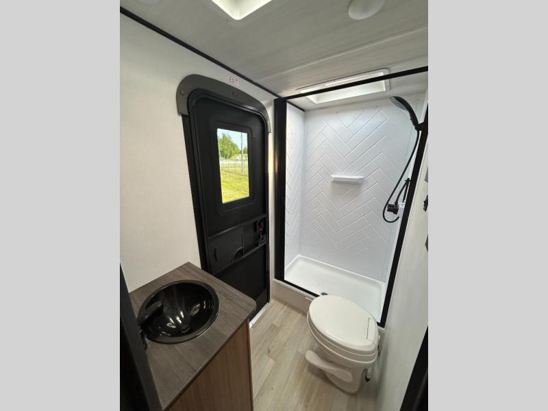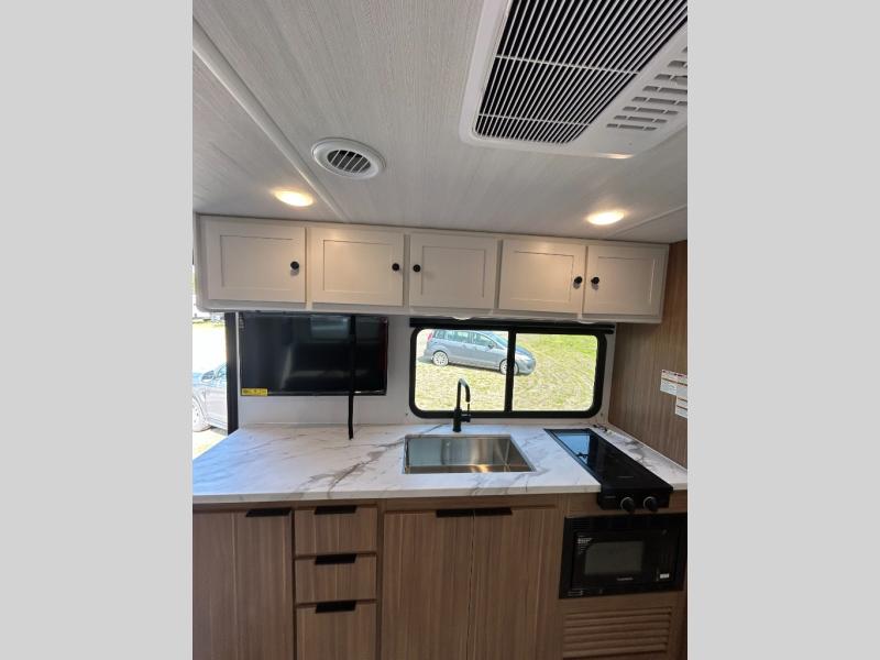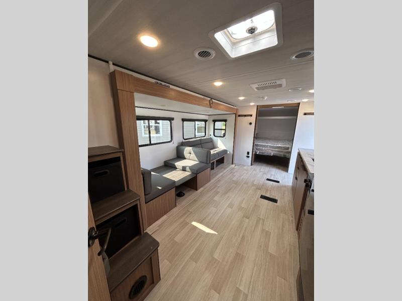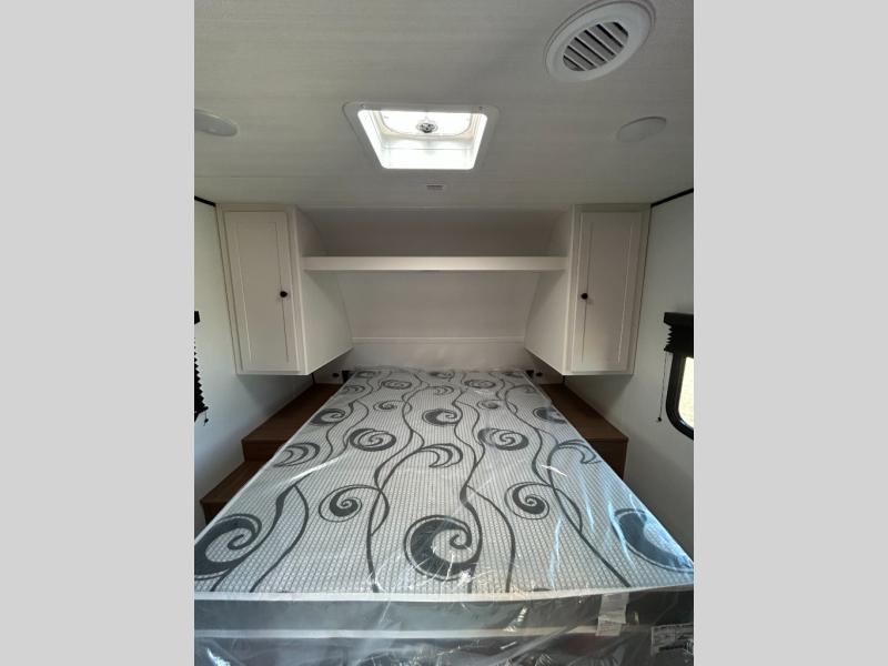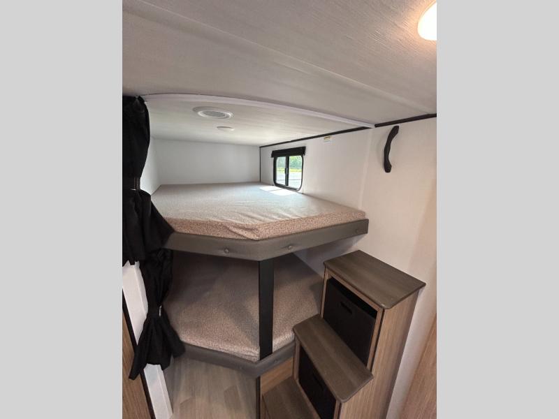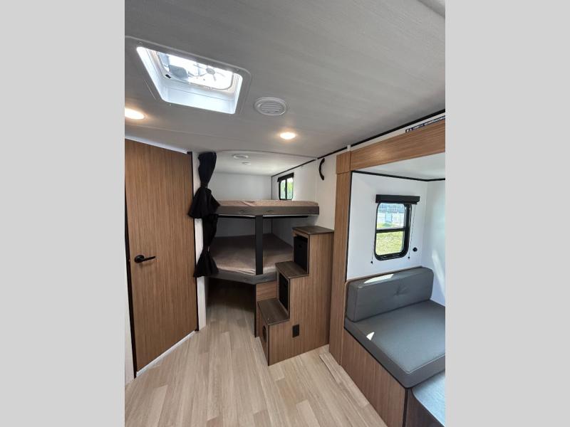 The double-size bunks in this spacious travel trailer make it family approved and perfect for camping with a larger group. You'll have your own private bedroom up front with a queen bed and dual bedside wardrobes, and there are sliding doors to the bedroom which help save space. The main living area and kitchen is made open thanks to the large slide out which houses the booth dinette and jack knife sofa. The fully equipped kitchen lets the chef of your group whip up their best meals, and the full bath with its own exterior entry door is sure to come in handy!