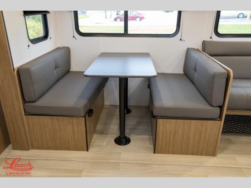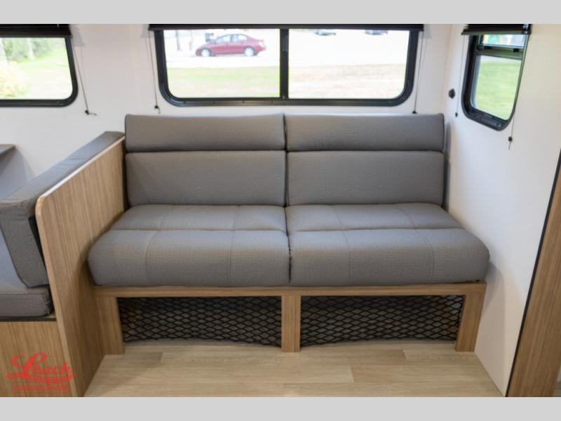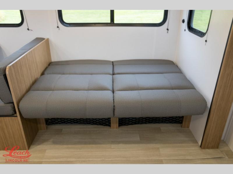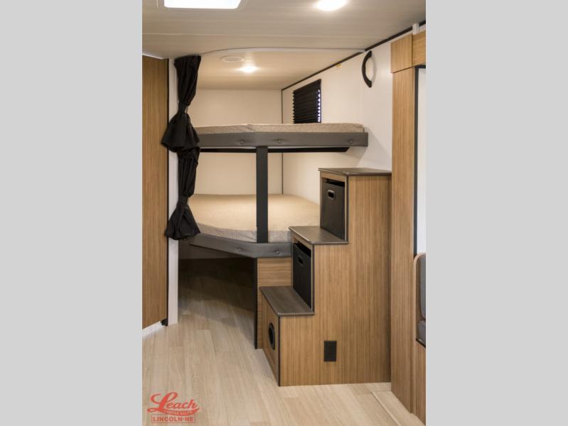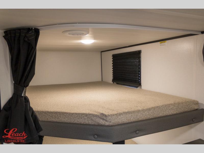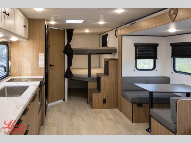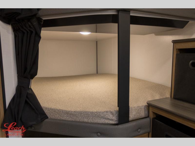 The double-size bunks in this spacious travel trailer make it family approved and perfect for camping with a larger group. You'll have your own private bedroom up front with a queen bed and dual bedside wardrobes, and there are sliding doors to the bedroom which help save space. The main living area and kitchen is made open thanks to the large slide out which houses the booth dinette and jack knife sofa. The fully equipped kitchen lets the chef of your group whip up their best meals, and the full bath with its own exterior entry door is sure to come in handy!
