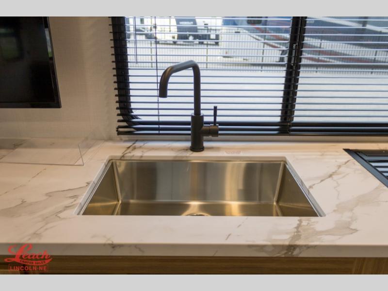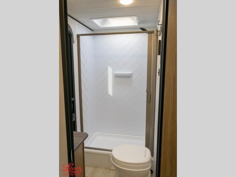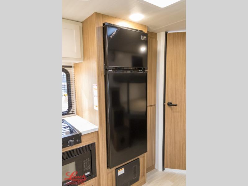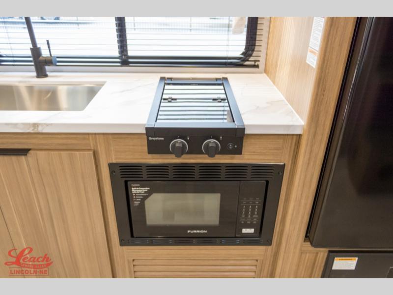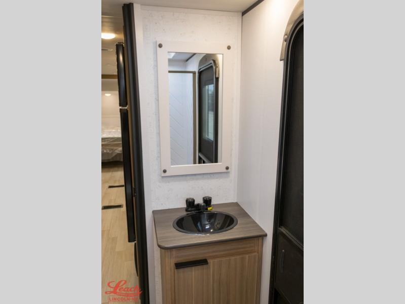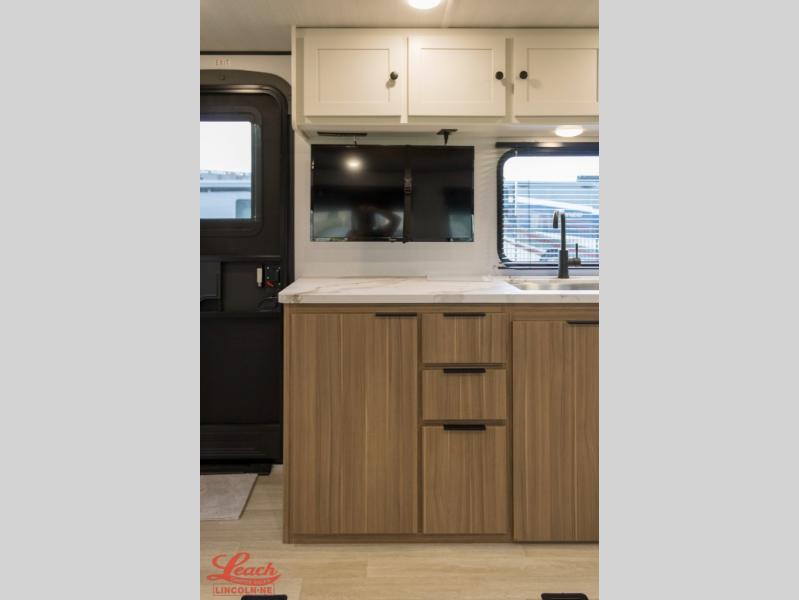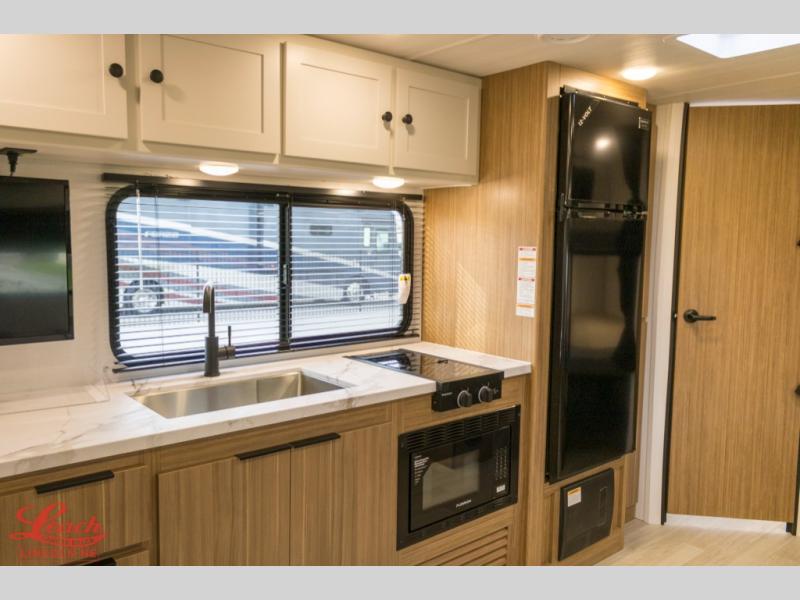 The double-size bunks in this spacious travel trailer make it family approved and perfect for camping with a larger group. You'll have your own private bedroom up front with a queen bed and dual bedside wardrobes, and there are sliding doors to the bedroom which help save space. The main living area and kitchen is made open thanks to the large slide out which houses the booth dinette and jack knife sofa. The fully equipped kitchen lets the chef of your group whip up their best meals, and the full bath with its own exterior entry door is sure to come in handy!