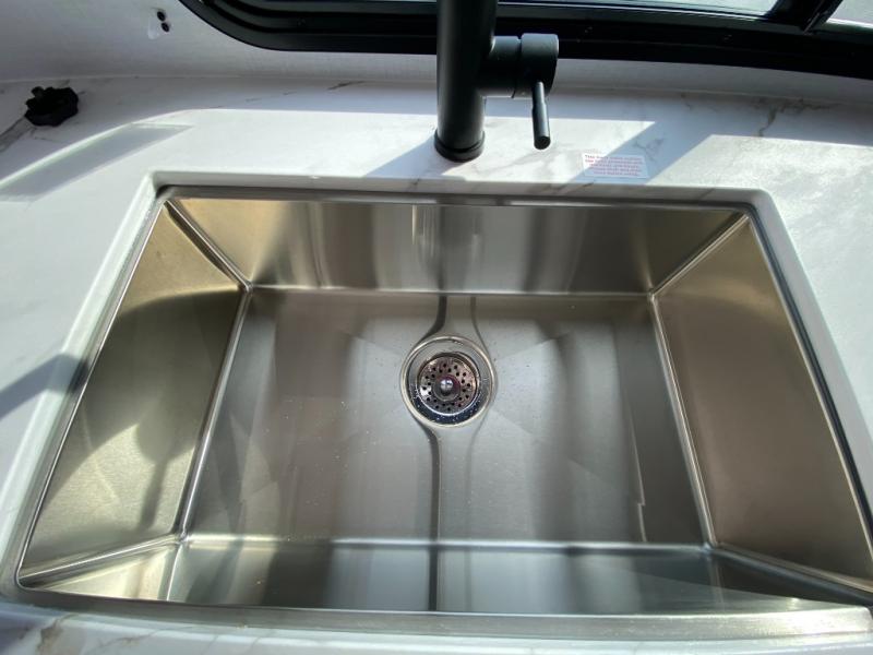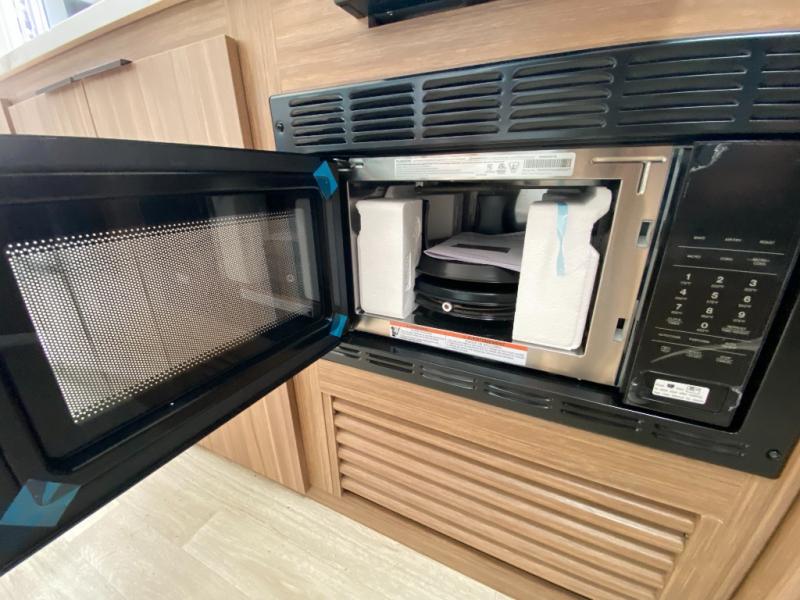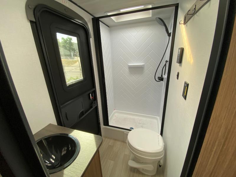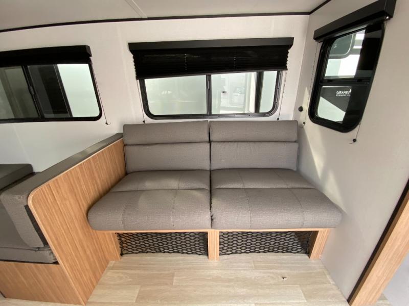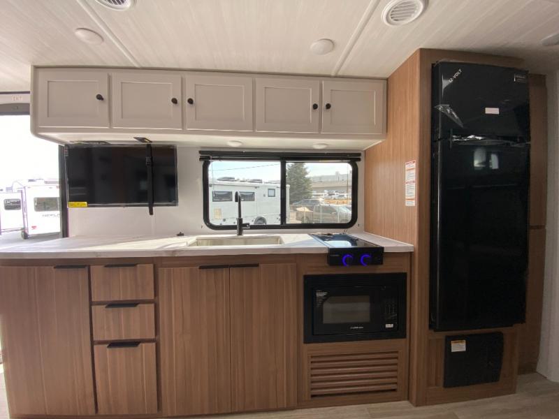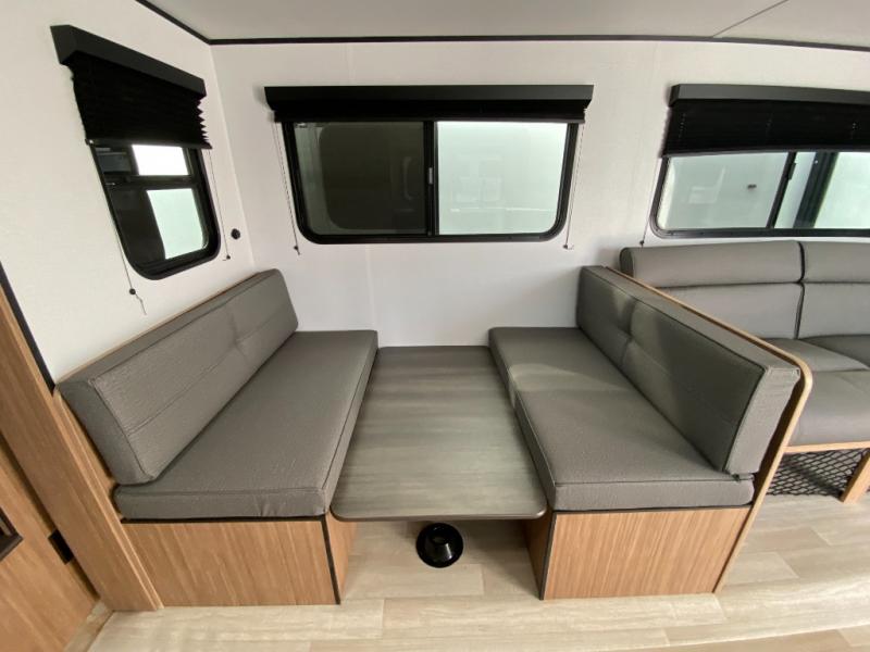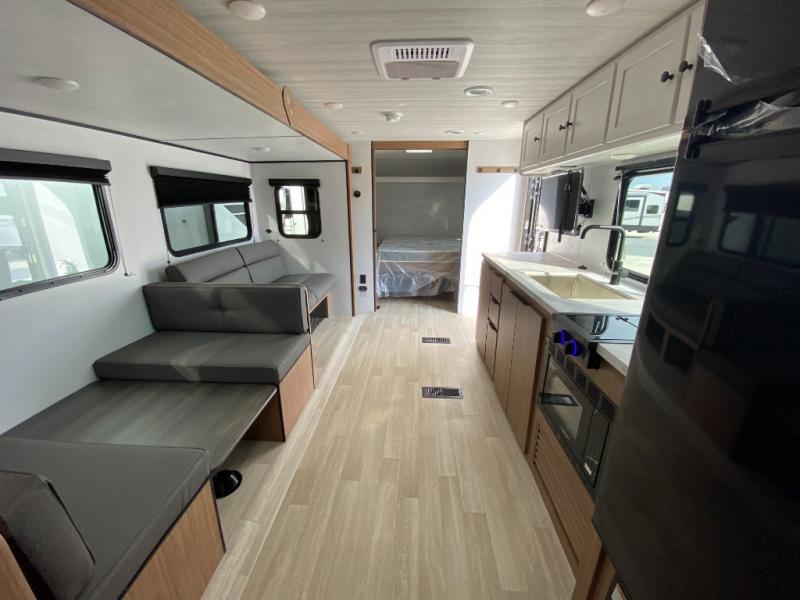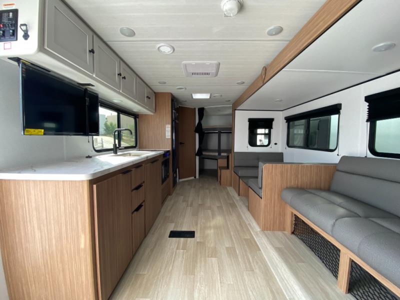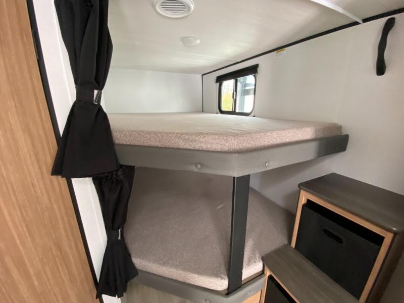 The double-size bunks in this spacious travel trailer make it family approved and perfect for camping with a larger group. You'll have your own private bedroom up front with a queen bed and dual bedside wardrobes, and there are sliding doors to the bedroom which help save space. The main living area and kitchen is made open thanks to the large slide out which houses the booth dinette and jack knife sofa. The fully equipped kitchen lets the chef of your group whip up their best meals, and the full bath with its own exterior entry door is sure to come in handy!
