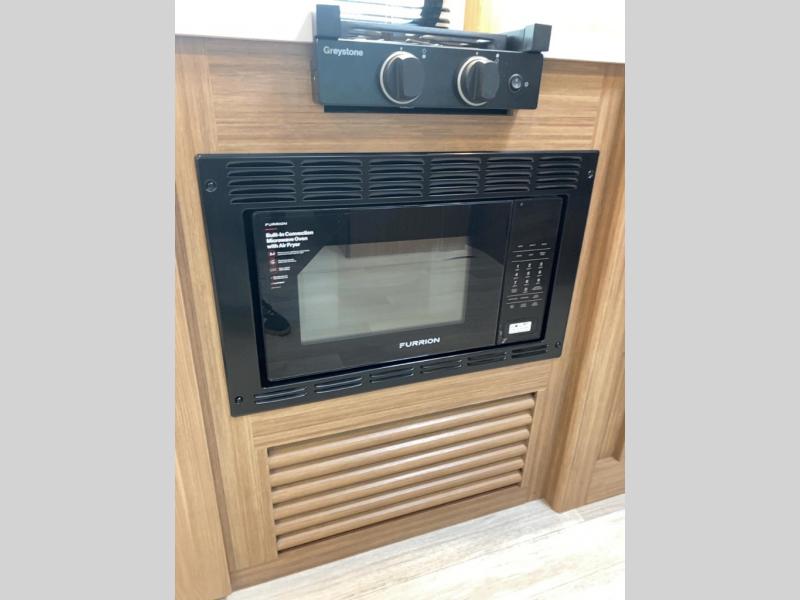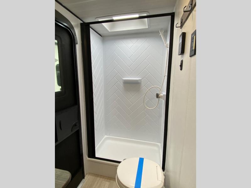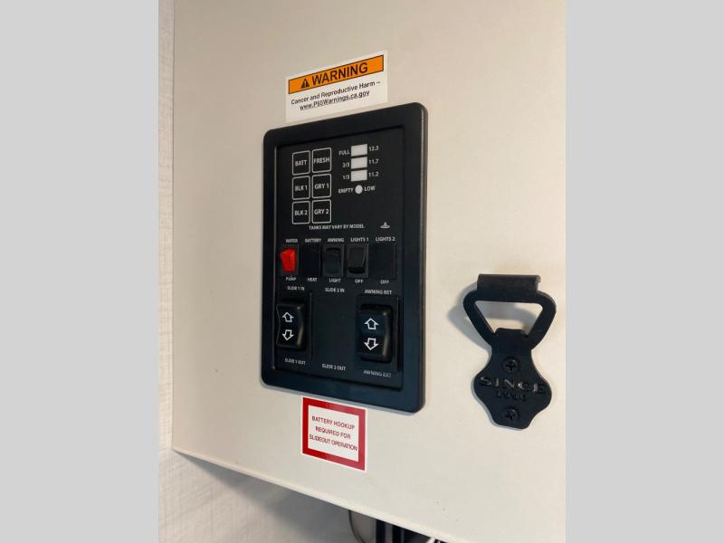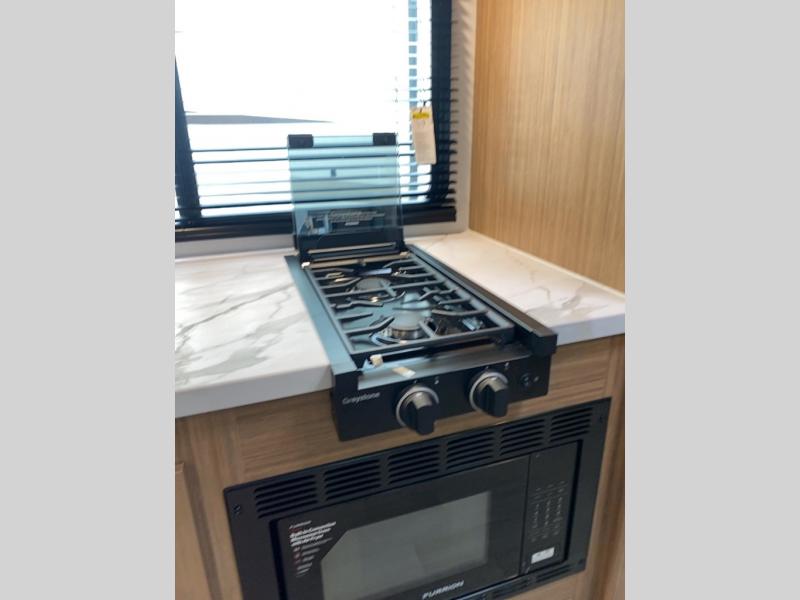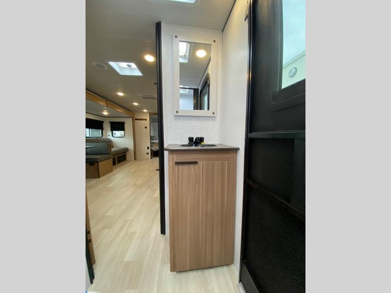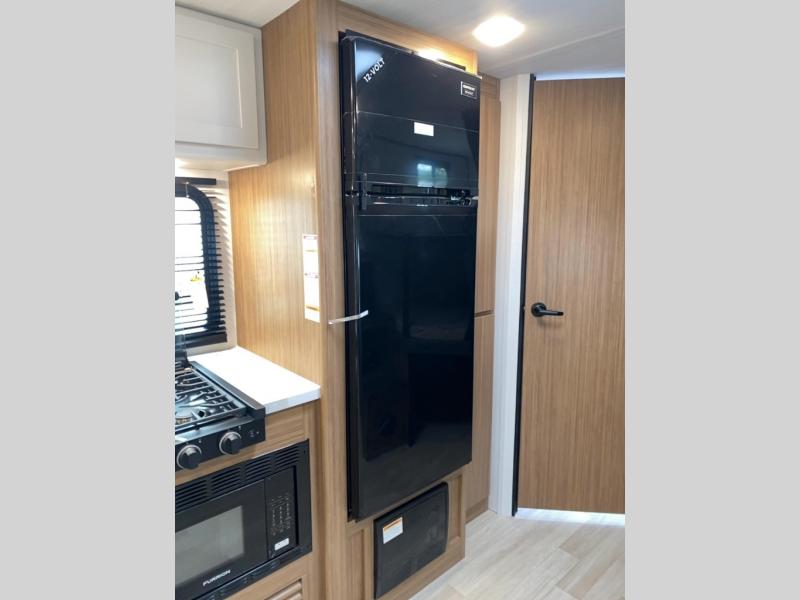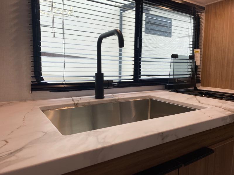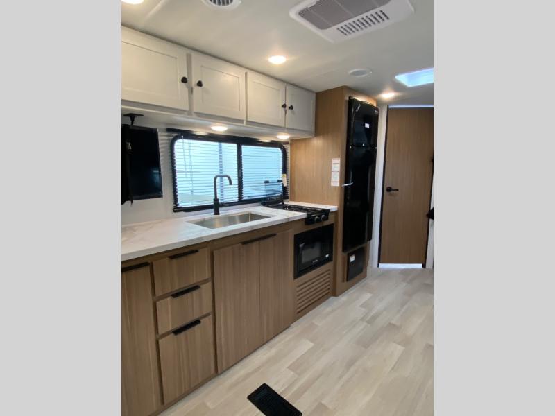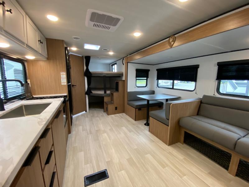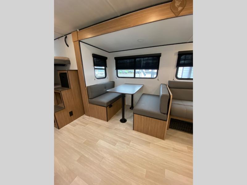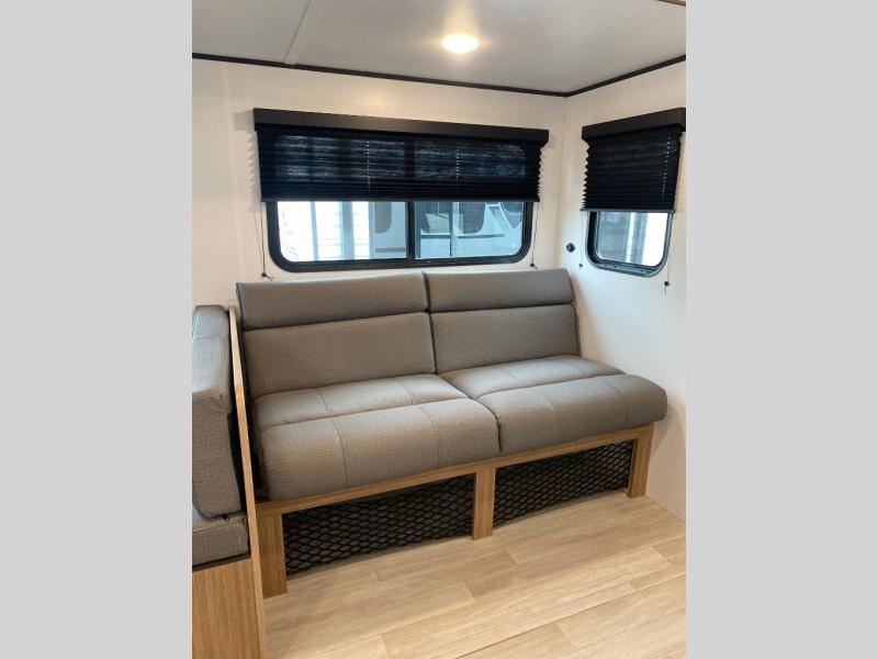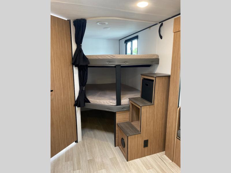 The double-size bunks in this spacious travel trailer make it family approved and perfect for camping with a larger group. You'll have your own private bedroom up front with a queen bed and dual bedside wardrobes, and there are sliding doors to the bedroom which help save space. The main living area and kitchen is made open thanks to the large slide out which houses the booth dinette and jack knife sofa. The fully equipped kitchen lets the chef of your group whip up their best meals, and the full bath with its own exterior entry door is sure to come in handy!