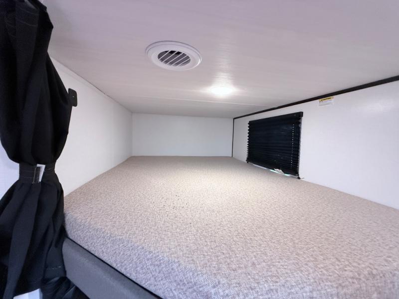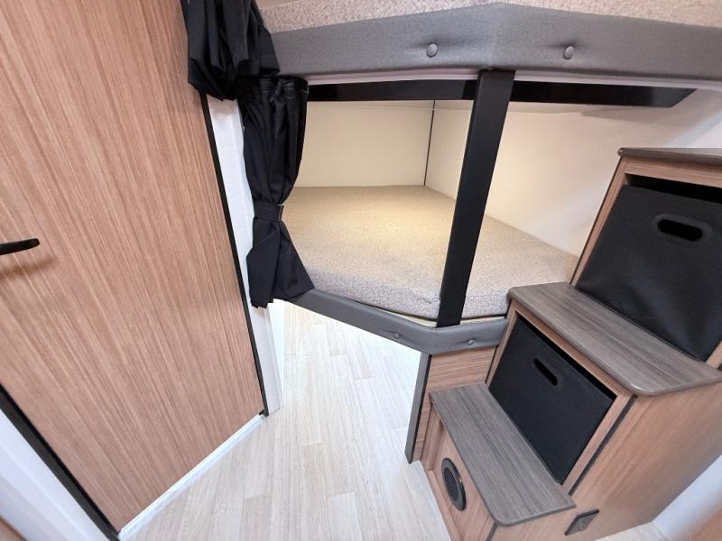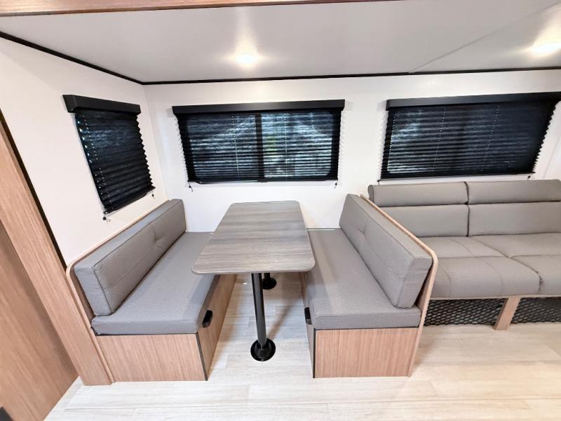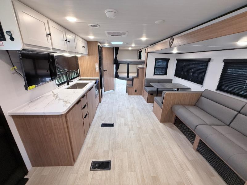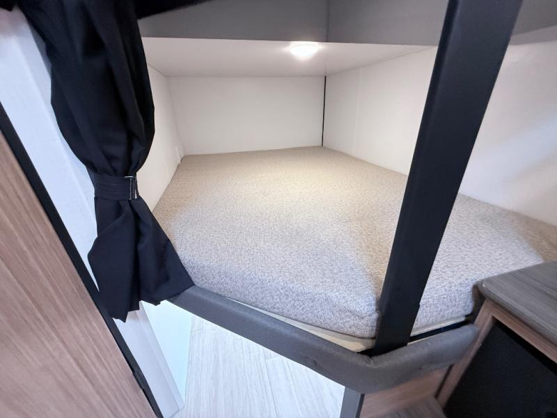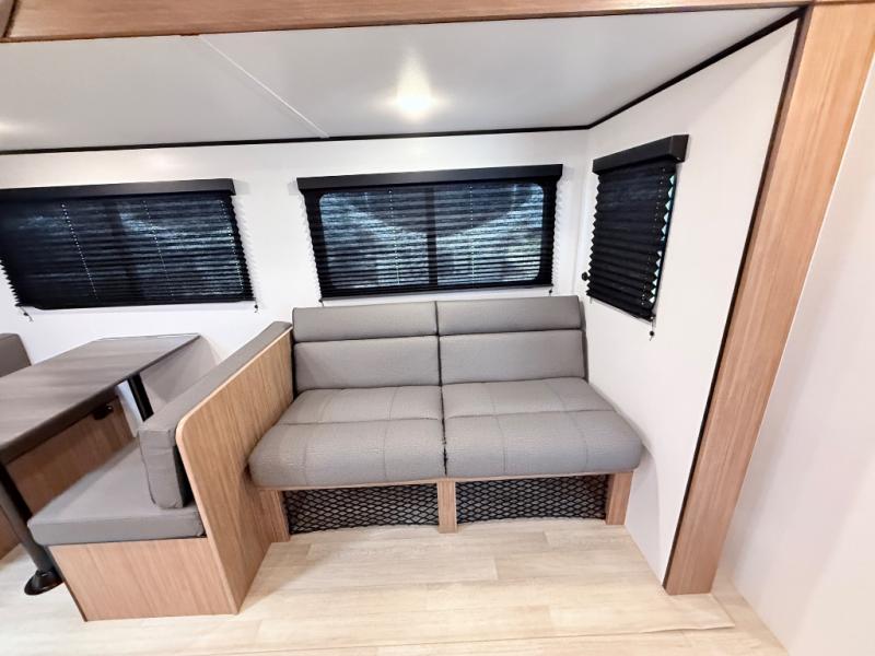 The double-size bunks in this spacious travel trailer make it family approved and perfect for camping with a larger group. You'll have your own private bedroom up front with a queen bed and dual bedside wardrobes, and there are sliding doors to the bedroom which help save space. The main living area and kitchen is made open thanks to the large slide out which houses the booth dinette and jack knife sofa. The fully equipped kitchen lets the chef of your group whip up their best meals, and the full bath with its own exterior entry door is sure to come in handy!