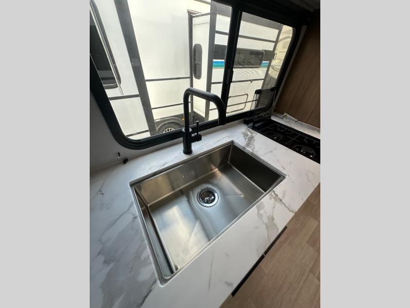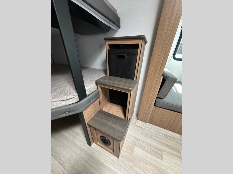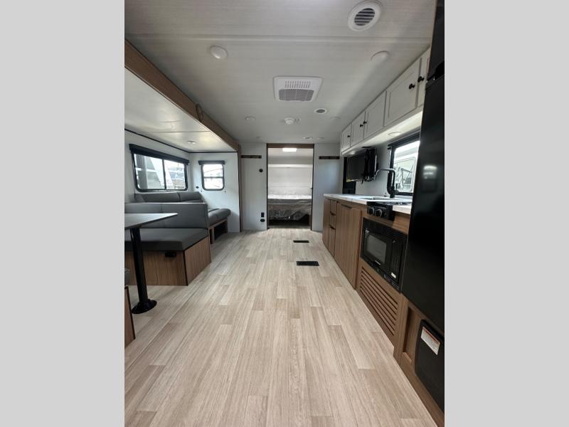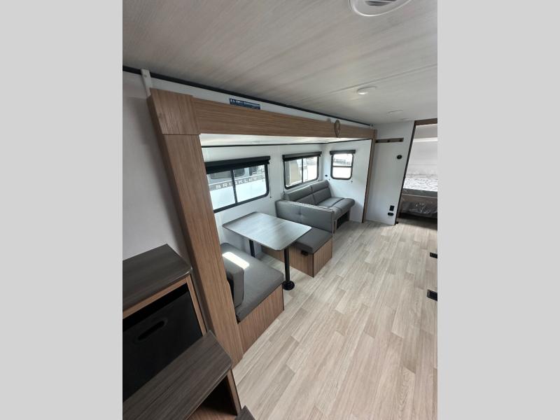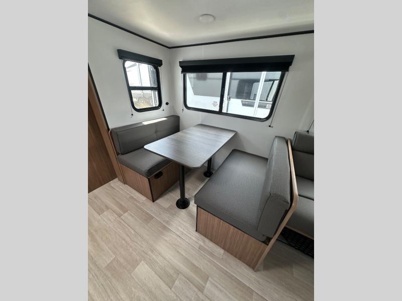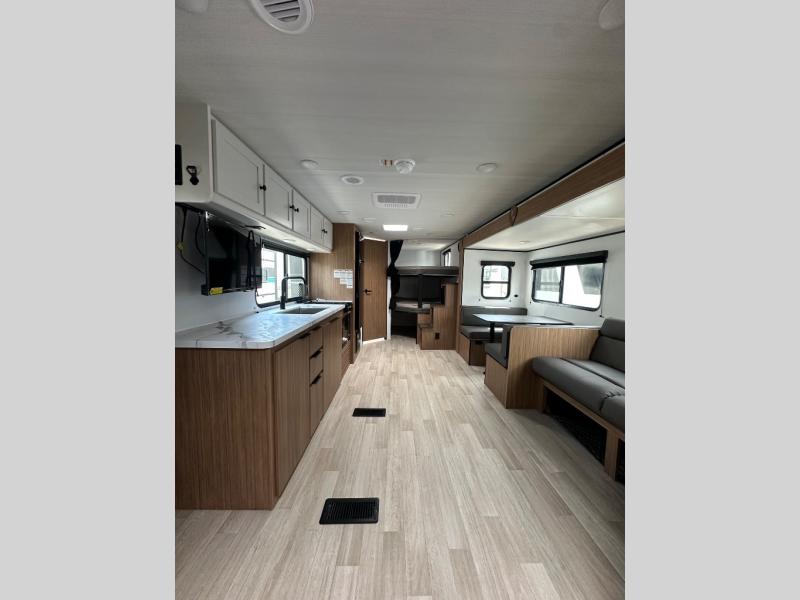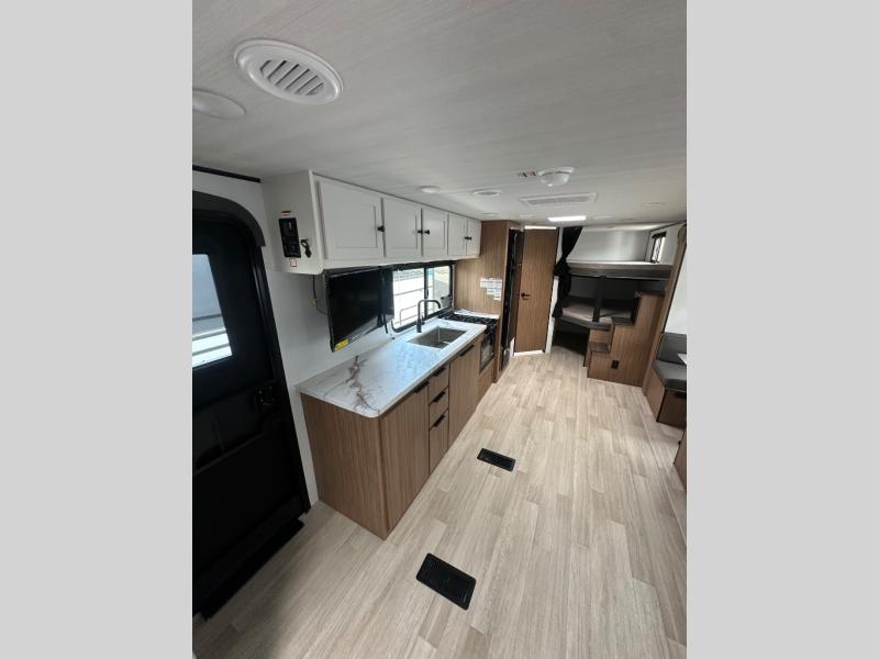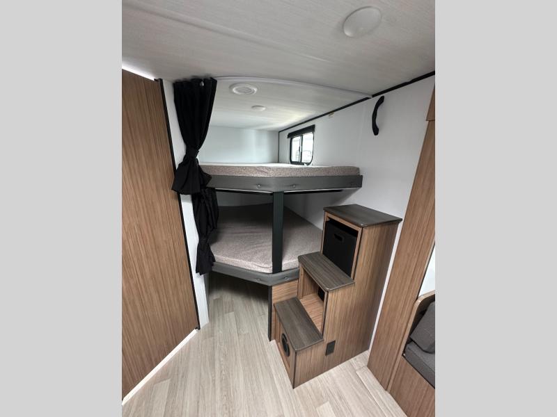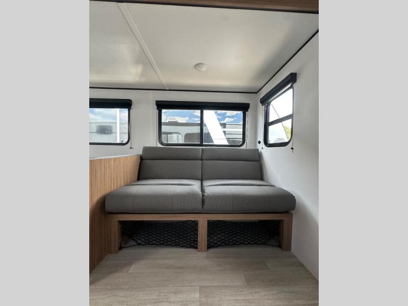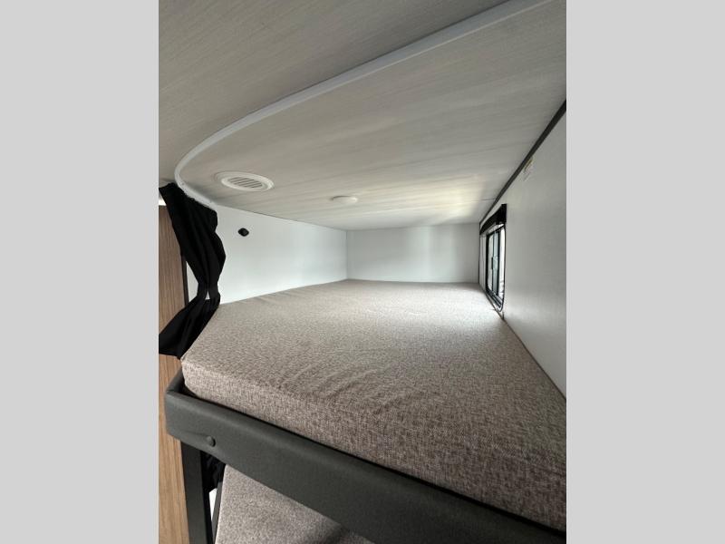 The double-size bunks in this spacious travel trailer make it family approved and perfect for camping with a larger group. You'll have your own private bedroom up front with a queen bed and dual bedside wardrobes, and there are sliding doors to the bedroom which help save space. The main living area and kitchen is made open thanks to the large slide out which houses the booth dinette and jack knife sofa. The fully equipped kitchen lets the chef of your group whip up their best meals, and the full bath with its own exterior entry door is sure to come in handy!