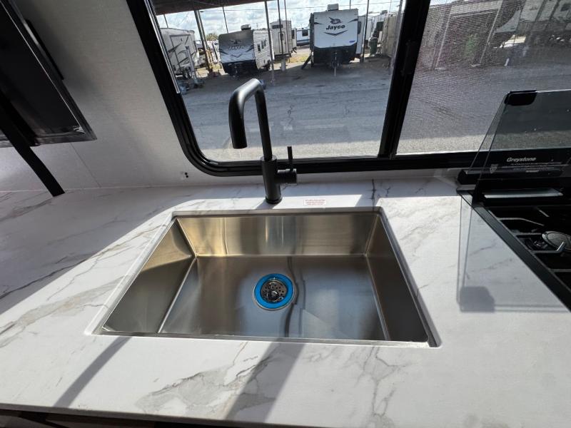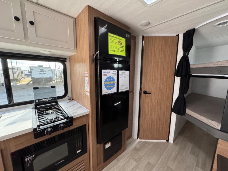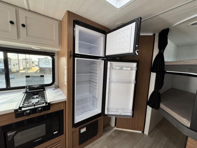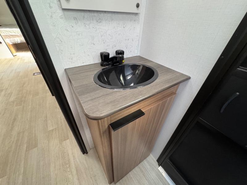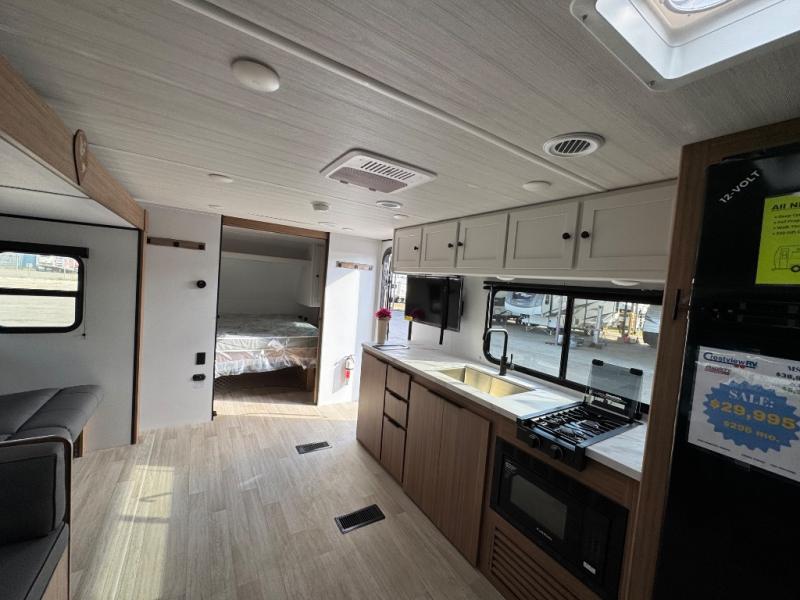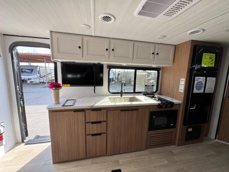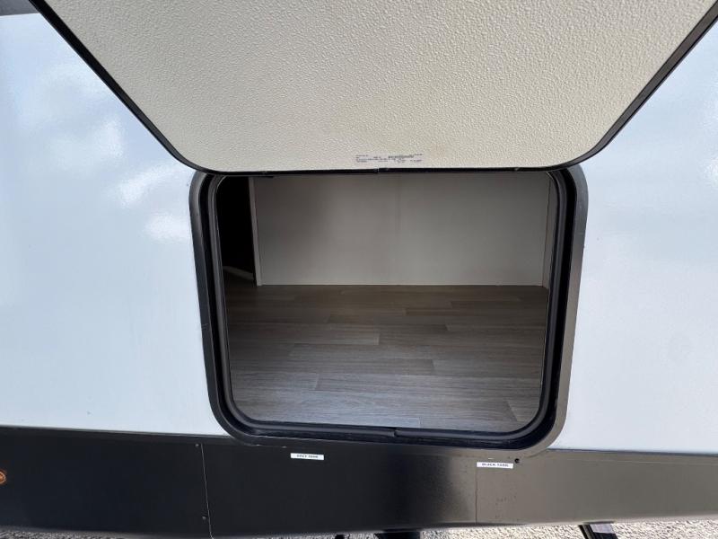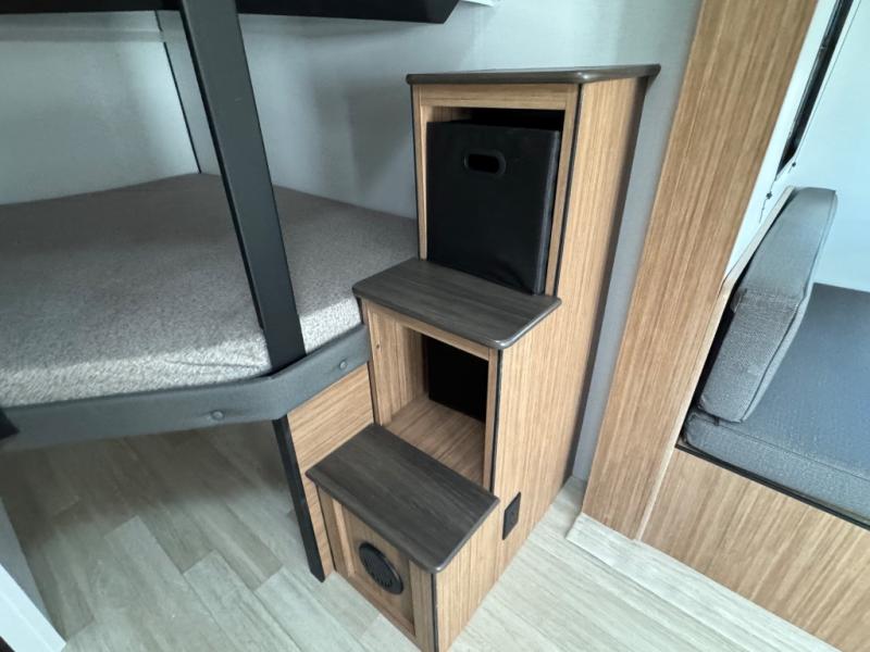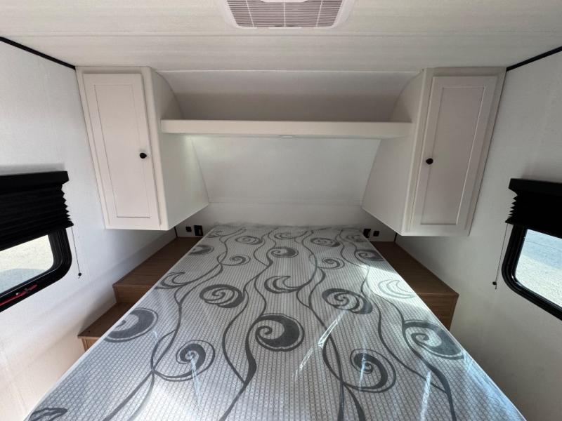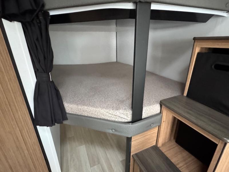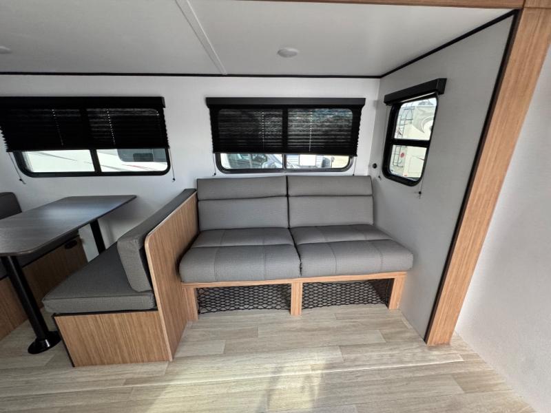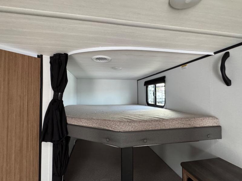 The double-size bunks in this spacious travel trailer make it family approved and perfect for camping with a larger group. You'll have your own private bedroom up front with a queen bed and dual bedside wardrobes, and there are sliding doors to the bedroom which help save space. The main living area and kitchen is made open thanks to the large slide out which houses the booth dinette and jack knife sofa. The fully equipped kitchen lets the chef of your group whip up their best meals, and the full bath with its own exterior entry door is sure to come in handy!