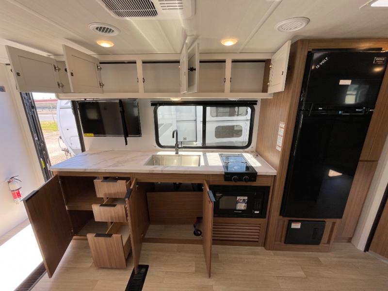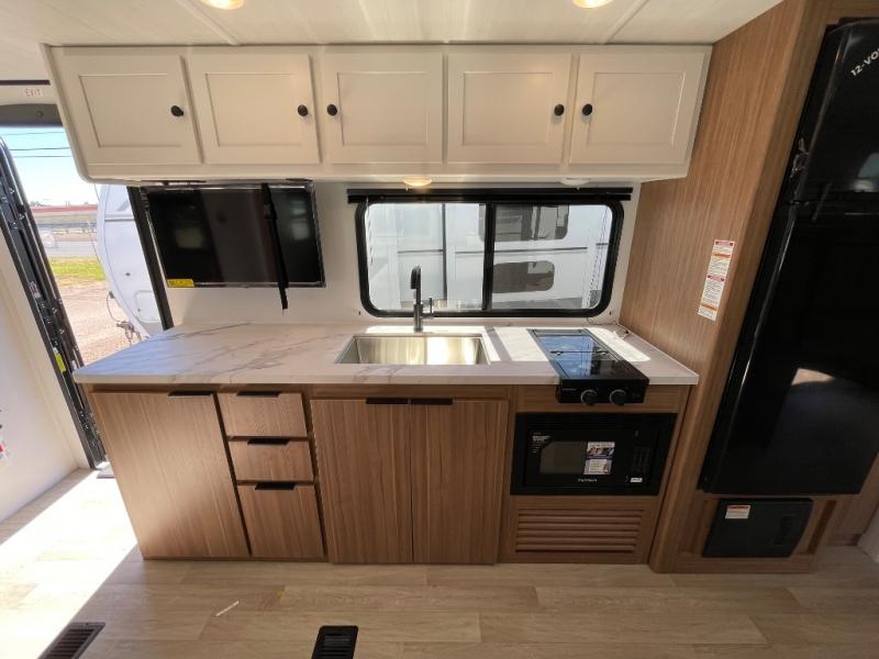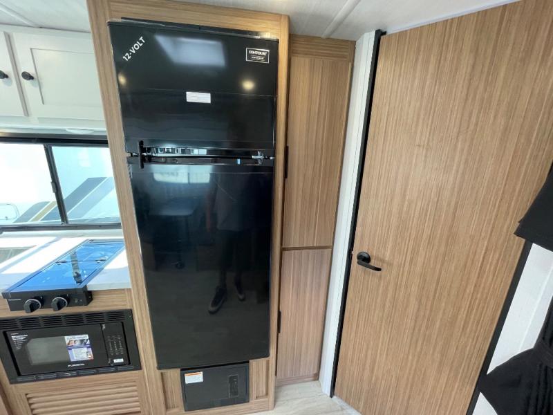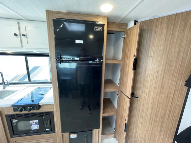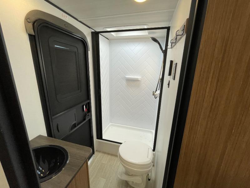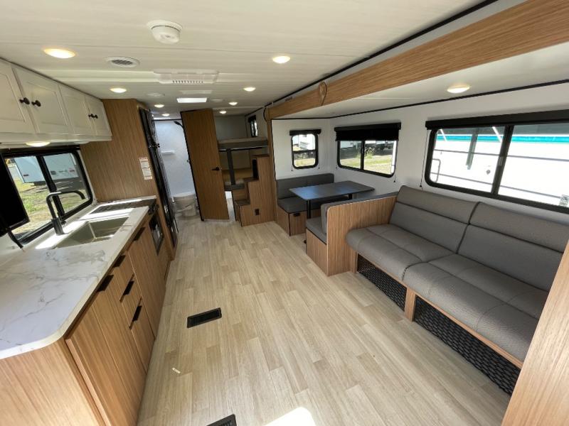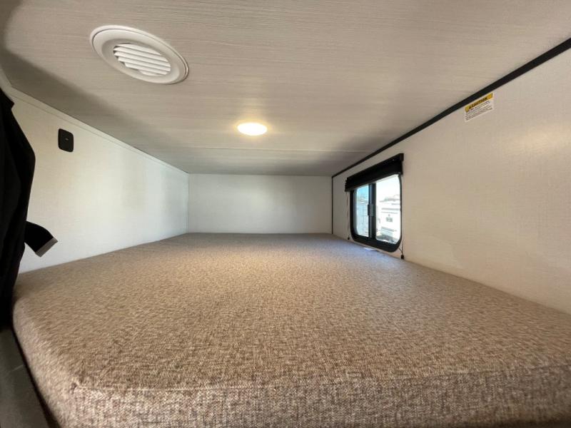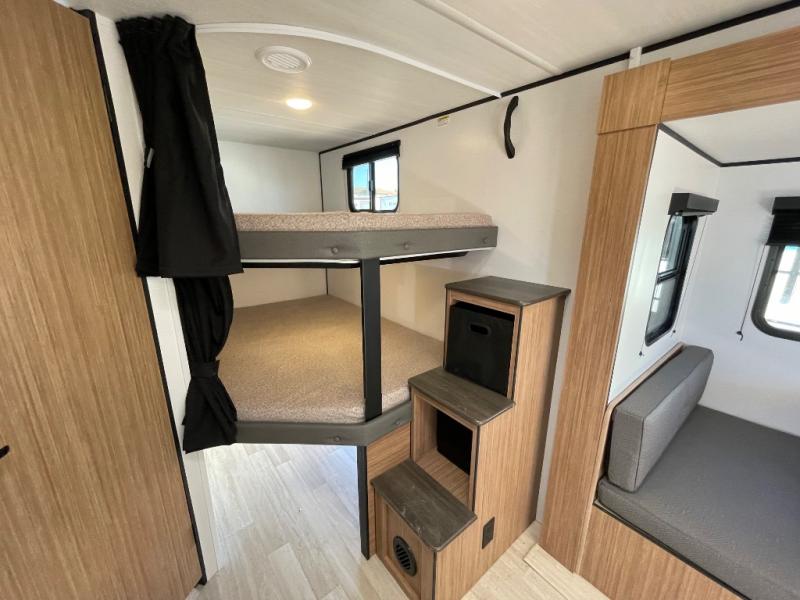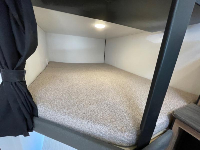 The double-size bunks in this spacious travel trailer make it family approved and perfect for camping with a larger group. You'll have your own private bedroom up front with a queen bed and dual bedside wardrobes, and there are sliding doors to the bedroom which help save space. The main living area and kitchen is made open thanks to the large slide out which houses the booth dinette and jack knife sofa. The fully equipped kitchen lets the chef of your group whip up their best meals, and the full bath with its own exterior entry door is sure to come in handy!