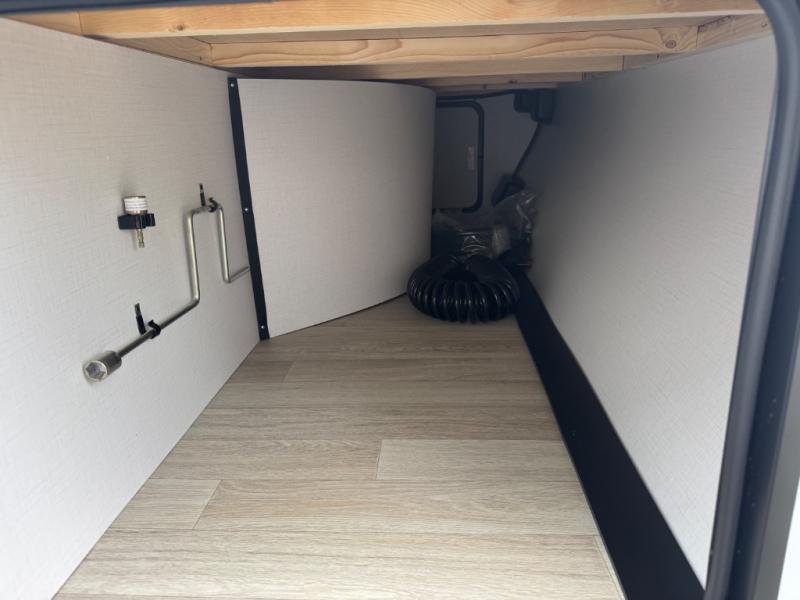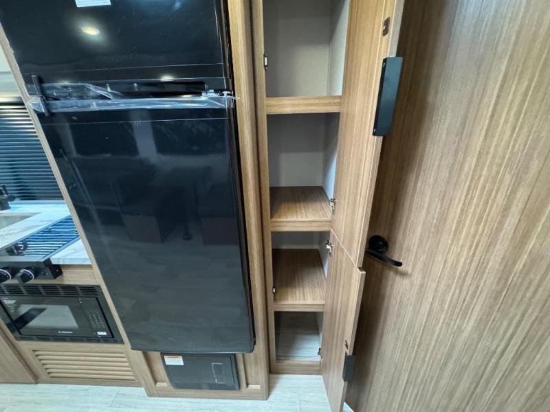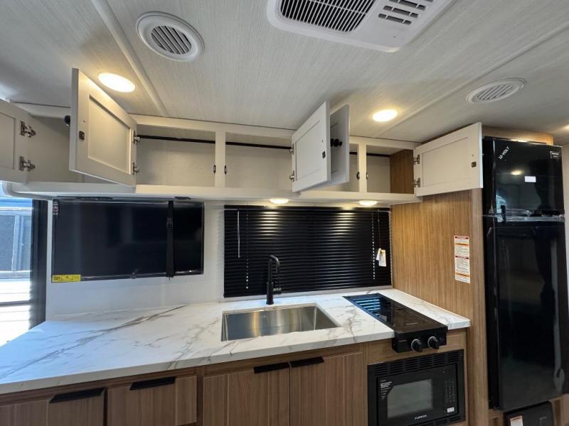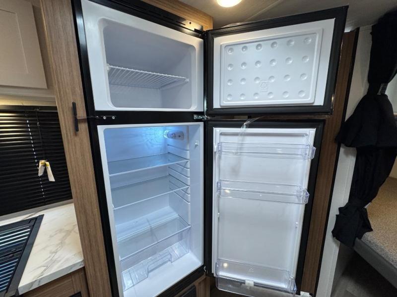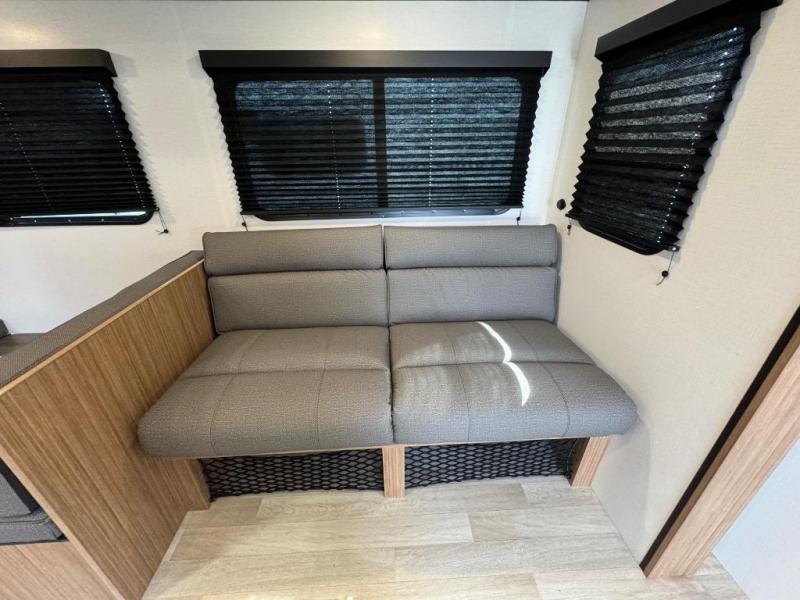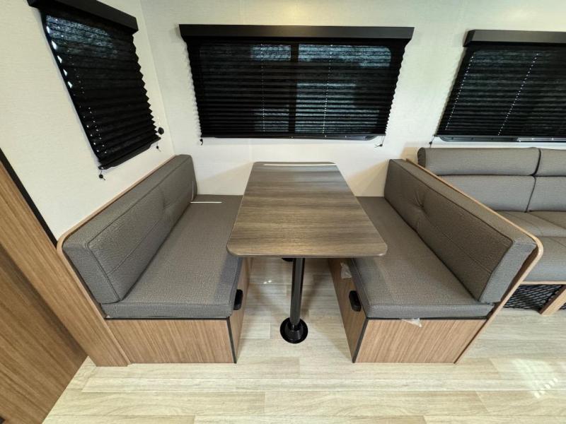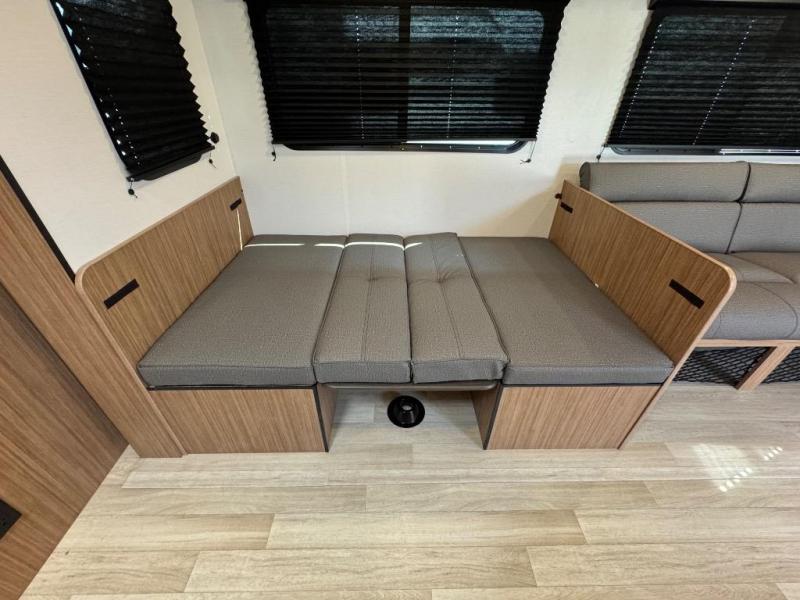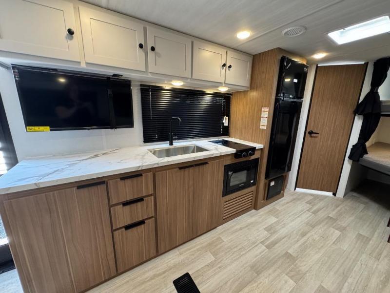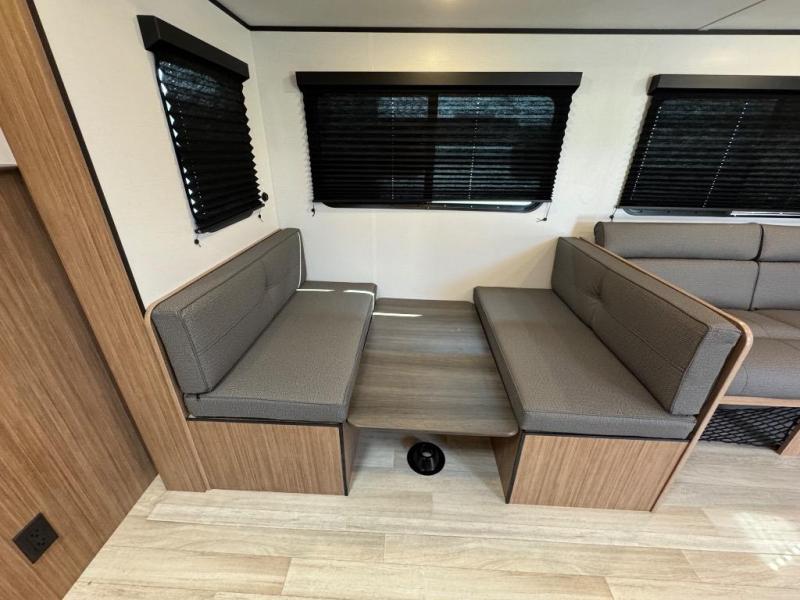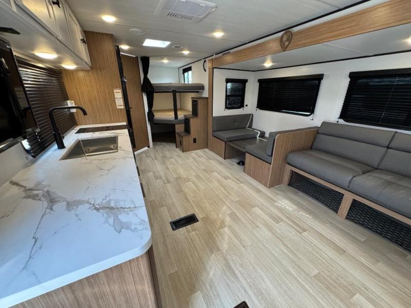 The double-size bunks in this spacious travel trailer make it family approved and perfect for camping with a larger group. You'll have your own private bedroom up front with a queen bed and dual bedside wardrobes, and there are sliding doors to the bedroom which help save space. The main living area and kitchen is made open thanks to the large slide out which houses the booth dinette and jack knife sofa. The fully equipped kitchen lets the chef of your group whip up their best meals, and the full bath with its own exterior entry door is sure to come in handy!