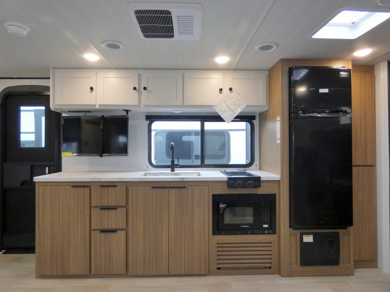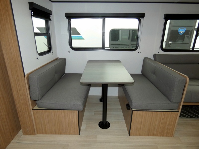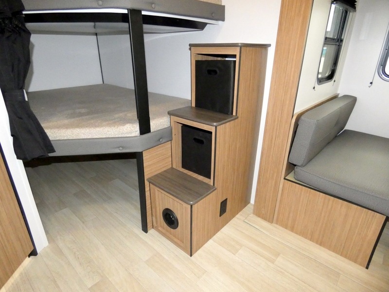 The double-size bunks in this spacious travel trailer make it family approved and perfect for camping with a larger group. You'll have your own private bedroom up front with a queen bed and dual bedside wardrobes, and there are sliding doors to the bedroom which help save space. The main living area and kitchen is made open thanks to the large slide out which houses the booth dinette and jack knife sofa. The fully equipped kitchen lets the chef of your group whip up their best meals, and the full bath with its own exterior entry door is sure to come in handy!