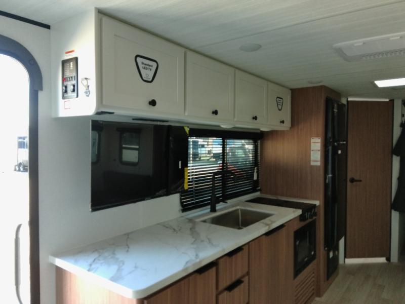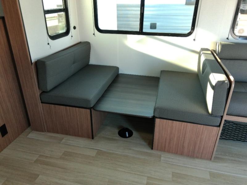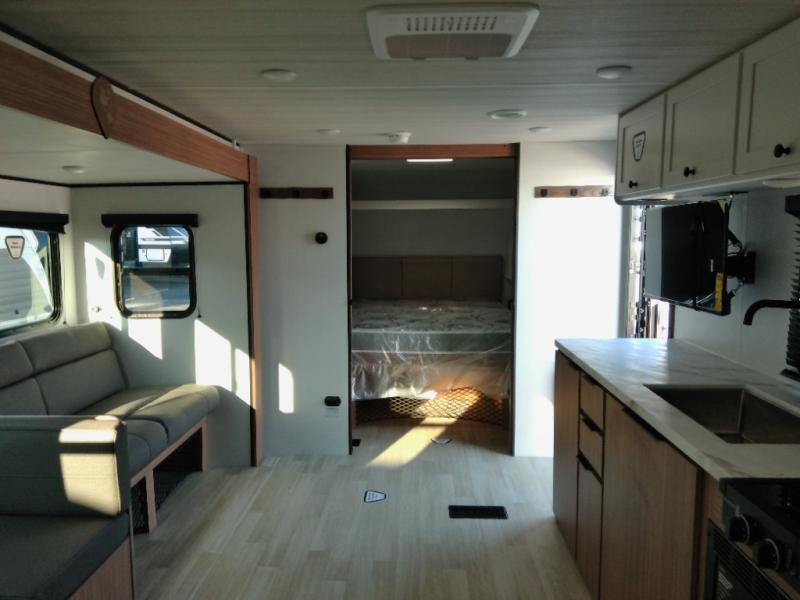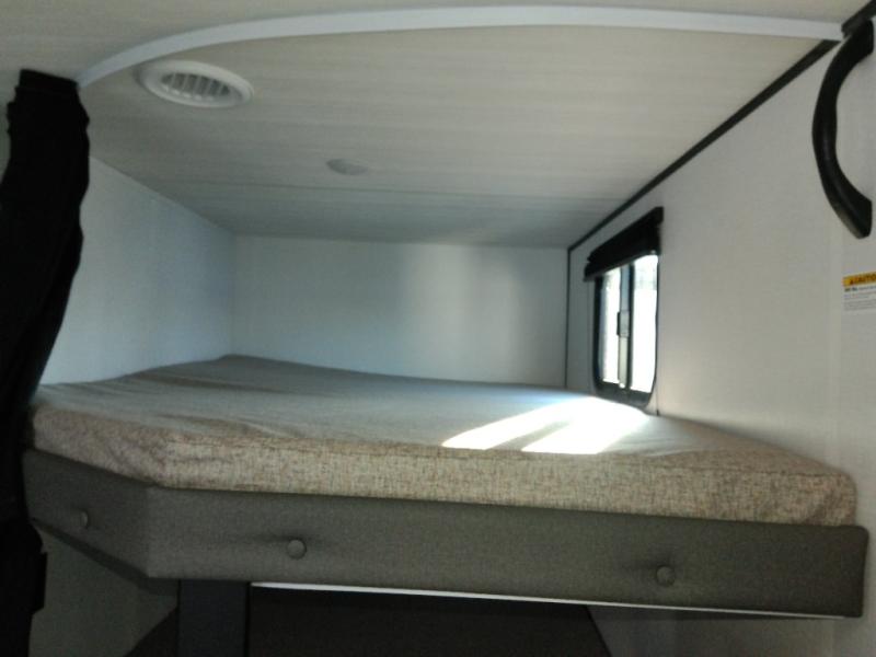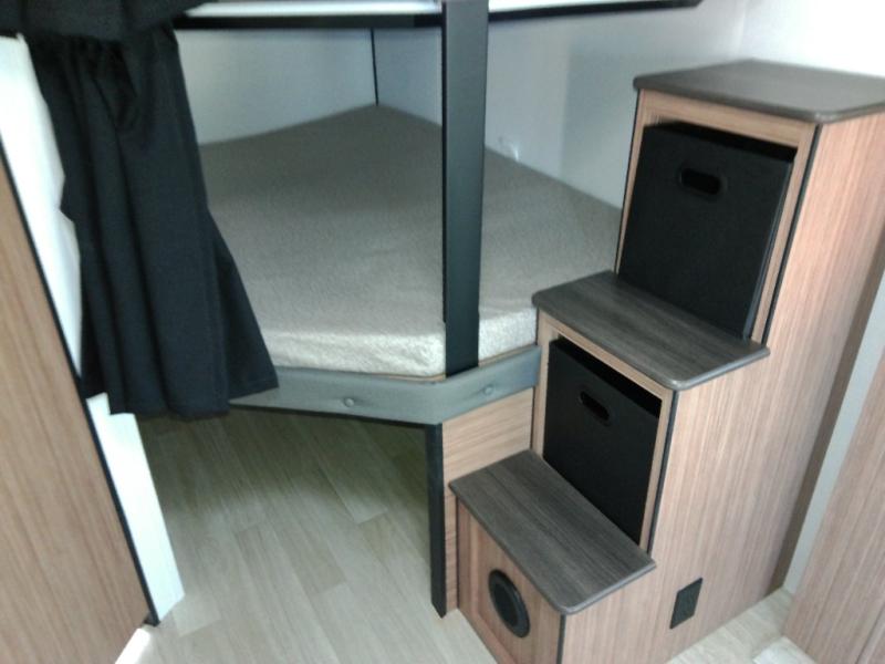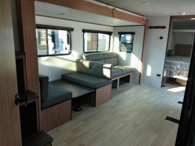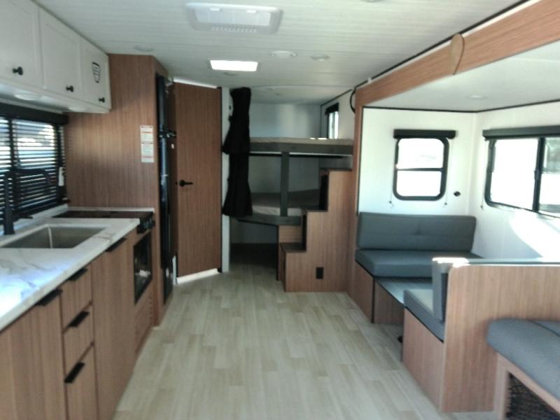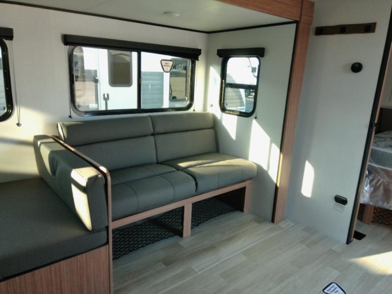 The double-size bunks in this spacious travel trailer make it family approved and perfect for camping with a larger group. You'll have your own private bedroom up front with a queen bed and dual bedside wardrobes, and there are sliding doors to the bedroom which help save space. The main living area and kitchen is made open thanks to the large slide out which houses the booth dinette and jack knife sofa. The fully equipped kitchen lets the chef of your group whip up their best meals, and the full bath with its own exterior entry door is sure to come in handy!