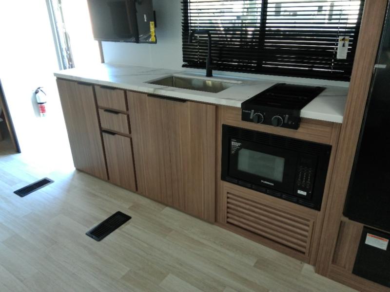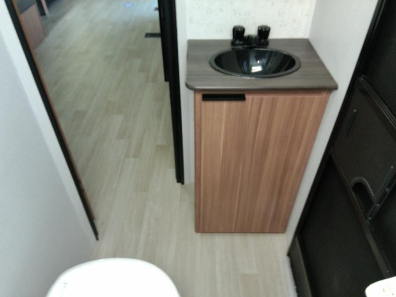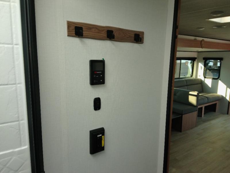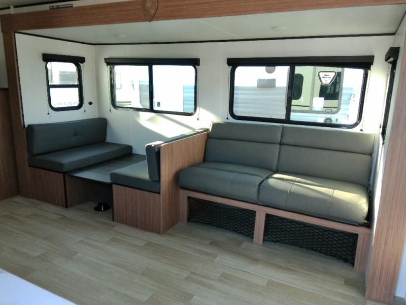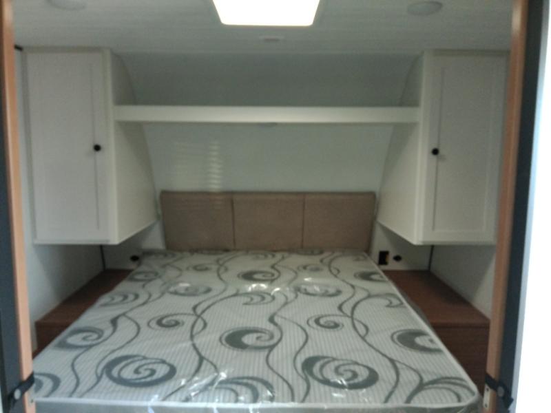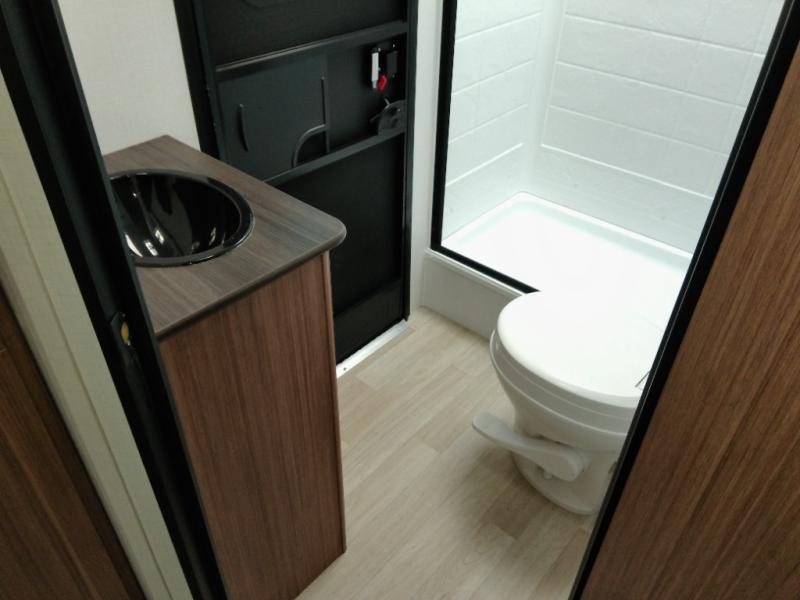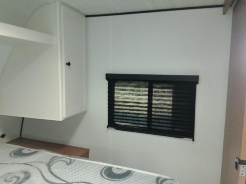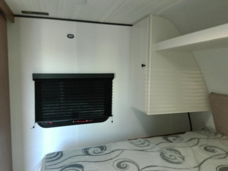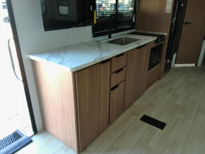 The double-size bunks in this spacious travel trailer make it family approved and perfect for camping with a larger group. You'll have your own private bedroom up front with a queen bed and dual bedside wardrobes, and there are sliding doors to the bedroom which help save space. The main living area and kitchen is made open thanks to the large slide out which houses the booth dinette and jack knife sofa. The fully equipped kitchen lets the chef of your group whip up their best meals, and the full bath with its own exterior entry door is sure to come in handy!