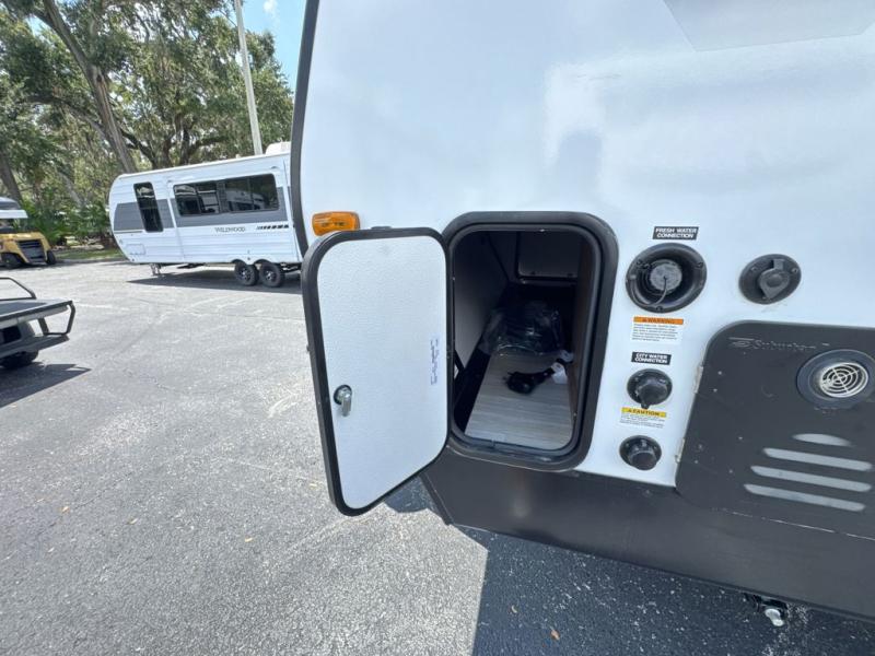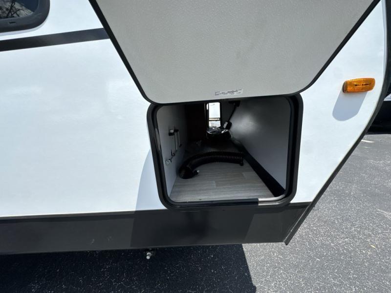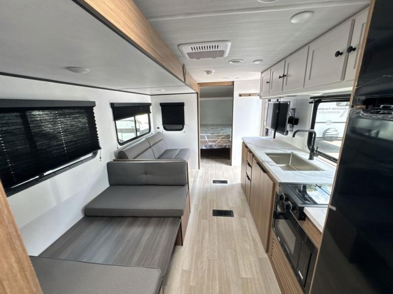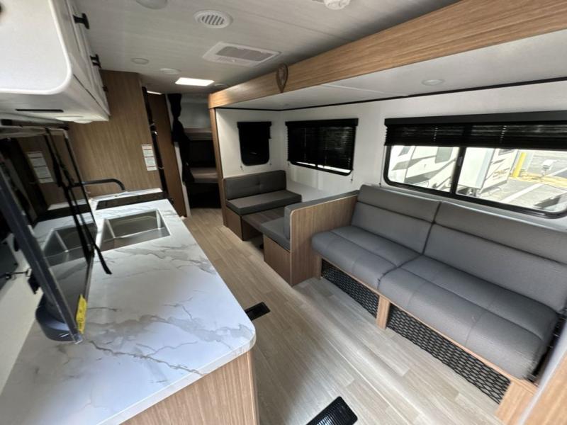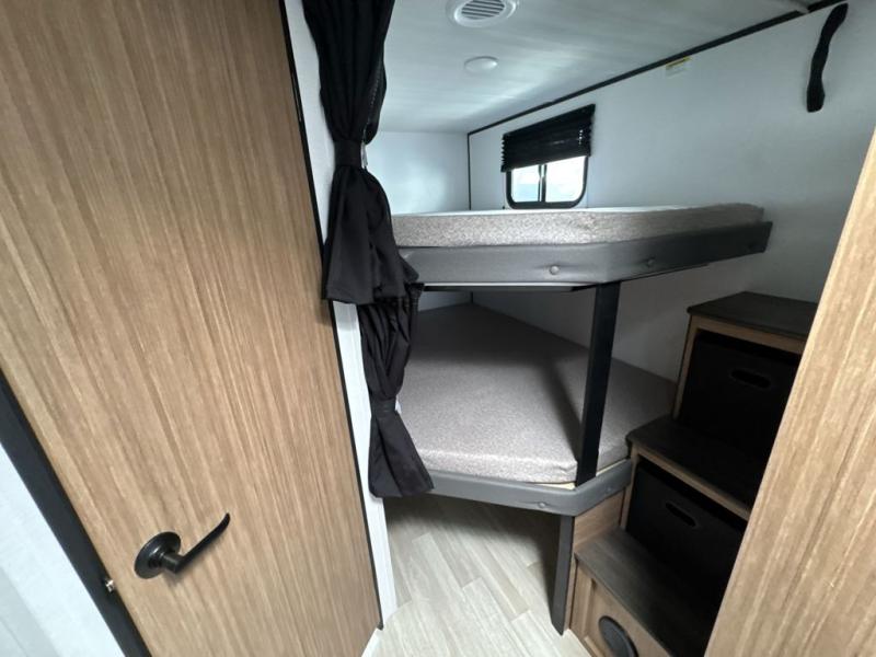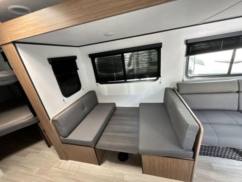 The double-size bunks in this spacious travel trailer make it family approved and perfect for camping with a larger group. You'll have your own private bedroom up front with a queen bed and dual bedside wardrobes, and there are sliding doors to the bedroom which help save space. The main living area and kitchen is made open thanks to the large slide out which houses the booth dinette and jack knife sofa. The fully equipped kitchen lets the chef of your group whip up their best meals, and the full bath with its own exterior entry door is sure to come in handy!