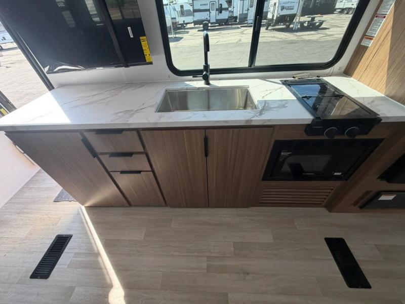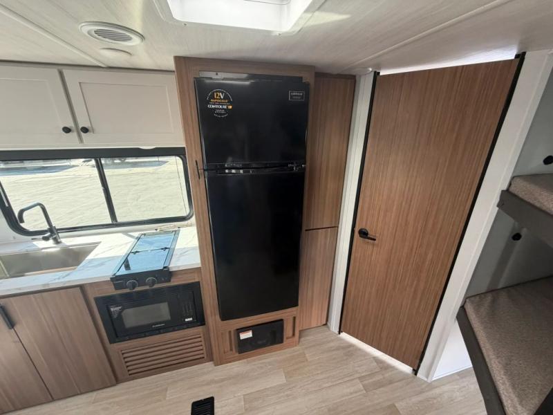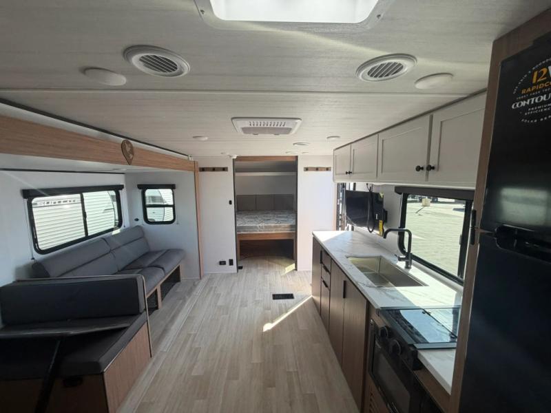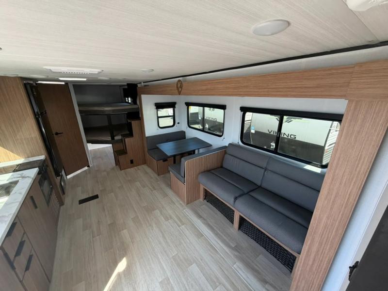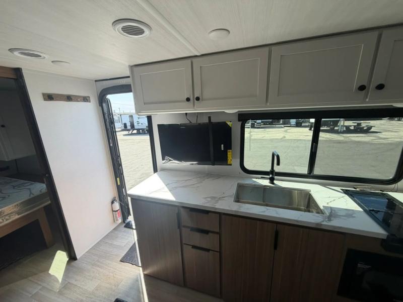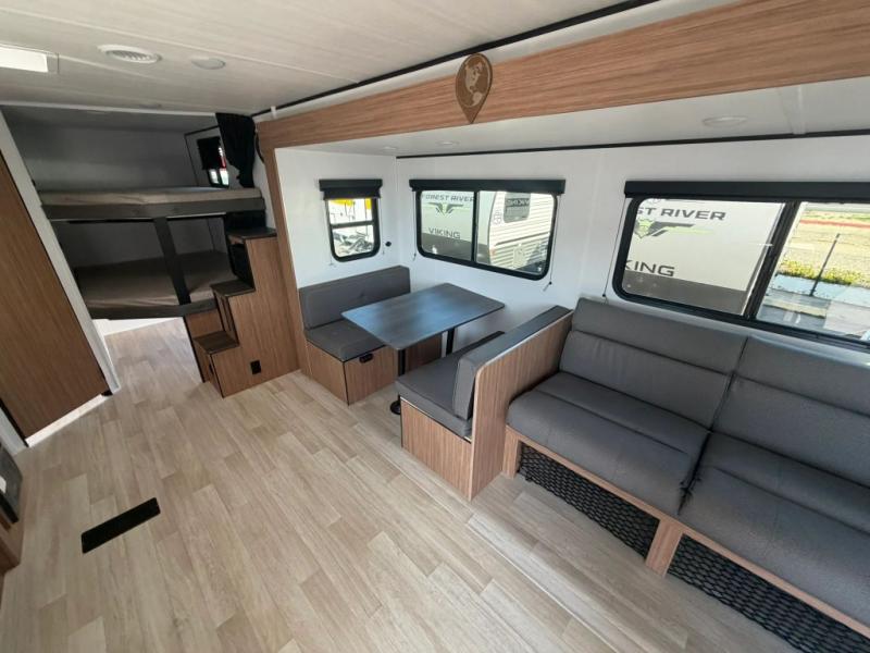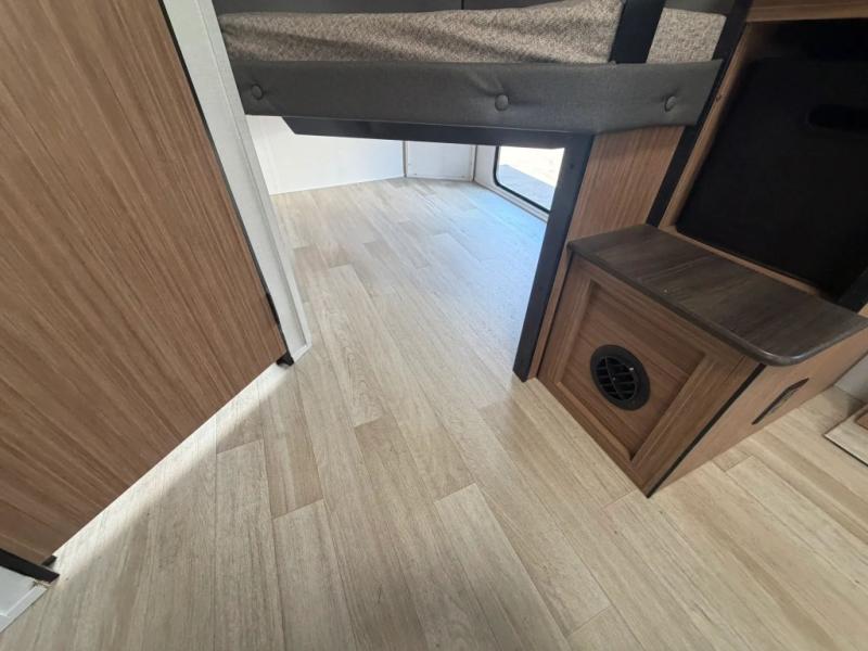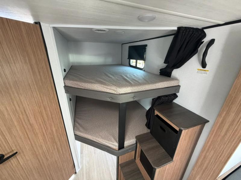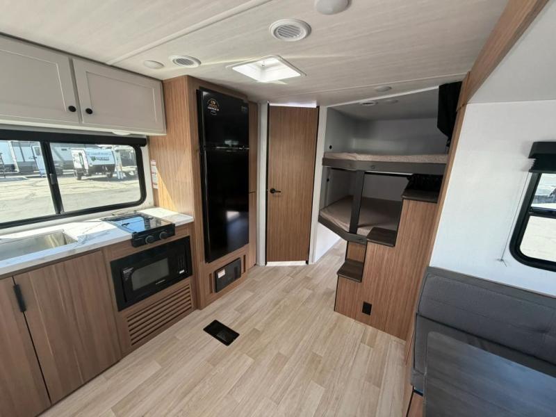 The double-size bunks in this spacious travel trailer make it family approved and perfect for camping with a larger group. You'll have your own private bedroom up front with a queen bed and dual bedside wardrobes, and there are sliding doors to the bedroom which help save space. The main living area and kitchen is made open thanks to the large slide out which houses the booth dinette and jack knife sofa. The fully equipped kitchen lets the chef of your group whip up their best meals, and the full bath with its own exterior entry door is sure to come in handy!